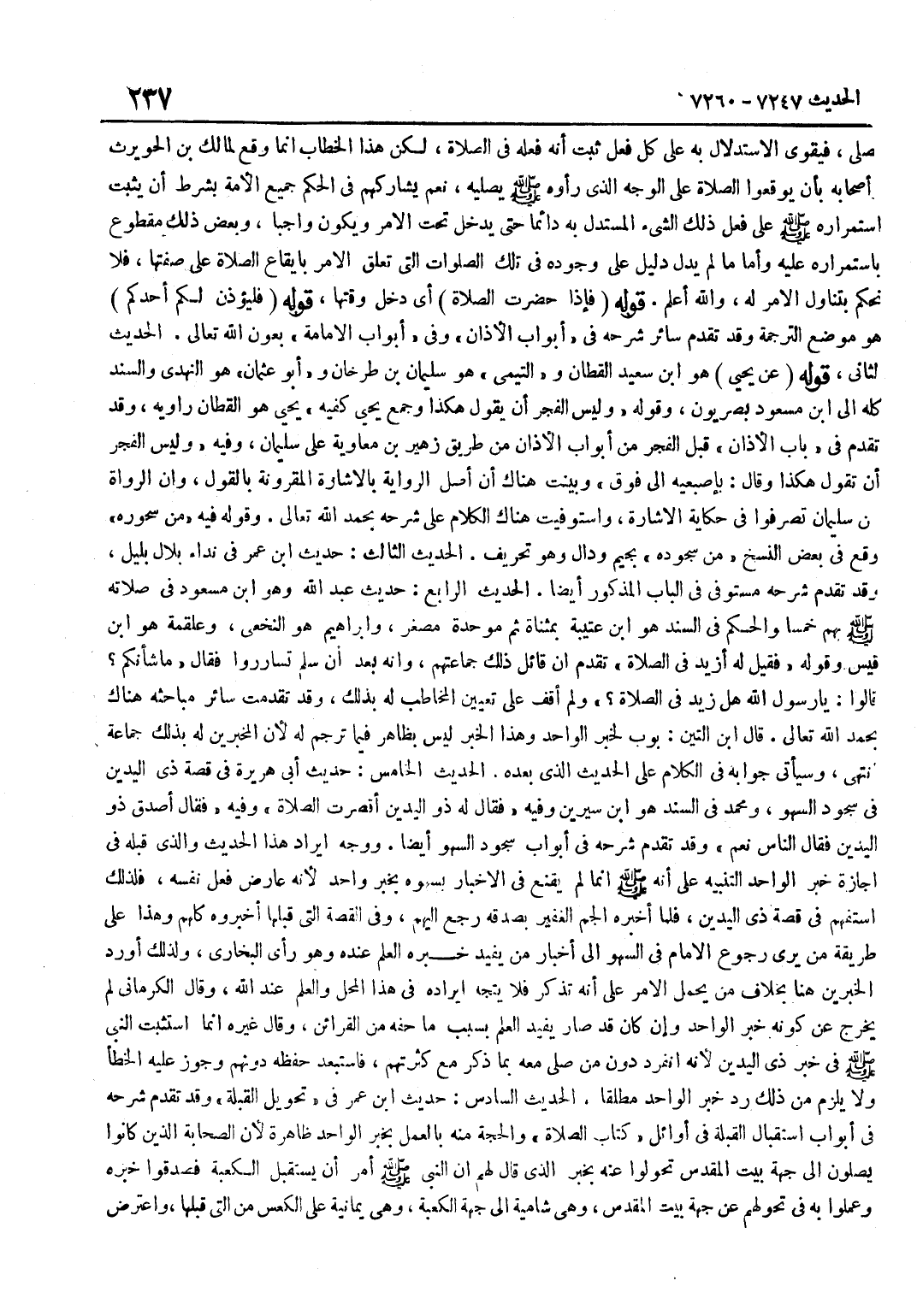 [7247] قَوْلُهُ عَن يحيى هُوَ بن سعيد الْقطَّان والتيمي هُوَ سُلَيْمَان بن طرخان وَأَبُو عُثْمَان هُوَ النَّهْدِيّ والسند كُله إِلَى بن مَسْعُودٍ بَصْرِيُّونَ وَقَوْلُهُ وَلَيْسَ الْفَجْرُ أَنْ يَقُولَ هَكَذَا وَجَمَعَ يَحْيَى كَفَّيْهِ يَحْيَى هُوَ الْقَطَّانُ رَاوِيهِ وَقَدْ تَقَدَّمَ فِي بَابِ الْأَذَانِ قَبْلَ الْفَجْرِ مِنْ أَبْوَابِ الْأَذَانِ مِنْ طَرِيقِ زُهَيْرِ بْنِ مُعَاوِيَةَ عَلَى سُلَيْمَانَ وَفِيهِ وَلَيْسَ الْفَجْرُ أَنْ تَقُولَ هَكَذَا وَقَالَ بِإِصْبَعَيْهِ إِلَى فَوْقٍ وَبَيَّنْتُ هُنَاكَ أَنَّ أَصْلَ الرِّوَايَةِ بِالْإِشَارَةِ الْمَقْرُونَةِ بِالْقَوْلِ وَأَنَّ الرُّوَاةَ عَنْ سُلَيْمَانَ تَصَرَّفُوا فِي حِكَايَةِ الْإِشَارَةِ وَاسْتَوْفَيْتُ هُنَاكَ الْكَلَامَ عَلَى شَرْحِهِ بِحَمْدِ اللَّهِ تَعَالَى وَقَوْلُهُ فِيهِ مِنْ سُحُورِهِ وَقَعَ فِي بَعْضِ النُّسَخِ مِنْ سُجُودِهِ بِجِيمٍ ودال وَهُوَ تَحْرِيف الحَدِيث الثَّالِث حَدِيث بن عُمَرَ فِي نِدَاءِ بِلَالٍ بِلَيْلٍ وَقَدْ تَقَدَّمَ شَرْحُهُ مُسْتَوْفًى فِي الْبَابِ الْمَذْكُورِ أَيْضًا الْحَدِيثُ الرَّابِع حَدِيث عبد الله وَهُوَ بن مَسْعُودٍ فِي صَلَاتِهِ صَلَّى اللَّهُ عَلَيْهِ وَسَلَّمَ بهم خمْسا وَالْحكم فِي السَّنَد هُوَ بن عُتَيْبَةَ بِمُثَنَّاةٍ ثُمَّ مُوَحَّدَةٍ مُصَغَّرٌ وَإِبْرَاهِيمُ هُوَ النَّخعِيّ وعلقمة هُوَ بن قَيْسٍ وَقَوْلُهُ فَقِيلَ لَهُ أَزِيدَ فِي الصَّلَاةِ تَقَدَّمَ أَنَّ قَائِلَ ذَلِكَ جَمَاعَتُهُمْ وَأَنَّهُ بَعْدَ أَنْ سَلَّمَ تَسَارَرُوا فَقَالَ مَا شَأْنُكُمْ قَالُوا يَا رَسُولَ اللَّهِ هَلْ زِيدَ فِي الصَّلَاةِ وَلَمْ أَقِفْ عَلَى تَعْيِينِ الْمُخَاطِبِ لَهُ بِذَلِكَ وَقَدْ تَقَدَّمَتْ سَائِرُ مَبَاحِثِهِ هُنَاكَ بِحَمْدِ اللَّهِ تَعَالَى قَالَ بن التِّينِ بَوَّبَ لِخَبَرِ الْوَاحِدِ وَهَذَا الْخَبَرُ لَيْسَ بِظَاهِرٍ فِيمَا تَرْجَمَ لَهُ لِأَنَّ الْمُخْبِرِينَ لَهُ بِذَلِكَ جَمَاعَةٌ انْتَهَى وَسَيَأْتِي جَوَابُهُ فِي الْكَلَامِ عَلَى الْحَدِيثِ الَّذِي بَعْدَهُ الْحَدِيثُ الْخَامِسُ حَدِيثِ أَبِي هُرَيْرَةَ فِي قِصَّةِ ذِي الْيَدَيْنِ فِي سُجُود السَّهْو وَمُحَمّد فِي السَّنَد هُوَ بن سِيرِينَ وَفِيهِ فَقَالَ لَهُ ذُو الْيَدَيْنِ أَقَصُرَتِ الصَّلَاةُ وَفِيهِ فَقَالَ أَصَدَقَ ذُو الْيَدَيْنِ فَقَالَ النَّاسُ نَعَمْ وَقَدْ تَقَدَّمَ شَرْحُهُ فِي أَبْوَابِ سُجُودِ السَّهْوِ أَيْضًا وَوَجْهُ إِيرَادِ هَذَا الْحَدِيثِ وَالَّذِي قَبْلَهُ فِي إِجَازَةِ خَبَرِ الْوَاحِدِ التَّنْبِيهُ عَلَى أَنَّهُ صَلَّى اللَّهُ عَلَيْهِ وَسَلَّمَ إِنَّمَا لَمْ يَقْنَعْ فِي الْإِخْبَارِ بِسَهْوِهِ بِخَبَرِ وَاحِدٍ لِأَنَّهُ عَارَضَ فِعْلَ نَفْسِهِ فَلِذَلِكَ اسْتَفْهَمَ فِي قِصَّةِ ذِي الْيَدَيْنِ فَلَمَّا أَخْبَرَهُ الْجَمُّ الْغَفِيرُ بِصِدْقِهِ رَجَعَ إِلَيْهِمْ وَفِي الْقِصَّةِ الَّتِي قَبْلَهَا أَخْبَرُوهُ كُلُّهُمْ وَهَذَا عَلَى طَرِيقَةِ مَنْ يَرَى رُجُوعَ الْإِمَامِ فِي السَّهْوِ إِلَى أَخْبَارِ مَنْ يُفِيدُ خَبَرُهُ الْعِلْمَ عِنْدَهُ وَهُوَ رَأْيُ الْبُخَارِيِّ وَلِذَلِكَ أَوْرَدَ الْخَبَرَيْنِ هُنَا بِخِلَافِ مَنْ يَحْمِلُ الْأَمْرَ عَلَى أَنَّهُ تَذَكَّرَ فَلَا يَتَّجِهُ إِيرَادُهُ فِي هَذَا الْمَحَلِّ وَالْعِلْمُ عِنْدَ اللَّهِ وَقَالَ الْكِرْمَانِيُّ لَمْ يَخْرُجْ عَنْ كَوْنِهِ خَبَرَ الْوَاحِدِ وَإِنْ كَانَ قَدْ صَارَ يُفِيدُ الْعِلْمَ بِسَبَبِ مَا حَفَّهُ مِنَ الْقَرَائِنِ وَقَالَ غَيْرُهُ إِنَّمَا اسْتَثْبَتَ النَّبِيُّ صَلَّى اللَّهُ عَلَيْهِ وَسَلَّمَ فِي خَبَرِ ذِي الْيَدَيْنِ لِأَنَّهُ انْفَرَدَ دُونَ مَنْ صَلَّى مَعَهُ بِمَا ذُكِرَ مَعَ كَث