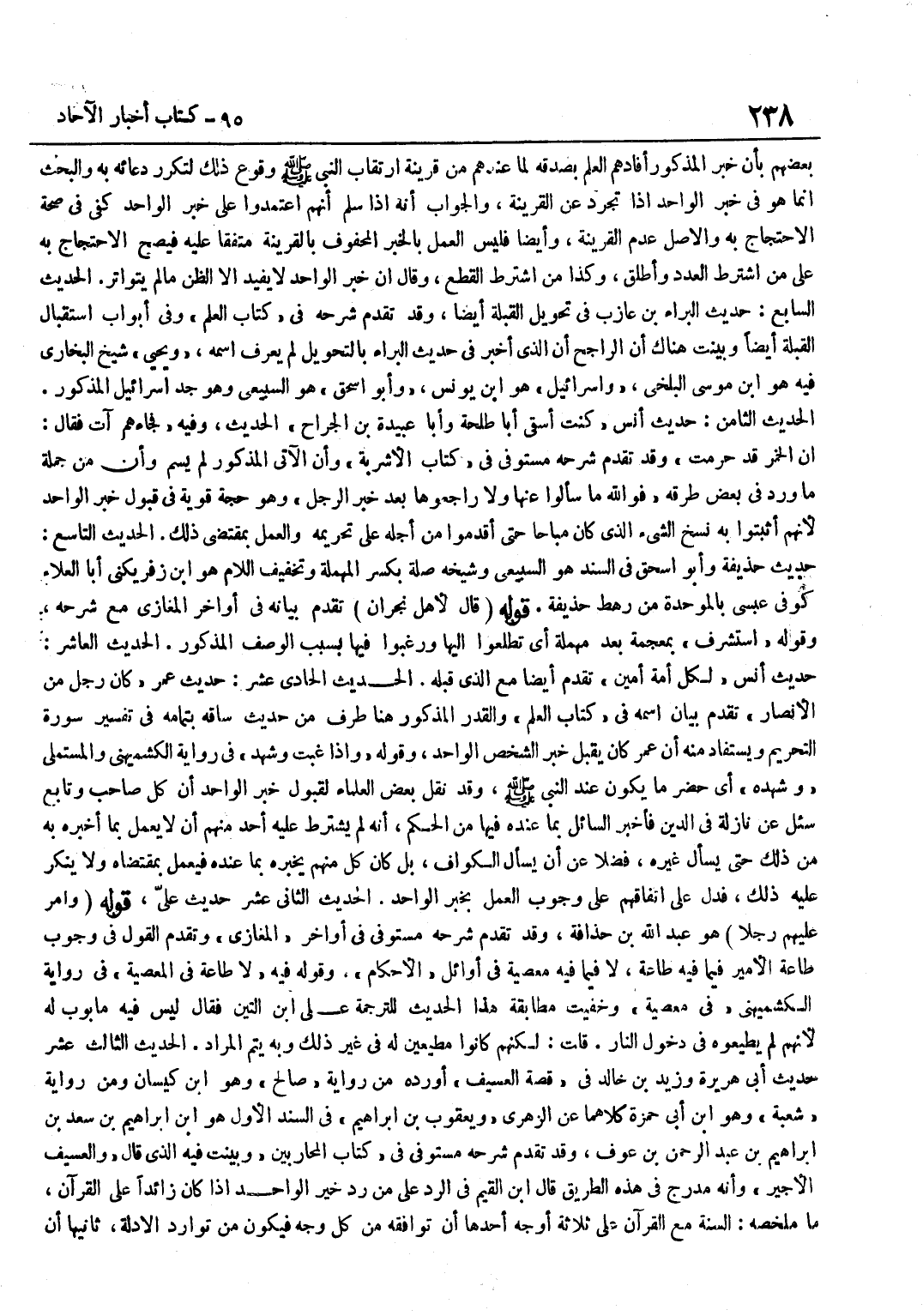 بَعْضُهُمْ بِأَنَّ خَبَرَ الْمَذْكُورِ أَفَادَهُمُ الْعِلْمَ بِصِدْقِهِ لِمَا عِنْدَهُمْ مِنْ قَرِينَةِ ارْتِقَابِ النَّبِيِّ صَلَّى اللَّهُ عَلَيْهِ وَسَلَّمَ وُقُوعَ ذَلِكَ لِتَكَرُّرِ دُعَائِهِ بِهِ وَالْبَحْثُ إِنَّمَا هُوَ فِي خَبَرِ الْوَاحِدِ إِذَا تَجَرَّدَ عَنِ الْقَرِينَةِ وَالْجَوَابُ أَنَّهُ إِذَا سُلِّمَ أَنَّهُمُ اعْتَمَدُوا عَلَى خَبَرِ الْوَاحِدِ كَفَى فِي صِحَّةِ الِاحْتِجَاجِ بِهِ وَالْأَصْلُ عَدَمُ الْقَرِينَةِ وَأَيْضًا فَلَيْسَ الْعَمَلُ بِالْخَبَرِ الْمَحْفُوفِ بِالْقَرِينَةِ مُتَّفَقًا عَلَيْهِ فَيَصِحُّ الِاحْتِجَاجُ بِهِ عَلَى مَنِ اشْتَرَطَ الْعَدَدَ وَأَطْلَقَ وَكَذَا مَنِ اشْتَرَطَ الْقَطْعَ وَقَالَ إِنَّ خَبَرَ الْوَاحِدِ لَا يُفِيدُ إِلَّا الظَّنَّ مَا لَمْ يَتَوَاتَرْ الْحَدِيثُ السَّابِعُ حَدِيثُ الْبَرَاءِ بْنِ عَازِبٍ فِي تَحْوِيلِ الْقِبْلَةِ أَيْضًا وَقَدْ تَقَدَّمَ شَرْحُهُ فِي كِتَابِ الْعِلْمِ وَفِي أَبْوَابِ اسْتِقْبَالِ الْقِبْلَةِ أَيْضًا وَبَيَّنْتُ هُنَاكَ أَنَّ الرَّاجِحَ أَنَّ الَّذِي أَخْبَرَ فِي حَدِيثِ الْبَرَاءِ بِالتَّحْوِيلِ لَمْ يُعْرَفِ اسْمُهُ وَيَحْيَى شَيْخُ الْبُخَارِيِّ فِيهِ هُوَ بن مُوسَى الْبَلْخِي وَإِسْرَائِيل هُوَ بن يُونُسَ وَأَبُو إِسْحَاقَ هُوَ السَّبِيعِيُّ وَهُوَ جَدُّ إِسْرَائِيلَ الْمَذْكُورِ الْحَدِيثُ الثَّامِنُ حَدِيثُ أَنَسٍ كُنْتُ أَسْقِي أَبَا طَلْحَةَ وَأَبَا عُبَيْدَةَ بْنَ الْجَرَّاحِ الْحَدِيثَ وَفِيهِ فَجَاءَهُمْ آتٍ فَقَالَ إِنَّ الْخَمْرَ قَدْ حُرِّمَتْ وَقَدْ تَقَدَّمَ شَرْحُهُ مُسْتَوْفًى فِي كِتَابِ الْأَشْرِبَةِ وَأَنَّ الْآتِيَ الْمَذْكُورَ لَمْ يُسَمَّ وَأَنَّ مِنْ جُمْلَةِ مَا وَرَدَ فِي بَعْضِ طُرُقِهِ فَوَاللَّهِ مَا سَأَلُوا عَنْهَا وَلَا رَاجَعُوهَا بَعْدَ خَبَرِ الرَّجُلِ وَهُوَ حُجَّةٌ قَوِيَّةٌ فِي قَبُولِ خَبَرِ الْوَاحِدِ لِأَنَّهُمْ أَثْبَتُوا بِهِ نَسْخَ الشَّيْءِ الَّذِي كَانَ مُبَاحًا حَتَّى أَقْدَمُوا مِنْ أَجْلِهِ عَلَى تَحْرِيمِهِ وَالْعَمَلِ بِمُقْتَضَى ذَلِكَ الْحَدِيثُ التَّاسِعُ حَدِيثُ حُذَيْفَةَ وَأَبُو إِسْحَاقَ فِي السَّنَدِ هُوَ السَّبِيعِيُّ وَشَيْخُهُ صِلَةُ بِكَسْرِ الْمُهْمَلَةِ وَتَخْفِيفِ اللَّام هُوَ بن زُفَرَ يُكْنَى أَبَا الْعَلَاءِ كُوفِيٌّ عَبْسِيٌّ بِالْمُوَحَّدَةِ مِنْ رَهْطِ حُذَيْفَةَ
