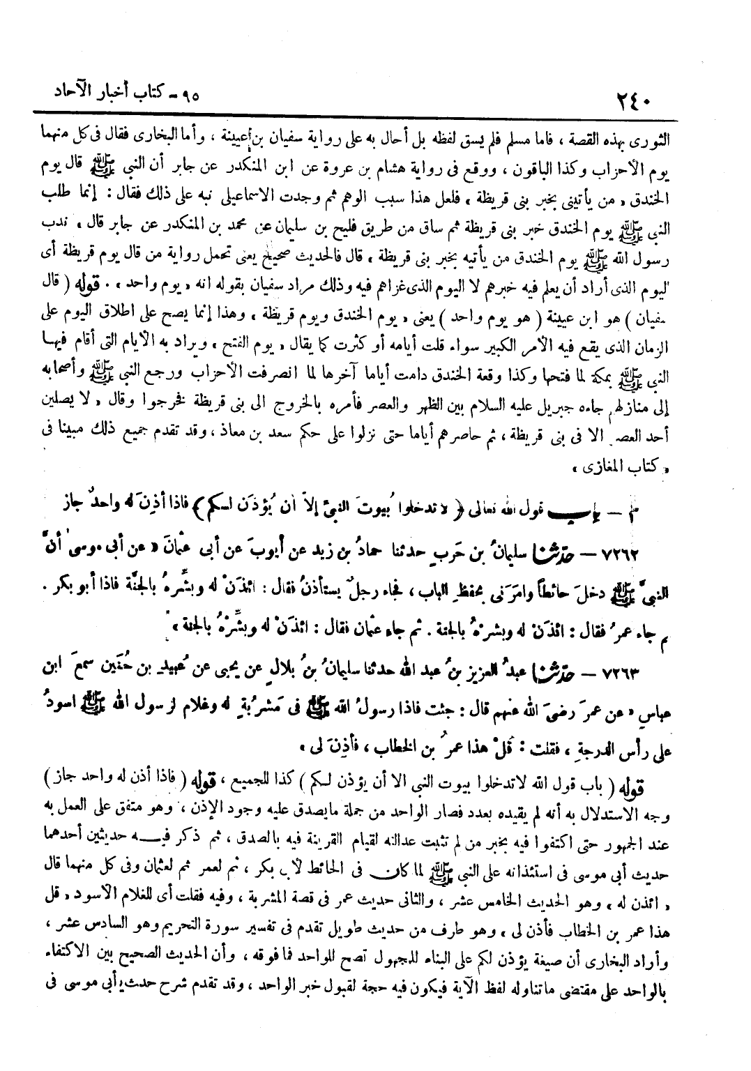 كَذَا لِلْجَمِيعِ قَوْلُهُ فَإِذَا أَذِنَ لَهُ وَاحِدٌ جَازَ وَجْهُ الِاسْتِدْلَالِ بِهِ أَنَّهُ لَمْ يُقَيِّدْهُ بِعَدَدٍ فَصَارَ الْوَاحِدُ مِنْ جُمْلَةِ مَا يَصْدُقُ عَلَيْهِ وُجُودُ الْإِذْنِ وَهُوَ مُتَّفَقٌ عَلَى الْعَمَلِ بِهِ عِنْدَ الْجُمْهُورِ حَتَّى اكْتَفَوْا فِيهِ بِخَبَرِ مَنْ لَمْ تَثْبُتْ عَدَالَتُهُ لِقِيَامِ الْقَرِينَةِ فِيهِ بِالصِّدْقِ ثُمَّ ذَكَرَ فِيهِ حَدِيثَيْنِ أَحَدُهُمَا حَدِيثُ أَبِي مُوسَى فِي اسْتِئْذَانِهِ عَلَى النَّبِيُّ صَلَّى اللَّهُ عَلَيْهِ وَسَلَّمَ لَمَّا كَانَ فِي الْحَائِطِ لِأَبِي بَكْرٍ ثُمَّ لِعُمَرَ ثُمَّ لِعُثْمَانَ وَفِي كُلٍّ مِنْهُمَا قَالَ ائْذَنْ لَهُ وَهُوَ الْحَدِيثُ الْخَامِسَ عَشَرَ وَالثَّانِي حَدِيثُ عُمَرَ فِي قِصَّةِ الْمَشْرُبَةِ وَفِيهِ فَقُلْتُ أَيْ لِلْغُلَامِ الْأَسْوَدِ قُلْ هَذَا عُمَرُ بْنُ الْخَطَّابِ فَأَذِنَ لِي وَهُوَ طَرَفٌ مِنْ حَدِيثٍ طَوِيلٍ تَقَدَّمَ فِي تَفْسِيرِ سُورَةِ التَّحْرِيمِ وَهُوَ السَّادِسَ عَشَرَ وَأَرَادَ الْبُخَارِيُّ أَنَّ صِيغَةَ يُؤْذَنَ لَكُمْ عَلَى الْبِنَاءِ لِلْمَجْهُولِ تَصِحُّ لِلْوَاحِدِ فَمَا فَوْقَهُ وَأَنَّ الْحَدِيثَ الصَّحِيحَ بَيَّنَ الِاكْتِفَاءِ بِالْوَاحِدِ عَلَى مُقْتَضَى مَا تَنَاوَلَهُ لَفْظُ الْآيَةِ فَيَكُونُ فِيهِ حُجَّةٌ لِقَبُولِ خَبَرِ الْوَاحِدِ وَقَدْ تَقَدَّمَ شَرْحُ حَدِيثِ أَبِي مُوسَى فِي