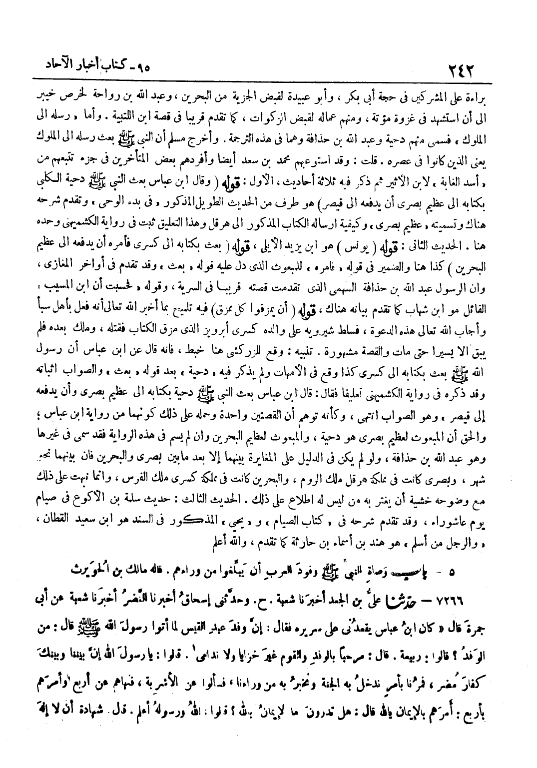 [7264] قَوْلُهُ يُونُس هُوَ بن يَزِيدَ الْأَيْلِيُّ قَوْلُهُ بَعَثَ بِكِتَابِهِ إِلَى كِسْرَى فَأَمَرَهُ أَنْ يَدْفَعَهُ إِلَى عَظِيمِ الْبَحْرَيْنِ كَذَا هُنَا وَالضَّمِيرُ فِي قَوْلِهِ فَأَمَرَهُ لِلْمَبْعُوثِ الَّذِي دَلَّ عَلَيْهِ قَوْلُهُ بَعَثَ وَقَدْ تَقَدَّمَ فِي أَوَاخِرِ الْمَغَازِي وَإِنَّ الرَّسُولَ عَبْدُ اللَّهِ بْنُ حُذَافَةَ السَّهْمِيُّ الَّذِي تَقَدَّمَتْ قِصَّتُهُ قَرِيبًا فِي السّريَّة وَقَوله فحسبت ان بن الْمسيب الْقَائِل هُوَ بن شِهَابٍ كَمَا تَقَدَّمَ بَيَانُهُ هُنَاكَ قَوْلُهُ أَنْ يُمَزَّقُوا كُلَّ مُمَزَّقٍ فِيهِ تَلْمِيحٌ بِمَا أَخْبَرَ اللَّهُ تَعَالَى أَنَّهُ فَعَلَ بِأَهْلِ سَبَأٍ وَأَجَابَ اللَّهُ تَعَالَى هَذِهِ الدَّعْوَةَ فَسَلَّطَ شِيرَوَيْهِ عَلَى وَالِدِهِ كِسْرَى أَبْرَوَيْزَ الَّذِي مَزَّقَ الْكِتَابَ فَقَتَلَهُ وَمَلَكَ بَعْدَهُ فَلَمْ يَبْقَ إِلَّا يَسِيرًا حَتَّى مَاتَ وَالْقِصَّةُ مَشْهُورَةٌ تَنْبِيهٌ وَقَعَ لِلزَّرْكَشِيِّ هُنَا خبط فَإِنَّهُ قَالَ عَن بن عَبَّاسٍ أَنَّ رَسُولَ اللَّهِ صَلَّى اللَّهُ عَلَيْهِ وَسَلَّمَ بَعَثَ بِكِتَابِهِ إِلَى كِسْرَى كَذَا وَقَعَ فِي الْأُمَّهَاتِ وَلَمْ يَذْكُرْ فِيهِ دِحْيَةَ بَعْدَ قَوْلِهِ بَعَثَ وَالصَّوَابُ إِثْبَاتُهُ وَقَدْ ذَكَرَهُ فِي رِوَايَة الْكشميهني تَعْلِيقا فَقَالَ قَالَ بن عَبَّاسٍ بَعَثَ النَّبِيُّ صَلَّى اللَّهُ عَلَيْهِ وَسَلَّمَ دحْيَة بكتابه إِلَى عَظِيم بصرى وان يَدْفَعَهُ إِلَى قَيْصَرَ وَهُوَ الصَّوَابُ انْتَهَى وَكَأَنَّهُ تَوَهَّمَ أَنَّ الْقِصَّتَيْنِ وَاحِدَةٌ وَحَمَلَهُ عَلَى ذَلِكَ كَونهمَا من رِوَايَة بن عَبَّاسٍ وَالْحَقُّ أَنَّ الْمَبْعُوثَ لِعَظِيمِ بُصْرَى هُوَ دِحْيَةُ وَالْمَبْعُوثُ لِعَظِيمِ الْبَحْرَيْنِ وَإِنْ لَمْ يُسَمَّ فِي هَذِهِ الرِّوَايَةِ فَقَدْ سُمِّيَ فِي غَيْرِهَا وَهُوَ عَبْدُ اللَّهِ بْنُ حُذَافَةَ وَلَوْ لَمْ يَكُنْ فِي الدَّلِيلِ عَلَى الْمُغَايَرَةِ بَيْنَهُمَا إِلَّا بُعْدَ مَا بَيْنَ بُصْرَى وَالْبَحْرَيْنِ فَإِنَّ بَيْنَهُمَا نَحْوُ شَهْرٍ وَبُصْرَى كَانَتْ فِي مَمْلَكَةِ هِرَقْلَ مَلِكِ الرُّومِ وَالْبَحْرَيْنِ كَانَتْ فِي مَمْلَكَةِ كِسْرَى مَلِكِ الْفُرْسِ وَإِنَّمَا نَبَّهْتُ عَلَى ذَلِكَ مَعَ وُضُوحِهِ خَشْيَةَ أَنْ يَغْتَرَّ بِهِ مَنْ لَيْسَ لَهُ اطِّلَاعٌ عَلَى ذَلِكَ الْحَدِيثُ الثَّالِثُ حَدِيثُ سَلَمَةَ بْنِ الْأَكْوَعِ فِي صِيَامِ يَوْمِ عَاشُورَاءَ وَقد تقدم شَرحه فِي كتاب الصّيام وَيحيى الْمَذْكُور فِي السَّنَد هُوَ بن سَعِيدٍ الْقَطَّانُ وَالرَّجُلُ مِنْ أَسْلَمَ هُوَ هِنْدُ بْنُ أَسْمَاءَ بْنِ حَارِثَةَ كَمَا تَقَدَّمَ وَاللَّهُ أعلم