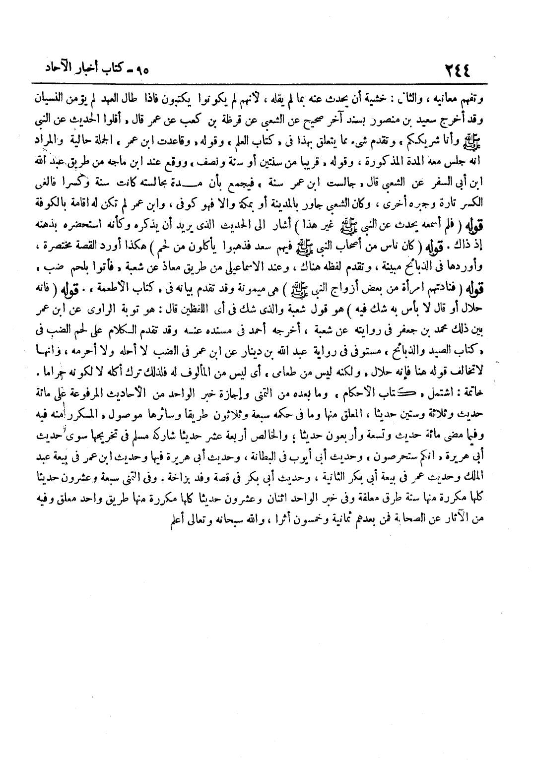 وَتَفَهُّمِ مَعَانِيهِ وَالثَّانِي خَشْيَةَ أَنْ يُحَدِّثَ عَنْهُ بِمَا لَمْ يَقُلْهُ لِأَنَّهُمْ لَمْ يَكُونُوا يَكْتُبُونَ فَإِذَا طَالَ الْعَهْدُ لَمْ يُؤْمَنِ النِّسْيَانُ وَقَدْ أَخْرَجَ سَعِيدُ بْنُ مَنْصُورٍ بِسَنَدٍ آخَرَ صَحِيحٍ عَنِ الشَّعْبِيِّ عَنْ قَرَظَةَ بْنِ كَعْبٍ عَنْ عُمَرٍ قَالَ أَقِلُّوا الْحَدِيثَ عَنِ النَّبِيِّ صَلَّى اللَّهُ عَلَيْهِ وَسَلَّمَ وَأَنَا شَرِيكُكُمْ وَتَقَدَّمَ شَيْءٌ مِمَّا يَتَعَلَّقُ بِهَذَا فِي كِتَابِ الْعِلْمِ وَقَوْلُهُ وقاعدت بن عُمَرَ الْجُمْلَةُ حَالِيَّةٌ وَالْمُرَادُ أَنَّهُ جَلَسَ مَعَهُ الْمُدَّةَ الْمَذْكُورَةَ وَقَوْلُهُ قَرِيبًا مِنْ سَنَتَيْنِ أَوْ سنة وَنصف وَوَقع عِنْد بن مَاجَهْ مِنْ طَرِيقِ عَبْدُ اللَّهِ بْنُ أَبِي السَّفَرِ عَنْ الشَّعْبِيِّ قَالَ جالست بن عُمَرَ سَنَةً فَيُجْمَعُ بِأَنَّ مُدَّةَ مُجَالَسَتِهِ كَانَتْ سَنَةً وَكَسْرًا فَأَلْغَى الْكَسْرُ تَارَةً وَجَبَرَهُ أُخْرَى وَكَانَ الشَّعْبِيُّ جَاوَرَ بِالْمَدِينَةِ أَوْ بِمَكَّةَ وَإِلَّا فَهُوَ كُوفِي وبن عُمَرَ لَمْ تَكُنْ لَهُ إِقَامَةٌ بِالْكُوفَةِ قَوْلُهُ فَلَمْ أَسْمَعْهُ يُحَدِّثُ عَنِ النَّبِيِّ صَلَّى اللَّهُ عَلَيْهِ وَسَلَّمَ غَيْرُ هَذَا أَشَارَ إِلَى الْحَدِيثِ الَّذِي يُرِيدُ أَنْ يَذْكُرَهُ وَكَأَنَّهُ اسْتَحْضَرَهُ بِذِهْنِهِ إِذْ ذَاكَ قَوْلُهُ كَانَ نَاسٌ مِنْ أَصْحَابِ النَّبِيِّ صَلَّى اللَّهُ عَلَيْهِ وَسَلَّمَ فِيهِمْ سَعْدٌ فَذَهَبُوا يَأْكُلُونَ مِنْ لَحْمٍ هَكَذَا أَوْرَدَ الْقِصَّةَ مُخْتَصَرَةً وَأَوْرَدَهَا فِي الذَّبَائِحِ مُبَيَّنَةً وَتَقَدَّمَ لَفْظُهُ هُنَاكَ وَعِنْدَ الْإِسْمَاعِيلِيِّ مِنْ طَرِيقِ مُعَاذٍ عَنْ شُعْبَةَ فَأَتَوْا بِلَحْمِ ضَبٍّ قَوْلُهُ فَنَادَتْهُمُ امْرَأَةٌ مِنْ بَعْضِ أَزْوَاجِ النَّبِيِّ صَلَّى اللَّهُ عَلَيْهِ وَسَلَّمَ هِيَ مَيْمُونَةُ وَقَدْ تَقَدَّمَ بَيَانُهُ فِي كِتَابِ الْأَطْعِمَةِ قَوْلُهُ فَإِنَّهُ حَلَالٌ أَوْ قَالَ لَا بَأْسَ بِهِ شَكَّ فِيهِ هُوَ قَوْلُ شُعْبَةَ وَالَّذِي شَكَّ فِي أَيِّ اللَّفْظَيْنِ قَالَ هُوَ تَوْبَة الرَّاوِي عَن بن عُمَرَ بَيَّنَ ذَلِكَ مُحَمَّدُ بْنُ جَعْفَرٍ فِي رِوَايَتِهِ عَنْ شُعْبَةَ أَخْرَجَهُ أَحْمَدُ فِي مُسْنَدِهِ عَنْهُ وَقَدْ تَقَدَّمَ الْكَلَامُ عَلَى لَحْمِ الضَّبِّ فِي كِتَابِ الصَّيْدِ وَالذَّبَائِحِ مُسْتَوْفًى فِي رِوَايَةِ عَبْدِ اللَّهِ بْنِ دِينَارٍ عَنِ بن عُمَرَ فِي الضَّبِّ لَا أُحِلُّهُ وَلَا أُحَرِّمُهُ وَأَنَّهَا لَا تُخَالِفُ قَوْلَهُ هُنَا فَإِنَّهُ حَلَالٌ وَلَكِنَّهُ لَيْسَ مِنْ طَعَامِي أَيْ لَيْسَ مِنَ الْمَأْلُوفِ لَهُ فَلِذَلِكَ تَرَكَ أَكْلَهُ لَا لِكَوْنِهِ حَرَامًا خَاتِمَةٌ اشْتَمَلَ كِتَابُ الْأَحْكَامِ وَمَا بَعْدَهُ مِنَ التَّمَنِّي وَإِجَازَةِ خَبَرِ الْوَاحِدِ مِنَ الْأَحَادِيثِ الْمَرْفُوعَةِ عَلَى مِائَةِ حَدِيثٍ وَثَلَاثَةِ وَسِتِّينَ حَدِيثًا الْمُعَلَّقُ مِنْهَا وَمَا فِي حُكْمِهِ سَبْعَةٌ وَثَلَاثُونَ طَرِيقًا وَسَائِرُهَا مَوْصُولٌ الْمُكَرَّرُ مِنْهُ فِيهِ وَفِيمَا مَضَى مِائَةٌ حَدِيثٍ وَتِسْعَةٌ وَأَرْبَعُونَ حَدِيثًا وَالْخَالِصُ أَرْبَعَةَ عَشَرَ حَدِيثًا شَارَكَهُ مُسْلِمٌ فِي تَخْرِيجِهَا سِوَى حَدِيثِ أَبِي هُرَيْرَةَ إِنَّكُمْ سَتَحْرِصُونَ وَحَدِيثِ أَبِي أَيُّوبَ فِي الْبِطَانَةِ وَحَدِيثِ أَبِي هُرَيْرَةَ فِيهَا وَحَدِيث بن عُمَرَ فِي بَيْعَةِ عَبْدِ الْمَلِكِ وَحَدِيثِ عُمَرَ فِي بَيْعَةِ أَبِي بَكْرٍ الثَّانِيَةِ وَحَدِيثِ أَبِي بَكْرٍ فِي قِصَّةِ وَفْدِ بُزَاخَةَ وَفِي التَّمَنِّي سَبْعَةٌ وَعِشْرُونَ حَدِيثًا كُلُّهَا مُكَرَّرَةٌ مِنْهَا سِتَّةُ طُرُقٍ مُع