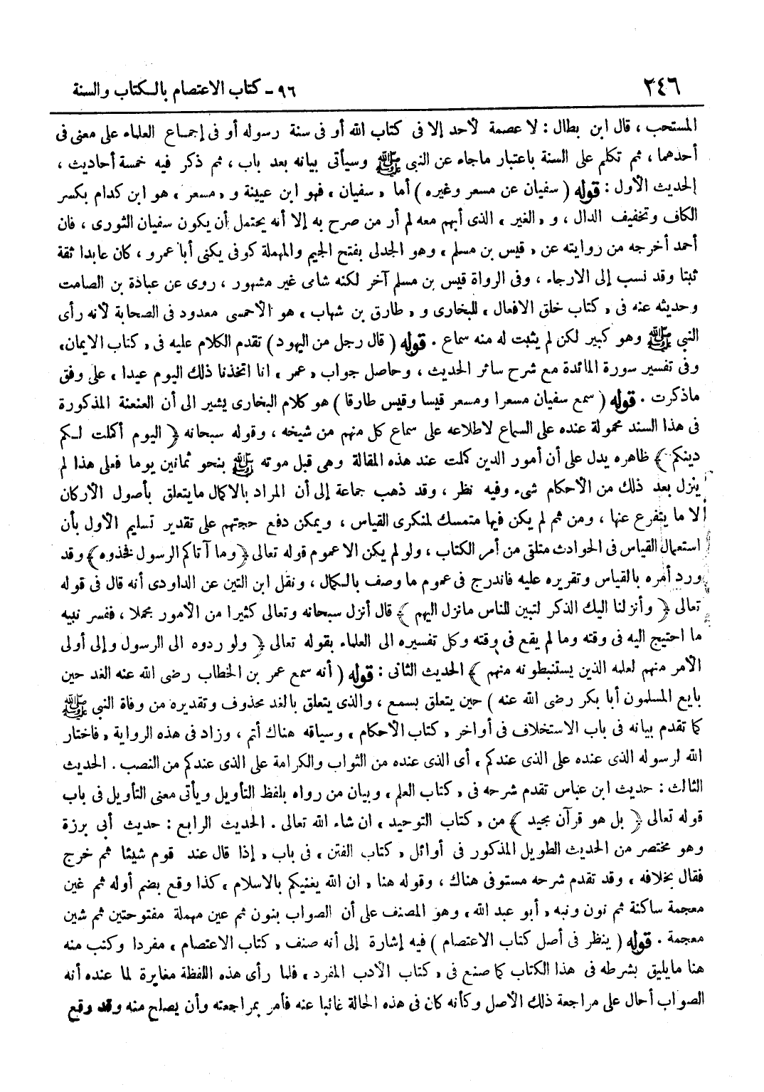 الْمُسْتَحبّ قَالَ بن بَطَّالٍ لَا عِصْمَةَ لِأَحَدٍ إِلَّا فِي كِتَابِ اللَّهِ أَوْ فِي سُنَّةِ رَسُولِهِ أَوْ فِي إِجْمَاعِ الْعُلَمَاءِ عَلَى مَعْنًى فِي أَحَدِهِمَا ثُمَّ تَكَلَّمَ عَلَى السُّنَّةِ بِاعْتِبَارِ مَا جَاءَ عَنِ النَّبِيِّ صَلَّى اللَّهُ عَلَيْهِ وَسَلَّمَ وَسَيَأْتِي بَيَانُهُ بَعْدَ بَابٍ ثُمَّ ذَكَرَ فِيهِ خَمْسَةَ أَحَادِيثَ الْحَدِيثُ الْأَوَّلُ