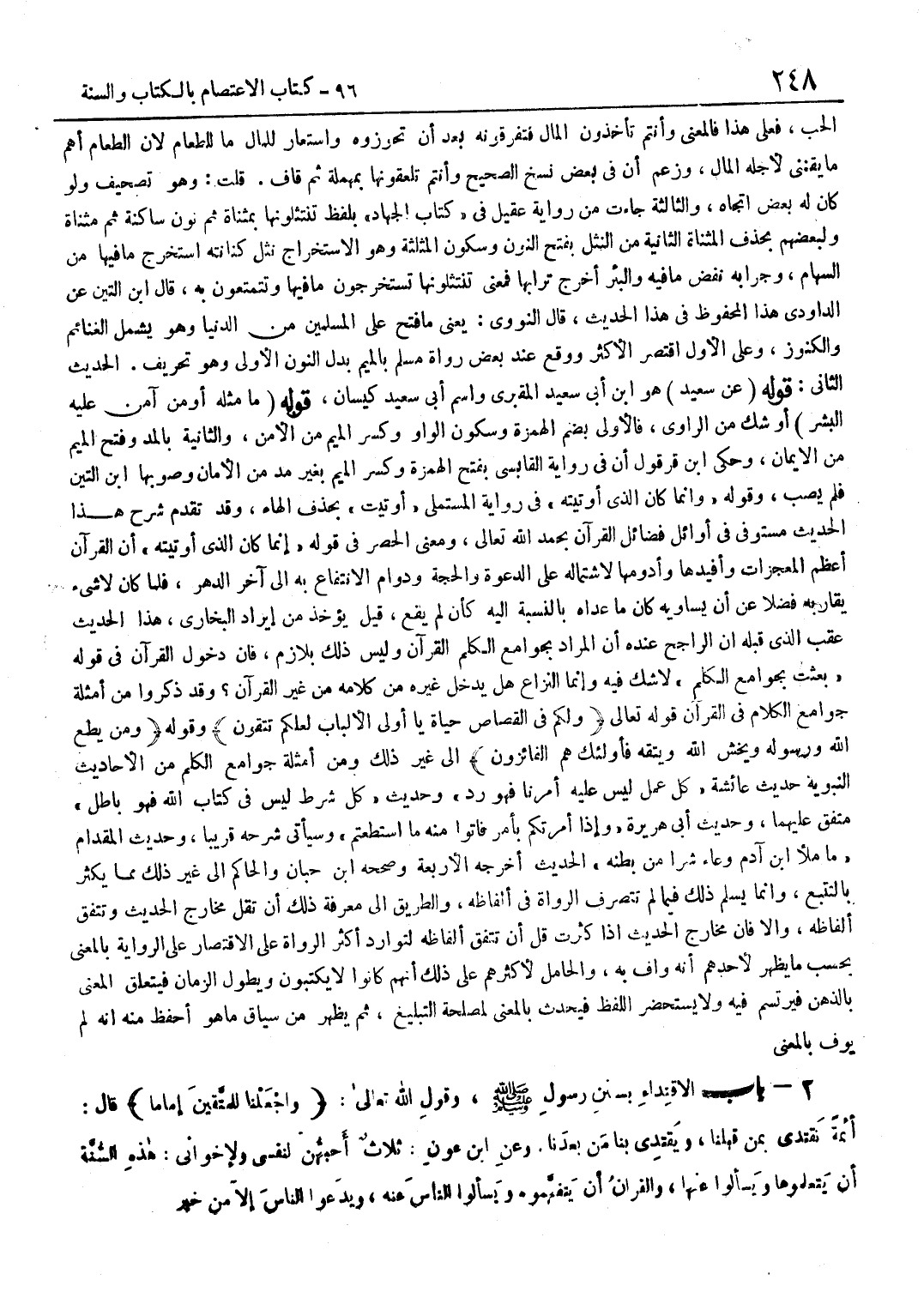 [7274] قَوْله عَن سعيد هُوَ بن أَبِي سَعِيدٍ الْمَقْبُرِيُّ وَاسْمُ أَبِي سَعِيدٍ كَيْسَانُ قَوْلُهُ مَا مِثْلُهُ أُومِنَ أَوْ آمَنَ عَلَيْهِ الْبَشَرُ أَوْ شَكٌّ مِنَ الرَّاوِي فَالْأُولَى بِضَمِّ الْهَمْزَةِ وَسُكُونِ الْوَاوِ وَكَسْرِ الْمِيمِ مِنَ الْأَمْنِ وَالثَّانِيَةُ بِالْمَدِّ وَفَتْحِ الْمِيمِ مِنَ الْإِيمَانِ وَحَكَى بن قَرْقُولٍ أَنَّ فِي رِوَايَةِ الْقَابِسِيِّ بِفَتْحِ الْهَمْزَةِ وَكَسْرِ الْمِيمِ بِغَيْرِ مَدٍّ مِنَ الْأَمَانِ وَصَوَّبَهَا بن التِّينِ فَلَمْ يُصِبْ وَقَوْلُهُ وَإِنَّمَا كَانَ الَّذِي أُوتِيتُهُ فِي رِوَايَةِ الْمُسْتَمْلِي أُوتِيتُ بِحَذْفِ الْهَاءِ وَقَدْ تَقَدَّمَ شَرْحُ هَذَا الْحَدِيثِ مُسْتَوْفًى فِي أَوَائِلِ فَضَائِلِ الْقُرْآنِ بِحَمْدِ اللَّهِ تَعَالَى وَمَعْنَى الْحَصْرِ فِي قَوْلِهِ إِنَّمَا كَانَ الَّذِي أُوتِيتُهُ أَنَّ الْقُرْآنَ أَعْظَمُ الْمُعْجِزَاتِ وَأَفْيَدُهَا وَأَدْوَمُهَا لِاشْتِمَالِهِ عَلَى الدَّعْوَةِ وَالْحُجَّةِ وَدَوَامِ الِانْتِفَاعِ بِهِ إِلَى آخِرِ الدَّهْرِ فَلَمَّا كَانَ لَا شَيْءَ يُقَارِبُهُ فَضْلًا عَنْ أَنْ يُسَاوِيَهُ كَانَ مَا عَدَاهُ بِالنِّسْبَةِ إِلَيْهِ كَأَنْ لَمْ يَقَعْ قِيلَ يُؤْخَذُ مِنْ إِيرَادِ الْبُخَارِيِّ هَذَا الْحَدِيثِ عَقِبَ الَّذِي قَبْلَهُ أَنَّ الرَّاجِحَ عِنْدَهُ أَنَّ الْمُرَادَ بِجَوَامِعِ الْكَلِمِ الْقُرْآنُ وَلَيْسَ ذَلِكَ بِلَازِمٍ فَإِنَّ دُخُولَ الْقُرْآنِ فِي قَوْلِهِ بُعِثْتُ بِجَوَامِعِ الْكَلِمِ لَا شَكَّ فِيهِ وَإِنَّمَا النِّزَاعُ هَلْ يَدْخُلُ غَيْرُهُ مِنْ كَلَامِهِ مِنْ غَيْرِ الْقُرْآنِ وَقَدْ ذَكَرُوا مِنْ أَمْثِلَةِ جَوَامِعِ الْكَلَامِ فِي الْقُرْآنِ قَوْلَهُ تَعَالَى وَلَكُمْ فِي الْقِصَاصِ حَيَاةٌ يَا أُولِي الْأَلْبَاب لَعَلَّكُمْ تَتَّقُون وَقَوْلَهُ وَمَنْ يُطِعِ اللَّهَ وَرَسُولَهُ وَيَخْشَ اللَّهَ ويتقه فَأُولَئِك هم الفائزون إِلَى غَيْرِ ذَلِكَ وَمِنْ أَمْثِلَةِ جَوَامِعِ الْكَلِمِ مِنَ الْأَحَادِيثِ النَّبَوِيَّةِ حَدِيثُ عَائِشَةَ كُلُّ عَمَلٍ لَيْسَ عَلَيْهِ أَمْرُنَا فَهُوَ رَدٌّ وَحَدِيثُ كُلُّ شَرْطٍ لَيْسَ فِي كِتَابِ اللَّهِ فَهُوَ بَاطِلٌ مُتَّفَقٌ عَلَيْهِمَا وَحَدِيثُ أَبِي هُرَيْرَةَ وَإِذَا أَمَرْتُكُمْ بِأَمْرٍ فَأْتُوا مِنْهُ مَا اسْتَطَعْتُمْ وَسَيَأْتِي شَرْحُهُ قَرِيبا وَحَدِيث الْمِقْدَام مَا مَلأ بن آدَمَ وِعَاءً شَرًّا مِنْ بَطْنِهِ الْحَدِيثُ أَخْرَجَهُ الْأَرْبَعَة وَصَححهُ بن حِبَّانَ وَالْحَاكِمُ إِلَى غَيْرِ ذَلِكَ مِمَّا يَكْثُرُ بالتتبع وانما يُسَلَّمُ ذَلِكَ فِيمَا لَمْ تَتَصَرَّفِ الرُّوَاةُ فِي أَلْفَاظِهِ وَالطَّرِيقُ إِلَى مَعْرِفَةِ ذَلِكَ أَنْ تَقِلَّ مَخَارِجُ الْحَدِيثِ وَتَتَّفِقَ أَلْفَاظُهُ وَإِلَّا فَإِنَّ مَخَارِجَ الْحَدِيثِ إِذَا كَثُرَتْ قَلَّ أَنْ تَتَّفِقَ أَلْفَاظُهُ لِتَوَارُدِ أَكْثَرِ الرُّوَاةِ عَلَى الِاقْتِصَارِ عَلَى الرِّوَايَةِ بِالْمَعْنَى بِحَسْبِ مَا يَظْهَرُ لِأَحَدِهِمْ أَنَّهُ وَافٍ بِهِ وَالْحَامِلُ لِأَكْثَرِهِمْ عَلَى ذَلِكَ أَنَّهُمْ كَانُوا لَا يَكْتُبُونَ وَيَطُولُ الزَّمَانُ فَيَتَعَلَّقُ الْمَعْنَى بِالذِّهْنِ فَيَرْتَسِمْ فِيهِ وَلَا يَسْتَحْضِرُ اللَّفْظَ فَيُحَدِّثَ بِالْمَعْنَى لِمَصْلَحَةِ التَّبْلِيغِ ثُمَّ يَظْهَرُ مِنْ سِيَاقِ مَا هُوَ أَحْفَظُ مِنْهُ أَنَّهُ لَمْ يُوَفِّ بِالْمَعْنَى