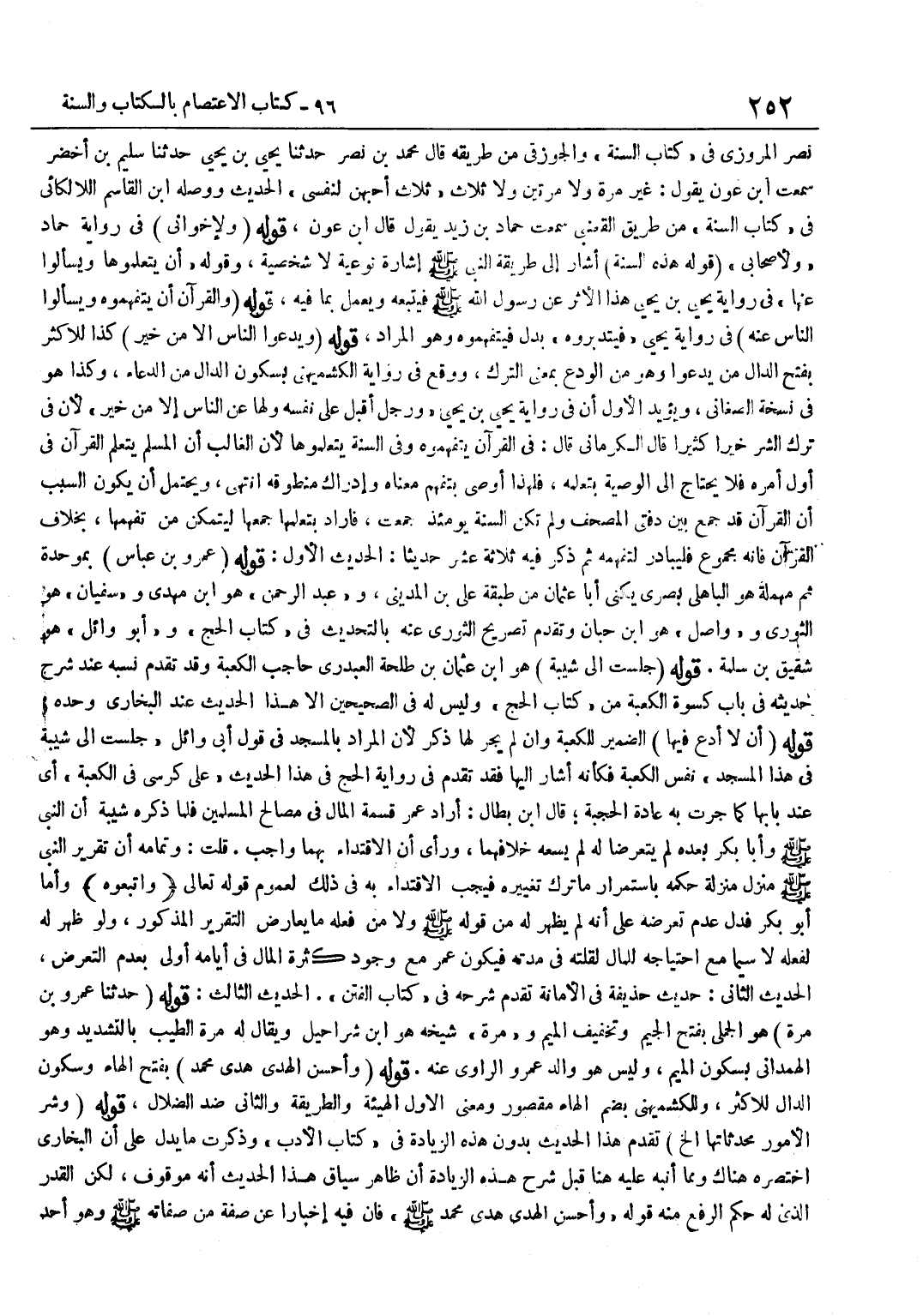 نَصْرٍ الْمَرْوَزِيُّ فِي كِتَابِ السُّنَّةِ وَالْجَوْزَقِيُّ مِنْ طَرِيقِهِ قَالَ مُحَمَّدُ بْنُ نَصْرٍ حَدَّثَنَا يَحْيَى بْنُ يَحْيَى حَدَّثَنَا سَلِيمُ بْنُ أَخْضَرَ سَمِعْتُ بن عَوْنٍ يَقُولُ غَيْرَ مَرَّةٍ وَلَا مَرَّتَيْنِ وَلَا ثَلَاث ثَلَاث أحبهنَّ لنَفْسي الحَدِيث وَوَصله بن الْقَاسِمِ اللَّالَكَائِيُّ فِي كِتَابِ السُّنَّةِ مِنْ طَرِيقِ الْقُعْنَبِيِّ سَمِعْتُ حَمَّادَ بْنَ زَيْدٍ يَقُولُ قَالَ بن عَوْنٍ قَوْلُهُ وَلِإِخْوَانِي فِي رِوَايَةِ حَمَّادٍ وَلِأَصْحَابِي قَوْلُهُ هَذِهِ السُّنَّةُ أَشَارَ إِلَى طَرِيقَةِ النَّبِيِّ صَلَّى اللَّهُ عَلَيْهِ وَسَلَّمَ إِشَارَةً نَوْعِيَّةً لَا شَخْصِيَّةً وَقَوْلُهُ أَنْ يَتَعَلَّمُوهَا وَيَسْأَلُوا عَنْهَا فِي رِوَايَةِ يَحْيَى بْنِ يَحْيَى هَذَا الْأَثَرُ عَنْ رَسُولِ اللَّهِ صَلَّى اللَّهُ عَلَيْهِ وَسَلَّمَ فَيَتْبَعُهُ وَيَعْمَلُ بِمَا فِيهِ قَوْلُهُ وَالْقُرْآنُ أَنْ يَتَفَهَّمُوهُ وَيَسْأَلُوا النَّاسَ عَنْهُ فِي رِوَايَةِ يَحْيَى فَيَتَدَبَّرُوهُ بَدَلَ فَيَتَفَهَّمُوهُ وَهُوَ الْمُرَادُ قَوْلُهُ وَيَدَعُوا النَّاسَ إِلَّا مِنْ خَيْرٍ كَذَا لِلْأَكْثَرِ بِفَتْحِ الدَّالِ مِنْ يَدَعُوا وَهُوَ مِنَ الْوَدْعِ بِمَعْنَى التَّرْكِ وَوَقَعَ فِي رِوَايَةِ الْكُشْمِيهَنِيِّ بِسُكُونِ الدَّالِ مِنَ الدُّعَاءِ وَكَذَا هُوَ فِي نُسْخَةِ الصَّغَانِيِّ وَيُؤَيِّدُ الْأَوَّلَ أَنَّ فِي رِوَايَةِ يَحْيَى بْنِ يَحْيَى وَرَجُلٌ أَقْبَلَ عَلَى نَفْسِهِ وَلَهَا عَنِ النَّاسِ إِلَّا مِنْ خَيْرٍ لِأَنَّ فِي تَرْكِ الشَّرِّ خَيْرًا كَثِيرًا قَالَ الْكِرْمَانِيُّ قَالَ فِي الْقُرْآنِ يَتَفَهَّمُوهُ وَفِي السُّنَّةِ يَتَعَلَّمُوهَا لِأَنَّ الْغَالِبَ أَنَّ الْمُسْلِمَ يَتَعَلَّمُ الْقُرْآنَ فِي أَوَّلِ أَمْرِهِ فَلَا يَحْتَاجُ إِلَى الْوَصِيَّةِ بِتَعَلُّمِهِ فَلِهَذَا أَوْصَى بِتَفَهُّمِ مَعْنَاهُ وَإِدْرَاكِ مَنْطُوقِهِ انْتَهَى وَيُحْتَمَلُ أَنْ يَكُونَ السَّبَبُ أَنَّ الْقُرْآنَ قَدْ جُمِعَ بَيْنَ دَفَّتَيِ الْمُصْحَفِ وَلَمْ تَكُنِ السُّنَّةُ يَوْمئِذٍ جُمِعَتْ فَأَرَادَ بِتَعَلُّمِهَا جَمْعَهَا لِيَتَمَكَّنَ مِنْ تَفَهُّمِهَا بِخِلَافِ الْقُرْآنِ فَإِنَّهُ مَجْمُوعٌ فَلْيُبَادَرْ لِتَفَهُّمِهِ ثُمَّ ذَكَرَ فِيهِ ثَلَاثَةَ عَشَرَ حَدِيثًا الْحَدِيثُ الْأَوَّلُ