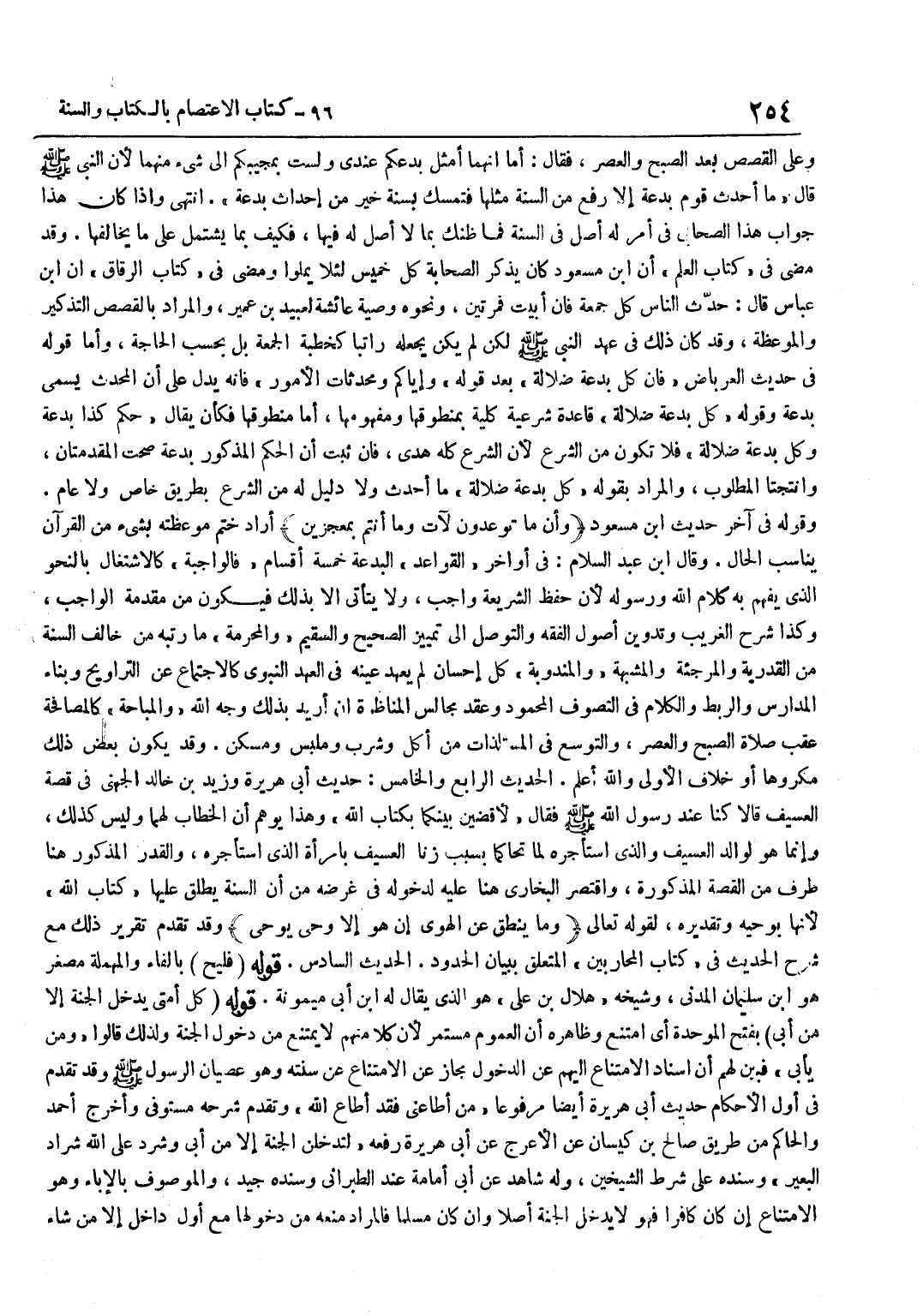وَعَلَى الْقَصَصِ بَعْدَ الصُّبْحِ وَالْعَصْرِ فَقَالَ أَمَا إِنَّهُمَا أَمْثَلُ بِدَعِكُمْ عِنْدِي وَلَسْتُ بِمُجِيبِكُمْ إِلَى شَيْءٍ مِنْهُمَا لِأَنَّ النَّبِيَّ صَلَّى اللَّهُ عَلَيْهِ وَسَلَّمَ قَالَ مَا أَحْدَثَ قَوْمٌ بِدْعَةً إِلَّا رُفِعَ مِنَ السُّنَّةِ مِثْلُهَا فَتَمَسُّكٌ بِسَنَةٍ خَيْرٌ مِنْ إِحْدَاثِ بِدْعَةٍ انْتَهَى وَإِذَا كَانَ هَذَا جَوَابُ هَذَا الصَّحَابِيِّ فِي أَمْرٍ لَهُ أَصْلٌ فِي السُّنَّةِ فَمَا ظَنُّكَ بِمَا لَا أَصْلَ لَهُ فِيهَا فَكَيْفَ بِمَا يَشْتَمِلُ عَلَى مَا يُخَالِفُهَا وَقَدْ مَضَى فِي كِتَابِ الْعِلْمِ أَنَّ بن مَسْعُودٍ كَانَ يُذَكِّرُ الصَّحَابَةَ كُلَّ خَمِيسٍ لِئَلَّا يملوا وَمضى فِي كتاب الرقَاق ان بن عَبَّاسٍ قَالَ حَدِّثِ النَّاسَ كُلَّ جُمْعَةٍ فَإِنْ أَبَيْتَ فَمَرَّتَيْنِ وَنَحْوُهُ وَصِيَّةُ عَائِشَةَ لِعُبَيْدِ بْنِ عُمَيْرٍ وَالْمُرَادُ بِالْقَصَصِ التَّذْكِيرُ وَالْمَوْعِظَةُ وَقَدْ كَانَ ذَلِكَ فِي عَهْدِ النَّبِيِّ صَلَّى اللَّهُ عَلَيْهِ وَسَلَّمَ لَكِنْ لَمْ يَكُنْ يَجْعَلْهُ رَاتِبًا كَخُطْبَةِ الْجُمُعَةِ بَلْ بِحَسْبِ الْحَاجَةِ وَأَمَّا قَوْلُهُ فِي حَدِيثِ الْعِرْبَاضِ فَإِنَّ كُلَّ بِدْعَةٍ ضَلَالَةٌ بَعْدَ قَوْلِهِ وَإِيَّاكُمْ وَمُحْدَثَاتِ الْأُمُورِ فَإِنَّهُ يَدُلُّ عَلَى أَنَّ الْمُحْدَثَ يُسَمَّى بِدْعَةً وَقَوْلُهُ كُلَّ بِدْعَةٍ ضَلَالَةٌ قَاعِدَةٌ شَرْعِيَّةٌ كُلِّيَّةٌ بِمَنْطُوقِهَا وَمَفْهُومِهَا أَمَّا مَنْطُوقُهَا فَكَأَنْ يُقَالَ حُكْمُ كَذَا بِدْعَةٌ وَكُلُّ بِدْعَةٍ ضَلَالَةٌ فَلَا تَكُونُ مِنَ الشَّرْعِ لِأَنَّ الشَّرْعَ كُلَّهُ هُدًى فَإِنْ ثَبَتَ أَنَّ الْحَكَمَ الْمَذْكُورَ بِدْعَةٌ صَحَّتِ الْمُقَدِّمَتَانِ وَأَنْتَجَتَا الْمَطْلُوبَ وَالْمُرَادُ بِقَوْلِهِ كُلَّ بِدْعَةٍ ضَلَالَةٌ مَا أُحْدِثُ وَلَا دَلِيلَ لَهُ مِنَ الشَّرْعِ بِطَرِيقٍ خَاصٍّ وَلَا عَام وَقَوله فِي آخر حَدِيث بن مَسْعُود وان مَا توعدون لآت وَمَا أَنْتُم بمعجزين أَرَادَ خَتْمَ مَوْعِظَتِهِ بِشَيْءٍ مِنَ الْقُرْآنِ يُنَاسِبُ الْحَال وَقَالَ بن عَبْدِ السَّلَامِ فِي أَوَاخِرِ الْقَوَاعِدِ الْبِدْعَةُ خَمْسَةُ أَقْسَامٍ فَالْوَاجِبَةُ كَالِاشْتِغَالِ بِالنَّحْوِ الَّذِي يُفْهَمُ بِهِ كَلَامُ اللَّهِ وَرَسُولِهِ لِأَنَّ حِفْظَ الشَّرِيعَةِ وَاجِبٌ وَلَا يَتَأَتَّى إِلَّا بِذَلِكَ فَيَكُونُ مِنْ مُقَدَّمَةِ الْوَاجِبِ وَكَذَا شَرْحُ الْغَرِيبِ وَتَدْوِينُ أُصُولِ الْفِقْهِ وَالتَّوَصُّلُ إِلَى تَمْيِيزِ الصَّحِيحِ وَالسَّقِيمِ وَالْمُحَرَّمَةُ مَا رَتَّبَهُ مَنْ خَالَفَ السُّنَّةَ مِنَ الْقَدَرِيَّةِ وَالْمُرْجِئَةِ وَالْمُشَبِّهَةِ وَالْمَنْدُوبَةُ كُلُّ إِحْسَانٍ لَمْ يُعْهَدْ عَيْنُهُ فِي الْعَهْد النَّبَوِيّ كالاجتماع عَن التَّرَاوِيحِ وَبِنَاءِ الْمَدَارِسِ وَالرُّبَطِ وَالْكَلَامِ فِي التَّصَوُّفِ الْمَحْمُودِ وَعَقْدِ مَجَالِسِ الْمُنَاظَرَةِ إِنْ أُرِيدَ بِذَلِكَ وَجْهُ اللَّهِ وَالْمُبَاحَةُ كَالْمُصَافَحَةِ عَقِبِ صَلَاةِ الصُّبْحِ وَالْعَصْرِ وَالتَّوَسُّعِ فِي الْمُسْتَلَذَّاتِ مِنْ أَكْلٍ وَشُرْبٍ وَمَلْبَسٍ وَمَسْكَنٍ وَقَدْ يَكُونُ بَعْضُ ذَلِكَ مَكْرُوهًا أَوْ خِلَافَ الْأَوْلَى وَاللَّهُ أَعْلَمُ الْحَدِيثُ الرَّابِعُ والْخَامِسُ حَدِيثُ أَبِي هُرَيْرَةَ وَزَيْدِ بْنِ خَالِدٍ الْجُهَنِيِّ فِي قِصَّةِ الْعَسِيفِ قَالَا كُنَّا عِنْدَ رَسُولِ اللَّهِ صَلَّى اللَّهُ عَلَيْهِ وَسَلَّمَ فَقَالَ لَأَقْضِيَنَّ بَيْنَكُمَا بِكِتَابِ اللَّهِ وَهَذَا يُوهِمُ أَنَّ الْخِطَابَ لَهُمَا وَلَيْسَ كَذَلِكَ وَإِنَّمَا هُوَ لِوَالِدِ الْعَسِيفِ وَالَّذِي اسْتَأْجَرَهُ لَمَّا تَ