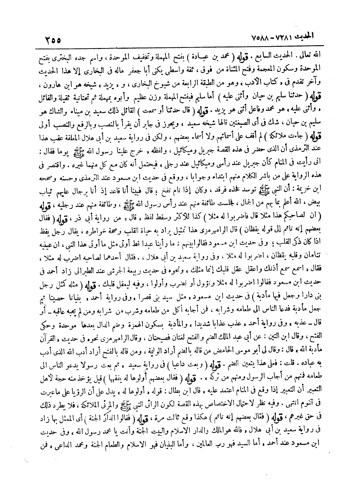 [7281] قَوْلُهُ مُحَمَّدُ بْنُ عُبَادَةَ بِفَتْحِ الْمُهْمَلَةِ وَتَخْفِيفِ الْمُوَحَّدَةِ وَاسْمُ جَدِّهِ الْبَخْتَرِيُّ بِفَتْحِ الْمُوَحَّدَةِ وَسُكُونِ الْمُعْجَمَةِ وَفَتْحِ الْمُثَنَّاةِ مِنْ فَوْقٍ ثِقَةٌ وَاسِطِيٌّ يُكْنَى أَبَا جَعْفَرٍ مَاله فِي الْبُخَارِيِّ إِلَّا هَذَا الْحَدِيثُ وَآخَرُ تَقَدَّمَ فِي كِتَابِ الْأَدَبِ وَهُوَ مِنَ الطَّبَقَةِ الرَّابِعَةِ من شُيُوخ البُخَارِيّ وَيزِيد شَيْخه هُوَ بن هَارُونَ قَوْلُهُ حَدَّثَنَا سَلِيمُ بْنُ حَيَّانَ وَأَثْنَى عَلَيْهِ أَمَّا سَلِيمٌ فَبِفَتْحِ الْمُهْمَلَةِ وَزْنُ عَظِيمٍ وَأَبُوهُ بِمُهْمَلَةٍ ثُمَّ تَحْتَانِيَّةٍ ثَقِيلَةٍ وَالْقَائِلُ وَأَثْنَى عَلَيْهِ هُوَ مُحَمَّدٌ وَفَاعِلُ أَثْنَى هُوَ يَزِيدُ قَوْلُهُ قَالَ حَدَّثَنَا أَوْ سَمِعْتُ الْقَائِلُ ذَلِكَ سَعِيدُ بْنُ مِينَاءَ وَالشَّاكُّ هُوَ سَلِيمُ بْنُ حَيَّانَ شَكَّ فِي أَيِّ الصِّيغَتَيْنِ قَالَهَا شَيْخُهُ سَعِيدٌ وَيَجُوزُ فِي جَابِرٍ أَنْ يُقْرَأَ بِالنَّصْبِ وَبِالرَّفْعِ وَالنَّصْبُ أَوْلَى قَوْلُهُ جَاءَتْ مَلَائِكَةٌ لَمْ أَقِفْ عَلَى أَسْمَائِهِمْ وَلَا أَسْمَاءِ بَعْضِهِمْ وَلَكِنْ فِي رِوَايَةِ سَعِيدِ بْنِ أَبِي هِلَالٍ الْمُعَلَّقَةِ عَقِبِ هَذَا عِنْدَ التِّرْمِذِيِّ أَنَّ الَّذِي حَضَرَ فِي هَذِهِ الْقِصَّةِ جِبْرِيلُ وَمِيكَائِيلُ وَلَفْظُهُ خَرَجَ عَلَيْنَا رَسُولُ اللَّهِ صَلَّى اللَّهُ عَلَيْهِ وَسَلَّمَ يَوْمًا فَقَالَ إِنِّي رَأَيْتُ فِي الْمَنَامِ كَأَنَّ جِبْرِيلَ عِنْدَ رَأْسِي وَمِيكَائِيلَ عِنْدَ رِجْلَيَّ فَيَحْتَمِلُ أَنَّهُ كَانَ مَعَ كُلٍّ مِنْهُمَا غَيْرُهُ وَاقْتَصَرَ فِي هَذِهِ الرِّوَايَةِ عَلَى مَنْ بَاشَرَ الْكَلَامَ مِنْهُم ابْتِدَاء وجوابا وَوَقع فِي حَدِيث بن مَسْعُود عِنْد التِّرْمِذِيّ وَحسنه وَصَححهُ بن خُزَيْمَةَ أَنَّ النَّبِيَّ صَلَّى اللَّهُ عَلَيْهِ وَسَلَّمَ تَوَسَّدَ فَخِذَهُ فَرَقَدَ وَكَانَ إِذَا نَامَ نَفَخَ قَالَ فَبَيْنَا أَنَا قَاعِدٌ إِذْ أَنَا بِرِجَالٍ عَلَيْهِمْ ثِيَابٌ بِيضٌ اللَّهُ أَعْلَمُ بِمَا بِهِمْ مِنَ الْجَمَالِ فَجَلَسَتْ طَائِفَةٌ مِنْهُمْ عِنْدَ رَأْسِ رَسُولِ اللَّهِ صَلَّى اللَّهُ عَلَيْهِ وَسَلَّمَ وَطَائِفَةٌ مِنْهُمْ عِنْدَ رِجْلَيْهِ قَوْلُهُ إِنَّ لِصَاحِبِكُمْ هَذَا مَثَلًا قَالَ فَاضْرِبُوا لَهُ مَثَلًا كَذَا لِلْأَكْثَرِ وَسَقَطَ لَفْظُ قَالَ مِنْ رِوَايَةِ أَبِي ذَرٍّ قَوْلُهُ فَقَالَ بَعْضُهُمْ إِنَّهُ نَائِمٌ إِلَى قَوْلِهِ يَقْظَانُ قَالَ الرَّامَهُرْمُزِيُّ هَذَا تَمْثِيلٌ يُرَادُ بِهِ حَيَاةُ الْقَلْبِ وَصِحَّةُ خَوَاطِرِهِ يُقَالُ رَجُلٌ يَقِظٌ إِذا كَانَ ذكي الْقلب وَفِي حَدِيث بن مَسْعُودٍ فَقَالُوا بَيْنَهُمْ مَا رَأَيْنَا عَبْدًا قَطُّ أُوتِيَ مِثْلَ مَا أُوتِيَ هَذَا النَّبِيُّ إِنَّ عَيْنَيْهِ تَنَامَانِ وَقَلْبُهُ يَقْظَانُ اضْرِبُوا لَهُ مَثَلًا وَفِي رِوَايَةِ سَعِيدِ بْنِ أَبِي هِلَالٍ فَقَالَ أَحَدُهُمَا لِصَاحِبِهِ اضْرِبْ لَهُ مَثَلًا فَقَالَ اسْمَعْ سَمِعَ أُذُنُكَ وَاعْقِلْ عَقَلَ قَلْبُكَ إِنَّمَا مَثَلُكَ وَنَحْوُهُ فِي حَدِيثِ رَبِيعَةَ الْجَرْشِيِّ عِنْدَ الطَّبَرَانِيِّ زَاد أَحْمد فِي حَدِيث بن مَسْعُودٍ فَقَالُوا اضْرِبُوا لَهُ مَثَلًا وَنُؤَوِّلُ أَوْ نَضْرِبُ وَأَوِّلُوا وَفِيهِ لِيَعْقِلْ قَلْبُكَ قَوْلُهُ مَثَلَهُ كَمَثَلِ رَجُلٍ بَنَى دَارًا وَجَعَلَ فِيهَا مَأْدُبَةً فِي حَدِيث بن مَسْعُودٍ مَثَلُ سَيِّدٍ بَنَى قَصْرًا وَفِي رِوَايَةِ أَحْمَدَ بُنْيَانًا حَصِينًا ثُمَّ جَعَلَ مَأْدُبَةً فَدَعَا النَّاسَ إِلَى طَعَامِهِ وَشَرَابِهِ فَمَنْ أَجَابَهُ أَكَلَ مِنْ طَعَامِهِ وَشَرِبَ مِنْ شَرَابِهِ وَمَنْ لَ