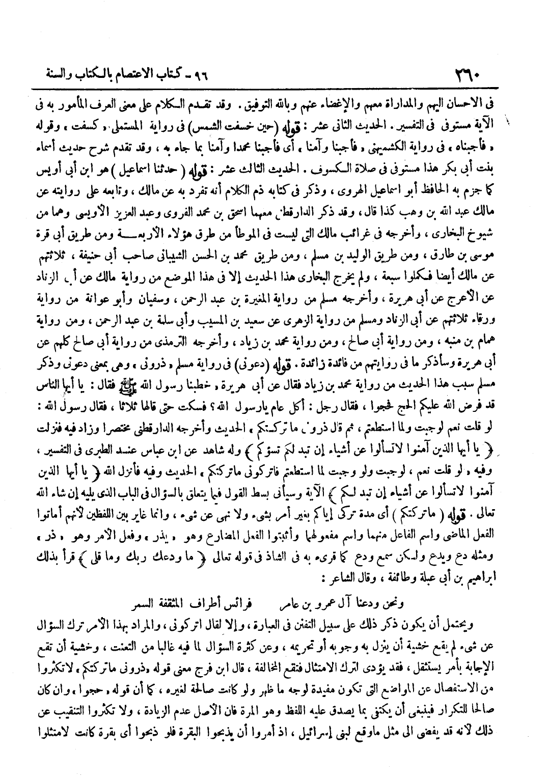 (وَنَحْنُ وَدَعْنَا آلَ عَمْرِو بْنِ عَامِرٍ ... فَرَائِسَ أَطْرَافِ الْمُثَقَّفَةِ السَّمُرِ) وَيَحْتَمِلُ أَنْ يَكُونَ ذَكَرَ ذَلِكَ عَلَى سَبِيلِ التَّفَنُّنِ فِي الْعِبَارَةِ وَإِلَّا لَقَالَ اتْرُكُونِي وَالْمُرَادُ بِهَذَا الْأَمْرِ تَرْكُ السُّؤَالِ عَنْ شَيْءٍ لَمْ يَقَعْ خَشْيَةَ أَنْ يَنْزِلَ بِهِ وُجُوبُهُ أَوْ تَحْرِيمُهُ وَعَنْ كَثْرَةِ السُّؤَالِ لِمَا فِيهِ غَالِبًا مِنَ التَّعَنُّتِ وَخَشْيَةَ أَنْ تَقَعَ الْإِجَابَةُ بِأَمْرٍ يُسْتَثْقَلُ فَقَدْ يُؤَدِّي لترك الِامْتِثَال فَتَقَع الْمُخَالفَة قَالَ بن فَرَجٍ مَعْنَى قَوْلِهِ ذَرُونِي مَا تَرَكْتُكُمْ لَا تُكْثِرُوا مِنَ الِاسْتِفْصَالِ عَنِ الْمَوَاضِعِ الَّتِي تَكُونُ مُفِيدَةً لِوَجْهِ مَا ظَهَرَ وَلَوْ كَانَتْ صَالِحَةً لِغَيْرِهِ كَمَا أَنَّ قَوْلَهُ حُجُّوا وَإِنْ كَانَ صَالِحًا لِلتَّكْرَارِ فَيَنْبَغِي أَنْ يُكْتَفَى بِمَا يَصْدُقُ عَلَيْهِ اللَّفْظُ وَهُوَ الْمَرَّةُ فَإِنَّ الْأَصْلَ عَدَمُ الزِّيَادَةِ وَلَا تُكْثِرُوا التَّنْقِيبَ عَنْ ذَلِكَ لِأَنَّهُ قَدْ يُفْضِي إِلَى مِثْلِ مَا وَقَعَ لِبَنِي إِسْرَائِيلَ إِذْ أُمِرُوا أَنْ يَذْبَحُوا الْبَقَرَةَ فَلَوْ ذَبَحُوا أَيَّ بَقَرَةٍ كَانَتْ لَامْتَثَلُوا