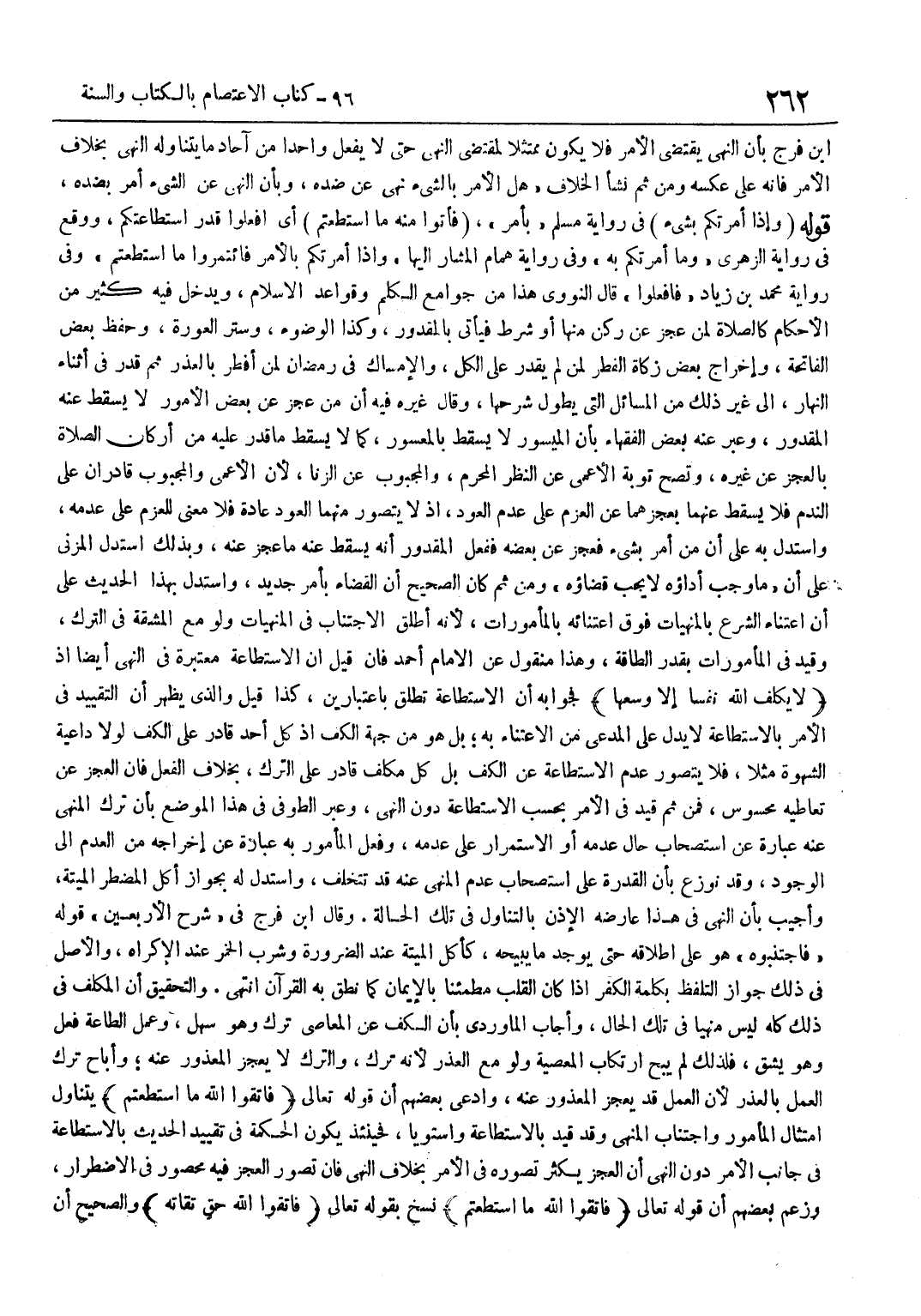 بن فَرَجٍ بِأَنَّ النَّهْيَ يَقْتَضِي الْأَمْرَ فَلَا يَكُونُ مُمْتَثِلًا لِمُقْتَضَى النَّهْيِ حَتَّى لَا يَفْعَلَ وَاحِدًا مِنْ آحَادِ مَا يَتَنَاوَلُهُ النَّهْيُ بِخِلَافِ الْأَمْرِ فَإِنَّهُ عَلَى عَكْسِهِ وَمِنْ ثَمَّ نَشَأَ الْخِلَافُ هَلِ الْأَمْرُ بِالشَّيْءِ نَهْيٌ عَنْ ضِدِّهِ وَبِأَنَّ النَّهْيَ عَنِ الشَّيْءِ أَمْرٌ بِضِدِّهِ قَوْلُهُ وَإِذَا أَمَرْتُكُمْ بِشَيْءٍ فِي رِوَايَةِ مُسْلِمٍ بِأَمْرٍ فَأْتُوا مِنْهُ مَا اسْتَطَعْتُمْ أَيِ افْعَلُوا قَدْرَ اسْتِطَاعَتِكُمْ وَوَقَعَ فِي رِوَايَةِ الزُّهْرِيِّ وَمَا أَمَرْتُكُمْ بِهِ وَفِي رِوَايَةِ هَمَّامٍ الْمُشَارِ إِلَيْهَا وَإِذَا أَمَرْتُكُمْ بِالْأَمْرِ فَائْتَمِرُوا مَا اسْتَطَعْتُمْ وَفِي رِوَايَةِ مُحَمَّدِ بْنِ زِيَادٍ فَافْعَلُوا قَالَ النَّوَوِيُّ هَذَا مِنْ جَوَامِعِ الْكَلِمِ وَقَوَاعِدِ الْإِسْلَامِ وَيَدْخُلُ فِيهِ كَثِيرٌ مِنَ الْأَحْكَامِ كَالصَّلَاةِ لِمَنْ عَجَزَ عَنْ رُكْنٍ مِنْهَا أَوْ شَرْطٍ فَيَأْتِي بِالْمَقْدُورِ وَكَذَا الْوُضُوءُ وَسَتْرُ الْعَوْرَةِ وَحِفْظُ بَعْضِ الْفَاتِحَةِ وَإِخْرَاجُ بَعْضِ زَكَاةِ الْفِطْرِ لِمَنْ لَمْ يَقْدِرْ عَلَى الْكُلِّ وَالْإِمْسَاكُ فِي رَمَضَانَ لِمَنْ أَفْطَرَ بِالْعُذْرِ ثُمَّ قَدَرَ فِي أَثْنَاءِ النَّهَارِ إِلَى غَيْرِ ذَلِكَ مِنَ الْمَسَائِلِ الَّتِي يَطُولُ شَرْحُهَا وَقَالَ غَيْرُهُ فِيهِ أَنَّ مَنْ عَجَزَ عَنْ بَعْضِ الْأُمُورِ لَا يَسْقُطُ عَنْهُ الْمَقْدُورُ وَعَبَّرَ عَنْهُ بَعْضُ الْفُقَهَاءِ بِأَنَّ الْمَيْسُورَ لَا يَسْقُطُ بِالْمَعْسُورِ كَمَا لَا يَسْقُطُ مَا قَدَرَ عَلَيْهِ مِنْ أَرْكَانِ الصَّلَاةِ بِالْعَجْزِ عَنْ غَيْرِهِ وَتَصِحُّ تَوْبَةُ الْأَعْمَى عَنِ النَّظَرِ الْمُحَرَّمِ وَالْمَجْبُوبِ عَنِ الزِّنَا لِأَنَّ الْأَعْمَى وَالْمَجْبُوبَ قَادِرَانِ عَلَى النَّدَمِ فَلَا يَسْقُطُ عَنْهُمَا بِعَجْزِهِمَا عَنِ الْعَزْمِ عَلَى عَدَمِ الْعَوْدِ إِذْ لَا يُتَصَوَّرُ مِنْهُمَا الْعَوْدُ عَادَةً فَلَا مَعْنَى لِلْعَزْمِ عَلَى عَدَمِهِ وَاسْتُدِلَّ بِهِ عَلَى أَنَّ مَنْ أُمِرَ بِشَيْءٍ فَعَجَزَ عَنْ بَعْضِهِ فَفَعَلَ الْمَقْدُورَ أَنَّهُ يَسْقُطُ عَنْهُ مَا عَجَزَ عَنْهُ وَبِذَلِكَ اسْتَدَلَّ الْمُزَنِيُّ عَلَى أَنَّ مَا وَجَبَ أَدَاؤُهُ لَا يَجِبُ قَضَاؤُهُ وَمِنْ ثَمَّ كَانَ الصَّحِيحُ أَنَّ الْقَضَاءَ بِأَمْرٍ جَدِيدٍ وَاسْتُدِلَّ بِهَذَا الْحَدِيثِ عَلَى أَنَّ اعْتِنَاءَ الشَّرْعِ بِالْمَنْهِيَّاتِ فَوْقَ اعْتِنَائِهِ بِالْمَأْمُورَاتِ لِأَنَّهُ أَطْلَقَ الِاجْتِنَابَ فِي الْمَنْهِيَّاتِ وَلَوْ مَعَ الْمَشَقَّةِ فِي التَّرْكِ وَقَيَّدَ فِي الْمَأْمُورَاتِ بِقَدْرِ الطَّاقَةِ وَهَذَا مَنْقُولٌ عَنِ الْإِمَامِ أَحْمَدَ فَإِنْ قِيلَ إِنَّ الِاسْتِطَاعَةَ مُعْتَبَرَةٌ فِي النَّهْيِ أَيْضًا إِذْ لَا يُكَلِّفُ اللَّهُ نفسا الا وسعهَا فَجَوَابُهُ أَنَّ الِاسْتِطَاعَةَ تُطْلَقُ بِاعْتِبَارَيْنِ كَذَا قِيلَ وَالَّذِي يَظْهَرُ أَنَّ التَّقْيِيدَ فِي الْأَمْرِ بِالِاسْتِطَاعَةِ لَا يَدُلُّ عَلَى الْمُدَّعَى مِنَ الِاعْتِنَاءِ بِهِ بَلْ هُوَ مِنْ جِهَةِ الْكَفِّ إِذْ كُلُّ أَحَدٍ قَادِرٌ عَلَى الْكَفِّ لَوْلَا دَاعِيَةُ الشَّهْوَةِ مَثَلًا فَلَا يُتَصَوَّرُ عَدَمُ الِاسْتِطَاعَةِ عَنِ الْكَفِّ بَلْ كُلُّ مُكَلَّفٍ قَادِرٌ عَلَى التَّرْكِ بِخِلَافِ الْفِعْلِ فَإِنَّ الْعَجْزَ عَنْ تَعَاطِيهِ مَحْسُوسٌ فَمِنْ ثَمَّ قَيَّدَ فِي الْأَمْرِ بِحَسْبِ الِاسْتِطَاعَةِ دُونَ النَّهْيِ وَعَبَّرَ الطُّوفِيُّ فِي هَذَا الْمَوْضِعِ بِأَنَّ تَرْكَ الْمَنْهِيِّ عَنْهُ عِبَارَةٌ عَنِ اسْتِصْحَابِ حَالِ عَدَمِهِ أَوْ الِاس