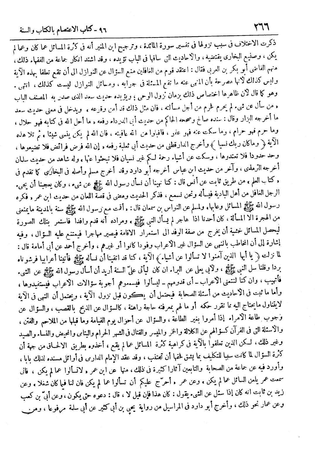 ذَكَرْتُ الِاخْتِلَافَ فِي سَبَبِ نُزُولِهَا فِي تَفْسِيرِ سُورَة الْمَائِدَة وترجيح بن الْمُنِيرِ أَنَّهُ فِي كَثْرَةِ الْمَسَائِلِ عَمَّا كَانَ وَعَمَّا لَمْ يَكُنْ وَصَنِيعُ الْبُخَارِيِّ يَقْتَضِيهِ وَالْأَحَادِيثُ الَّتِي سَاقَهَا فِي الْبَابِ تُؤَيِّدُهُ وَقَدِ اشْتَدَّ إِنْكَارُ جَمَاعَةٍ مِنَ الْفُقَهَاءِ ذَلِكَ مِنْهُمُ الْقَاضِي أَبُو بَكْرِ بْنُ الْعَرَبِيِّ فَقَالَ اعْتَقَدَ قَوْمٌ مِنَ الْغَافِلِينَ مَنْعَ السُّؤَالِ عَنِ النَّوَازِلِ إِلَى أَنْ تَقَعَ تَعَلُّقًا بِهَذِهِ الْآيَةِ وَلَيْسَ كَذَلِكَ لِأَنَّهَا مُصَرِّحَةٌ بِأَنَّ الْمَنْهِيَّ عَنْهُ مَا تَقَعُ الْمَسْأَلَةُ فِي جَوَابِهِ وَمَسَائِلُ النَّوَازِلِ لَيْسَتْ كَذَلِكَ انْتَهَى وَهُوَ كَمَا قَالَ لِأَنَّ ظَاهِرَهَا اخْتِصَاصُ ذَلِكَ بِزَمَانِ نُزُولِ الْوَحْيِ وَيُؤَيِّدُهُ حَدِيثُ سَعْدٍ الَّذِي صَدَّرَ بِهِ الْمُصَنِّفُ الْبَابَ مَنْ سَأَلَ عَنْ شَيْءٍ لَمْ يُحَرَّمْ فَحُرِّمَ مِنْ أَجْلِ مَسْأَلَتِهِ فَإِنَّ مِثْلَ ذَلِكَ قَدْ أُمِنَ وُقُوعُهُ وَيَدْخُلُ فِي مَعْنَى حَدِيثِ سَعْدٍ مَا أَخْرَجَهُ الْبَزَّارُ وَقَالَ سَنَدُهُ صَالِحٌ وَصَحَّحَهُ الْحَاكِمُ مِنْ حَدِيثِ أَبِي الدَّرْدَاءِ رَفَعَهُ مَا أَحَلَّ اللَّهُ فِي كِتَابِهِ فَهُوَ حَلَالٌ وَمَا حَرَّمَ فَهُوَ حَرَامٌ وَمَا سَكَتَ عَنْهُ فَهُوَ عَفْوٌ فَاقْبَلُوا مِنَ اللَّهِ عَافِيَتَهُ فَإِنَّ اللَّهَ لَمْ يَكُنْ يَنْسَى شَيْئًا ثُمَّ تَلَا هَذِهِ الْآيَةَ وَمَا كَانَ رَبك نسيا وَأَخْرَجَ الدَّارَقُطْنِيُّ مِنْ حَدِيثِ أَبِي ثَعْلَبَةَ رَفَعَهُ إِنَّ اللَّهَ فَرَضَ فَرَائِضَ فَلَا تُضَيِّعُوهَا وَحَدَّ حُدُودًا فَلَا تَعْتَدُوهَا وَسَكَتَ عَنْ أَشْيَاءَ رَحْمَةً لَكُمْ غَيْرَ نِسْيَانٍ فَلَا تَبْحَثُوا عَنْهَا وَلَهُ شَاهِدٌ مِنْ حَدِيثِ سَلْمَانَ أَخْرَجَهُ التِّرْمِذِيُّ وَآخَرُ من حَدِيث بن عَبَّاسٍ أَخْرَجَهُ أَبُو دَاوُدَ وَقَدْ أَخْرَجَ مُسْلِمٌ وَأَصْلُهُ فِي الْبُخَارِيِّ كَمَا تَقَدَّمَ فِي كِتَابِ الْعِلْمِ مِنْ طَرِيقِ ثَابِتٍ عَنْ أَنَسٍ قَالَ كُنَّا نُهِينَا أَنْ نَسْأَلَ رَسُولَ اللَّهِ صَلَّى اللَّهُ عَلَيْهِ وَسَلَّمَ عَنْ شَيْءٍ وَكَانَ يُعْجِبُنَا أَنْ يَجِيءَ الرَّجُلُ الْغَافِلُ مِنْ أَهْلِ الْبَادِيَةِ فَيَسْأَلَهُ وَنَحْنُ نَسْمَعُ فَذَكَرَ الْحَدِيثَ وَمَضَى فِي قصَّة اللّعان من حَدِيث بن عُمَرَ فَكَرِهَ رَسُولُ اللَّهِ صَلَّى اللَّهُ عَلَيْهِ وَسَلَّمَ الْمَسَائِلَ وَعَابَهَا وَلِمُسْلِمٍ عَنِ النَّوَّاسِ بْنِ سَمْعَانَ قَالَ أَقَمْتُ مَعَ رَسُولِ اللَّهِ صَلَّى اللَّهُ عَلَيْهِ وَسَلَّمَ سَنَةً بِالْمَدِينَةِ مَا يَمْنَعُنِي مِنَ الْهِجْرَةِ إِلَّا الْمَسْأَلَةُ كَانَ أَحَدُنَا إِذَا هَاجَرَ لَمْ يَسْأَلِ النَّبِيَّ صَلَّى اللَّهُ عَلَيْهِ وَسَلَّمَ وَمُرَادُهُ أَنَّهُ قَدِمَ وَافِدًا فَاسْتَمَرَّ بِتِلْكَ الصُّورَةِ لِيُحَصِّلَ الْمَسَائِلَ خَشْيَةَ أَنْ يَخْرُجَ مِنْ صِفَةِ الْوَفْدِ إِلَى اسْتِمْرَارِ الْإِقَامَةِ فَيَصِيرَ مُهَاجِرًا فَيَمْتَنِعُ عَلَيْهِ السُّؤَالُ وَفِيهِ إِشَارَةٌ إِلَى أَنَّ الْمُخَاطَبَ بِالنَّهْيِ عَنِ السُّؤَالِ غَيْرُ الْأَعْرَابِ وُفُودًا كَانُوا أَوْ غَيْرُهُمْ وَأَخْرَجَ أَحْمَدُ عَنْ أَبِي أُمَامَةَ قَالَ لَمَّا نَزَلَتْ يَا أَيُّهَا الَّذِينَ آمَنُوا لَا تَسْأَلُوا عَنْ أَشْيَاء الْآيَةَ كُنَّا قَدِ اتَّقَيْنَا أَنْ نَسْأَلَهُ صَلَّى اللَّهُ عَلَيْهِ وَسَلَّمَ فَأَتَيْنَا أَعْرَابِيًّا فَرَشَوْنَاهُ بُرْدًا وَقُلْنَا سَلِ النَّبِيَّ صَلَّى اللَّهُ عَلَيْهِ وَسَلَّمَ وَلِأَبِي يَعْلَى عَنِ الْبَرَاءِ إِنْ كَانَ لَيَأْتِي عَلَيَّ السَّنَةُ أُرِي