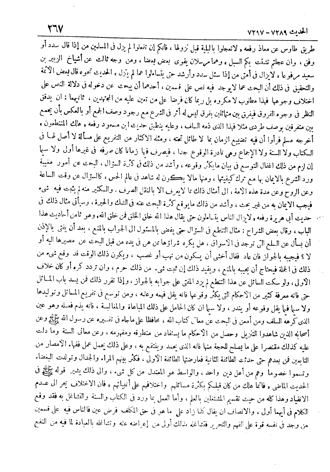 طَرِيقِ طَاوُسٍ عَنْ مُعَاذٍ رَفَعَهُ لَا تُعَجِّلُوا بِالْبَلِيَّةِ قَبْلَ نُزُولِهَا فَإِنَّكُمْ إِنْ تَفْعَلُوا لَمْ يَزَلْ فِي الْمُسْلِمِينَ مَنْ إِذَا قَالَ سُدِّدَ أَوْ وُفِّقَ وَإِنْ عَجَّلْتُمْ تَشَتَّتَ بِكُمُ السُّبُلُ وَهُمَا مُرْسَلَانِ يُقَوِّي بَعْضٌ بَعْضًا وَمِنْ وَجْهٍ ثَالِثٍ عَنْ أَشْيَاخِ الزُّبَيْرِ بْنِ سَعِيدٍ مَرْفُوعًا لَا يَزَالُ فِي أُمَّتِي مَنْ إِذَا سُئِلَ سُدِّدَ وَأُرْشِدَ حَتَّى يَتَسَاءَلُوا عَمَّا لَمْ يَنْزِلْ الْحَدِيثَ نَحْوَهُ قَالَ بَعْضُ الْأَئِمَّةِ وَالتَّحْقِيقُ فِي ذَلِكَ أَنَّ الْبَحْثَ عَمَّا لَا يُوجَدُ فِيهِ نَصٌّ عَلَى قِسْمَيْنِ أَحَدُهُمَا أَنْ يَبْحَثَ عَنْ دُخُولِهِ فِي دَلَالَةِ النَّصِّ عَلَى اخْتِلَافِ وُجُوهِهَا فَهَذَا مَطْلُوبٌ لَا مَكْرُوهٌ بَلْ رُبَّمَا كَانَ فَرْضًا عَلَى مَنْ تَعَيَّنَ عَلَيْهِ مِنَ الْمُجْتَهِدِينَ ثَانِيهُمَا أَنْ يُدَقِّقَ النَّظَرَ فِي وُجُوهِ الْفُرُوقِ فَيُفَرِّقَ بَيْنَ مُتَمَاثِلَيْنِ بِفَرْقٍ لَيْسَ لَهُ أَثَرٌ فِي الشَّرْعِ مَعَ وُجُودِ وَصْفِ الْجَمْعِ أَوْ بِالْعَكْسِ بِأَنْ يَجْمَعَ بَيْنَ مُتَفَرِّقَيْنِ بِوَصْفٍ طَرْدِيٍّ مَثَلًا فَهَذَا الَّذِي ذَمَّهُ السَّلَفُ وَعَلَيْهِ يَنْطَبِقُ حَدِيث بن مَسْعُودٍ رَفَعَهُ هَلَكَ الْمُتَنَطِّعُونَ أَخْرَجَهُ مُسْلِمٌ فَرَأَوْا أَنَّ فِيهِ تَضْيِيعَ الزَّمَانِ بِمَا لَا طَائِلَ تَحْتَهُ وَمِثْلُهُ الْإِكْثَارُ مِنَ التَّفْرِيعِ عَلَى مَسْأَلَةٍ لَا أَصْلَ لَهَا فِي الْكِتَابِ وَلَا السُّنَّةِ وَلَا الْإِجْمَاعِ وَهِيَ نَادِرَةُ الْوُقُوعِ جِدًّا فَيَصْرِفُ فِيهَا زَمَانًا كَانَ صَرْفُهُ فِي غَيْرِهَا أَوْلَى وَلَا سِيَّمَا إِنْ لَزِمَ مِنْ ذَلِكَ إِغْفَالُ التَّوَسُّعِ فِي بَيَانِ مَا يَكْثُرُ وُقُوعُهُ وَأَشَدُّ مِنْ ذَلِكَ فِي كَثْرَةِ السُّؤَالِ الْبَحْثُ عَنْ أُمُورٍ مُغَيَّبَةٍ وَرَدَ الشَّرْعُ بِالْإِيمَانِ بِهَا مَعَ تَرْكِ كَيْفِيَّتِهَا وَمِنْهَا مَا لَا يَكُونُ لَهُ شَاهِدٌ فِي عَالَمِ الْحِسِّ كَالسُّؤَالِ عَنْ وَقْتِ السَّاعَةِ وَعَنِ الرُّوحِ وَعَنْ مُدَّةِ هَذِهِ الْأُمَّةِ إِلَى أَمْثَالِ ذَلِكَ مِمَّا لَا يُعْرَفُ إِلَّا بِالنَّقْلِ الصِّرْفِ وَالْكَثِيرُ مِنْهُ لَمْ يَثْبُتْ فِيهِ شَيْءٌ فَيَجِبُ الْإِيمَانُ بِهِ مِنْ غَيْرِ بَحْثٍ وَأَشَدُّ مِنْ ذَلِكَ مَا يُوقِعُ كَثْرَةُ الْبَحْثِ عَنْهُ فِي الشَّكِّ وَالْحِيرَةِ وَسَيَأْتِي مِثَالُ ذَلِكَ فِي حَدِيثِ أَبِي هُرَيْرَةَ رَفَعَهُ لَا يَزَالُ النَّاسُ يَتَسَاءَلُونَ حَتَّى يُقَالَ هَذَا اللَّهُ خَلَقَ الْخَلْقَ فَمَنْ خَلَقَ اللَّهَ وَهُوَ ثَامِنُ أَحَادِيثِ هَذَا الْبَابِ وَقَالَ بَعْضُ الشُّرَّاحِ مِثَالُ التَّنَطُّعِ فِي السُّؤَالِ حَتَّى يُفْضِيَ بِالْمَسْئُولِ إِلَى الْجَوَابِ بِالْمَنْعِ بَعْدَ أَنْ يُفْتَى بِالْإِذْنِ أَنْ يَسْأَلَ عَنِ السِّلَعِ الَّتِي تُوجَدُ فِي الْأَسْوَاقِ هَلْ يُكْرَهُ شِرَاؤُهَا مِمَّنْ هِيَ فِي يَدِهِ مِنْ قَبْلِ الْبَحْثِ عَنْ مَصِيرِهَا إِلَيْهِ أَوْ لَا فَيُجِيبُهُ بِالْجَوَازِ فَإِنْ عَادَ فَقَالَ أَخْشَى أَنْ يَكُونَ مِنْ نَهْبٍ أَوْ غَصْبٍ وَيَكُونُ ذَلِكَ الْوَقْتُ قَدْ وَقَعَ شَيْءٌ مِنْ ذَلِكَ فِي الْجُمْلَةِ فَيَحْتَاجُ أَنْ يُجِيبَهُ بِالْمَنْعِ وَيُقَيِّدُ ذَلِكَ إِنْ ثَبَتَ شَيْءٌ مِنْ ذَلِكَ حَرُمَ وَإِنْ تَرَدَّدَ كُرِهَ أَوْ كَانَ خِلَافَ الْأَوْلَى وَلَوْ سَكَتَ السَّائِلُ عَنْ هَذَا التَّنَطُّعِ لَمْ يَزِدِ الْمُفْتِي عَلَى جَوَابِهِ بِالْجَوَازِ وَإِذَا تَقَرَّرَ ذَلِكَ فَمَنْ يَسُدُّ بَابَ الْمَسَائِلِ حَتَّى فَاتَهُ مَعْرِفَةُ كَثِيرٍ مِنَ الْأَحْكَامِ الَّتِي يَكْثُرُ وُقُوعُهَا فَإِن
