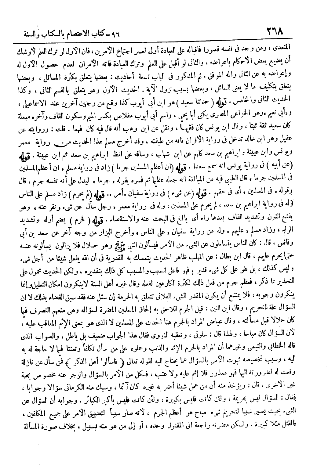 [7289] قَوْلُهُ حَدَّثَنَا سَعِيدٌ هُوَ بن أَبِي أَيُّوبَ كَذَا وَقَعَ مِنْ وَجْهَيْنِ آخَرَيْنِ عِنْد الْإِسْمَاعِيلِيّ وَأبي نُعَيْمٍ وَهُوَ الْخُزَاعِيُّ الْمِصْرِيُّ يُكْنَى أَبَا يَحْيَى وَاسْمُ أَبِي أَيُّوبَ مِقْلَاصٌ بِكَسْرِ الْمِيمِ وَسُكُونِ الْقَافِ وَآخِرُهُ مُهْمَلَةٌ كَانَ سَعِيدٌ ثِقَةً ثَبْتًا وَقَالَ بن يُونُس كَانَ فَقِيها وَنقل عَن بن وَهْبٍ أَنَّهُ قَالَ فِيهِ كَانَ فَهِمًا قُلْتُ وَرِوَايَته عَن عقيل وَهُوَ بن خَالِدٍ تَدْخُلُ فِي رِوَايَةِ الْأَقْرَانِ فَإِنَّهُ مِنْ طَبَقَتِهِ وَقَدْ أَخْرَجَ مُسْلِمٌ هَذَا الْحَدِيثَ مِنْ رِوَايَةِ معمر وَيُونُس وبن عُيَيْنَة وَإِبْرَاهِيم بن سعد كلهم عَن بن شِهَابٍ وَسَاقَهُ عَلَى لَفْظِ إِبْرَاهِيمَ بْنِ سَعْدٍ ثمَّ بن عُيَيْنَةَ قَوْلُهُ عَنْ أَبِيهِ فِي رِوَايَةِ يُونُسَ أَنَّهُ سَمِعَ سَعْدًا قَوْلُهُ إِنَّ أَعْظَمَ الْمُسْلِمِينَ جُرْمًا زَادَ فِي رِوَايَةِ مُسْلِمٍ إِنَّ أَعْظَمَ الْمُسْلِمِينَ فِي الْمُسْلِمِينَ جُرْمًا قَالَ الطِّيبِيُّ فِيهِ مِنَ الْمُبَالَغَةِ أَنَّهُ جَعَلَهُ عَظِيمًا ثُمَّ فَسَّرَهُ بِقَوْلِهِ جُرْمًا لِيَدُلَّ عَلَى أَنَّهُ نَفْسَهُ جُرْمٌ قَالَ وَقَوْلُهُ فِي الْمُسْلِمِينَ أَيْ فِي حَقِّهِمْ قَوْلُهُ عَنْ شَيْءٍ فِي رِوَايَةِ سُفْيَانَ أَمْرٍ قَوْلُهُ لَمْ يُحَرَّمْ زَادَ مُسْلِمٌ عَلَى النَّاسِ وَلَهُ فِي رِوَايَةِ إِبْرَاهِيمَ بْنِ سَعْدٍ لَمْ يُحَرَّمْ عَلَى الْمُسْلِمِينَ وَلَهُ فِي رِوَايَةِ مَعْمَرٍ رَجُلٌ سَأَلَ عَنْ شَيْءٍ وَنَقَّرَ عَنْهُ وَهُوَ بِفَتْحِ النُّونِ وَتَشْدِيدِ الْقَافِ بَعْدَهَا رَاءٌ أَيْ بَالَغَ فِي الْبَحْثِ عَنْهُ وَالِاسْتِقْصَاءِ قَوْلُهُ فَحُرِّمَ بِضَمِّ أَوَّلِهِ وَتَشْدِيدِ الرَّاءِ وَزَادَ مُسْلِمٌ عَلَيْهِمْ وَلَهُ مِنْ رِوَايَةِ سُفْيَانَ عَلَى النَّاسِ وَأَخْرَجَ الْبَزَّارُ مِنْ وَجْهٍ آخَرَ عَنْ سَعْدِ بْنِ أَبِي وَقَّاصٍ قَالَ كَانَ النَّاسُ يَتَسَاءَلُونَ عَنِ الشَّيْءِ مِنَ الْأَمْرِ فَيَسْأَلُونَ النَّبِيَّ صَلَّى اللَّهُ عَلَيْهِ وَسَلَّمَ وَهُوَ حَلَالٌ فَلَا يَزَالُونَ يَسْأَلُونَهُ عَنهُ حَتَّى يحرم عَلَيْهِم قَالَ بن بَطَّالٍ عَنِ الْمُهَلَّبِ ظَاهِرُ الْحَدِيثِ يَتَمَسَّكُ بِهِ الْقَدَرِيَّةُ فِي أَنَّ اللَّهَ يَفْعَلُ شَيْئًا مِنْ أَجْلِ شَيْءٍ وَلَيْسَ كَذَلِكَ بَلْ هُوَ عَلَى كُلِّ شَيْءٍ قَدِيرٌ فَهُوَ فَاعِلُ السَّبَبِ وَالْمُسَبَّبِ كُلُّ ذَلِكَ بِتَقْدِيرِهِ وَلَكِنَّ الْحَدِيثَ مَحْمُولٌ عَلَى التَّحْذِيرِ مِمَّا ذَكَرَ فَعِظَمُ جُرْمِ مَنْ فَعَلَ ذَلِكَ لِكَثْرَةِ الْكَارِهِينَ لِفِعْلِهِ وَقَالَ غَيْرُهُ أَهْلُ السُّنَّةِ لَا يُنْكِرُونَ إِمْكَانَ التَّعْلِيلِ وَإِنَّمَا يُنْكِرُونَ وُجُوبَهُ فَلَا يَمْتَنِعُ أَنْ يَكُونَ الْمُقَدَّرُ الشَّيْءَ الْفُلَانِيَّ تَتَعَلَّقُ بِهِ الْحُرْمَةُ إِنْ سُئِلَ عَنْهُ فَقَدْ سَبَقَ الْقَضَاءُ بِذَلِكَ لَا أَنَّ السُّؤَالَ عِلّة للتَّحْرِيم وَقَالَ بن التِّينِ قِيلَ الْجُرْمُ اللَّاحِقُ بِهِ إِلْحَاقُ الْمُسْلِمِينَ الْمَضَرَّةَ لِسُؤَالِهِ وَهِيَ مَنْعُهُمُ التَّصَرُّفَ فِيمَا كَانَ حَلَالًا قَبْلَ مَسْأَلَتِهِ وَقَالَ عِيَاضٌ الْمُرَادُ بِالْجُرْمِ هُنَا الْحَدَثُ عَلَى الْمُسْلِمِينَ لَا الَّذِي هُوَ بِمَعْنَى الْإِثْمِ الْمُعَاقَبِ عَلَيْهِ لِأَنَّ السُّؤَالَ كَانَ مُبَاحًا وَلِهَذَا قَالَ سَلُونِي وَتَعَقَّبَهُ النَّوَوِيُّ فَقَالَ هَذَا الْجَوَابُ ضَعِيفٌ بَلْ بَاطِلٌ وَالصَّوَابُ الَّذِي قَالَهُ الْخَطَّابِيُّ وَالتَّيْمِيُّ وَغَيْرُهُمَا أَنَّ الْمُرَادَ بِالْجُرْمِ الْإِثْمُ وَالذَّنْبُ وَحَمَلُوهُ عَلَى مَنْ سَأَلَ تَكَلُّفًا وَتَعَنُّتًا فِ