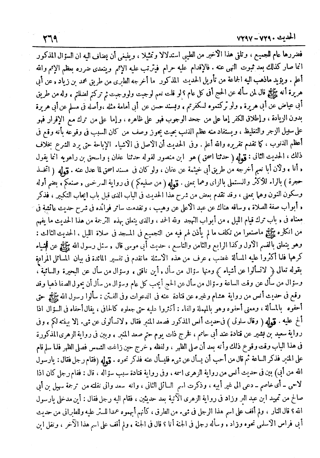 فَضَرَرُهَا عَامٌّ لِلْجَمِيعِ وَتَلَقَّى هَذَا الْأَخِيرُ مِنَ الطِّيبِيِّ اسْتِدْلَالًا وَتَمْثِيلًا وَيَنْبَغِي أَنْ يُضَافَ إِلَيْهِ أَنَّ السُّؤَالَ الْمَذْكُورَ إِنَّمَا صَارَ كَذَلِكَ بَعْدَ ثُبُوتِ النَّهْيِ عَنْهُ فَالْإِقْدَامُ عَلَيْهِ حَرَامٌ فَيَتَرَتَّبٌ عَلَيْهِ الْإِثْمُ وَيَتَعَدَّى ضَرَرُهُ بِعِظَمِ الْإِثْمِ وَاللَّهُ أَعْلَمُ وَيُؤَيِّدُ مَا ذَهَبَ إِلَيْهِ الْجَمَاعَةُ مِنْ تَأْوِيلِ الْحَدِيثِ الْمَذْكُورِ مَا أَخْرَجَهُ الطَّبَرِيُّ مِنْ طَرِيقِ مُحَمَّدِ بْنِ زِيَادٍ عَنْ أَبِي هُرَيْرَةَ أَنَّهُ صَلَّى اللَّهُ عَلَيْهِ وَسَلَّمَ قَالَ لِمَنْ سَأَلَهُ عَنِ الْحَجِّ أَفِي كُلِّ عَامٍ لَوْ قُلْتُ نَعَمْ لَوَجَبَتْ وَلَوْ وَجَبَتْ ثُمَّ تَرَكْتُمْ لَضَلَلْتُمْ وَلَهُ مِنْ طَرِيقِ أَبِي عِيَاضٍ عَنْ أَبِي هُرَيْرَةَ وَلَوْ تَرَكْتُمُوهُ لَكَفَرْتُمْ وَبِسَنَدٍ حَسَنٍ عَنْ أَبِي أُمَامَةَ مِثْلُهُ وَأَصْلُهُ فِي مُسْلِمٍ عَنْ أَبِي هُرَيْرَةَ بِدُونِ الزِّيَادَةِ وَإِطْلَاقُ الْكُفْرِ إِمَّا عَلَى مَنْ جَحَدَ الْوُجُوبَ فَهُوَ عَلَى ظَاهِرِهِ وَإِمَّا عَلَى مَنْ تَرَكَ مَعَ الْإِقْرَارِ فَهُوَ عَلَى سَبِيلِ الزَّجْرِ وَالتَّغْلِيظِ وَيُسْتَفَادُ مِنْهُ عِظَمُ الذَّنْبِ بِحَيْثُ يَجُوزُ وَصْفُ مَنْ كَانَ السَّبَبُ فِي وُقُوعِهِ بِأَنَّهُ وَقَعَ فِي أَعْظَمِ الذُّنُوبِ كَمَا تَقَدَّمَ تَقْرِيرُهُ وَاللَّهُ أَعْلَمُ وَفِي الْحَدِيثِ أَنَّ الْأَصْلَ فِي الْأَشْيَاءِ الْإِبَاحَةُ حَتَّى يَرِدَ الشَّرْعُ بِخِلَافِ ذَلِكَ الْحَدِيثُ الثَّانِي