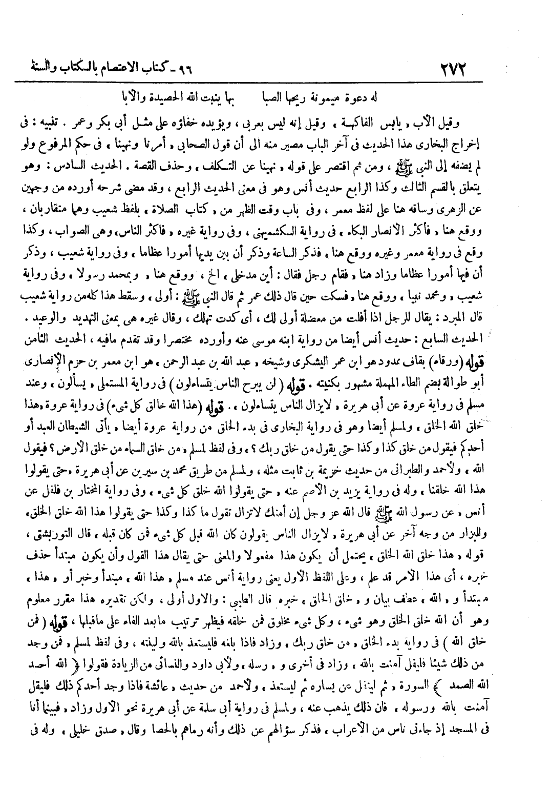 لَهُ دَعْوَةٌ مَيْمُونَةٌ رِيحُهَا الصَّبَا بِهَا يُنْبِتُ اللَّهُ الْحَصِيدَةَ وَالْأَبَا وَقِيلَ الْأَبُّ يَابِسُ الْفَاكِهَةِ وَقِيلَ إِنَّهُ لَيْسَ بِعَرَبِيٍّ وَيُؤَيِّدُهُ خَفَاؤُهُ عَلَى مِثْلِ أَبِي بَكْرٍ وَعُمَرَ تَنْبِيهٌ فِي إِخْرَاجِ الْبُخَارِيِّ هَذَا الْحَدِيثَ فِي آخِرِ الْبَابِ مَصِيرٌ مِنْهُ إِلَى أَنَّ قَوْلَ الصَّحَابِيِّ أُمِرْنَا وَنُهِينَا فِي حُكْمِ الْمَرْفُوعِ وَلَوْ لَمْ يُضِفْهُ إِلَى النَّبِيِّ صَلَّى اللَّهُ عَلَيْهِ وَسَلَّمَ وَمِنْ ثَمَّ اقْتَصَرَ عَلَى قَوْلِهِ نُهِينَا عَنِ التَّكَلُّفِ وَحَذَفَ الْقِصَّةَ الْحَدِيثُ السَّادِسُ وَهُوَ يَتَعَلَّقُ بِالْقِسْمِ الثَّالِثِ وَكَذَا الرَّابِعُ حَدِيثُ أَنَسٍ وَهُوَ فِي مَعْنَى الْحَدِيثِ الرَّابِعِ وَقَدْ مَضَى شَرْحُهُ أَوْرَدَهُ مِنْ وَجْهَيْنِ عَنِ الزُّهْرِيِّ وَسَاقَهُ هُنَا عَلَى لَفْظِ مَعْمَرٍ وَفِي بَابِ وَقْتِ الظُّهْرِ مِنْ كِتَابِ الصَّلَاةِ بِلَفْظِ شُعَيْبٍ وَهُمَا مُتَقَارِبَانِ وَوَقَعَ هُنَا فَأَكْثَرَ الْأَنْصَارُ الْبُكَاءَ فِي رِوَايَةِ الْكُشْمِيهَنِيِّ وَفِي رِوَايَةِ غَيْرِهِ فَأَكْثَرَ النَّاسُ وَهِيَ الصَّوَابُ وَكَذَا وَقَعَ فِي رِوَايَةِ مَعْمَرٍ وَغَيْرِهِ وَوَقَعَ هُنَا فَذَكَرَ السَّاعَةَ وَذَكَرَ أَنَّ بَيْنَ يَدَيْهَا أُمُورًا عِظَامًا وَفِي رِوَايَةِ شُعَيْبٍ وَذَكَرَ أَنَّ فِيهَا أُمُورًا عِظَامًا وَزَادَ هُنَا فَقَامَ رَجُلٌ فَقَالَ أَيْنَ مُدْخَلِي إِلَخْ وَوَقَعَ هُنَا وَبِمُحَمَّدٍ رَسُولًا وَفِي رِوَايَةِ شُعَيْبٍ وَمُحَمَّدٌ نَبِيًّا وَوَقَعَ هُنَا فَسَكَتَ حِينَ قَالَ ذَلِكَ عُمَرُ ثُمَّ قَالَ النَّبِيُّ صَلَّى اللَّهُ عَلَيْهِ وَسَلَّمَ أَوْلَى وَسَقَطَ هَذَا كُلُّهُ مِنْ رِوَايَةِ شُعَيْبٍ قَالَ الْمُبَرِّدُ يُقَالُ لِلرَّجُلِ إِذَا أَفْلَتَ مِنْ مُعْضِلَةٍ أَوْلَى لَكَ أَيْ كِدْتَ تَهْلِكَ وَقَالَ غَيْرُهُ هِيَ بِمَعْنَى التَّهْدِيدِ وَالْوَعِيدِ الْحَدِيثُ السَّابِعُ حَدِيثُ أَنَسٍ أَيْضًا مِنْ رِوَايَةِ ابْنِهِ مُوسَى عَنْهُ وَأَوْرَدَهُ مُخْتَصَرًا وَقَدْ تَقَدَّمَ مَا فِيهِ الْحَدِيثُ الثَّامِنُ