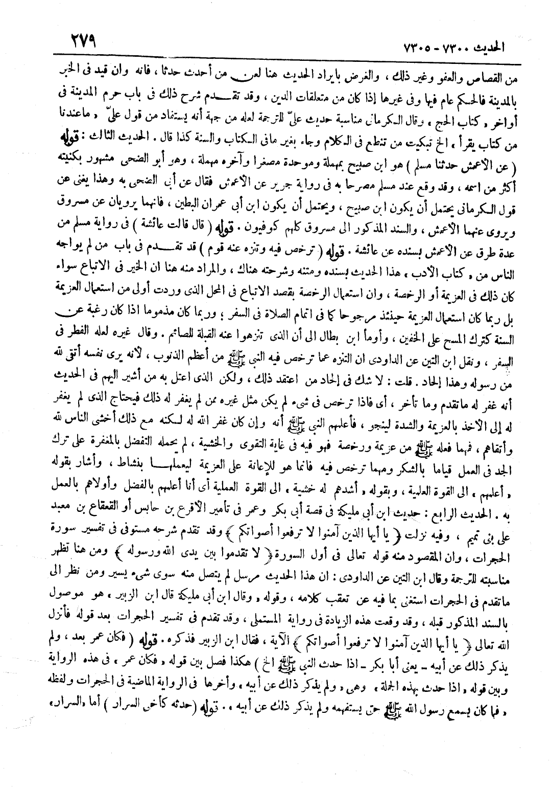 [7301] قَوْلُهُ عَن الْأَعْمَش حَدثنَا مُسلم هُوَ بن صُبَيْحٍ بِمُهْمَلَةٍ وَمُوَحَّدَةٍ مُصَغَّرًا وَآخِرُهُ مُهْمَلَةٌ وَهُوَ أَبُو الضُّحَى مَشْهُورٌ بِكُنْيَتِهِ أَكْثَرَ مِنِ اسْمِهِ وَقَدْ وَقَعَ عِنْدَ مُسْلِمٍ مُصَرَّحًا بِهِ فِي رِوَايَةِ جَرِيرٍ عَنِ الْأَعْمَشِ فَقَالَ عَنْ أَبِي الضُّحَى بِهِ وَهَذَا يُغْنِي عَنْ قَوْلِ الْكِرْمَانِيِّ يحْتَمل ان يكون بن صبيح وَيحْتَمل ان يكون بن أَبِي عِمْرَانَ الْبَطِينَ فَإِنَّهُمَا يَرْوِيَانِ عَنْ مَسْرُوقٍ وَيَرْوِي عَنْهُمَا الْأَعْمَشُ وَالسَّنَدُ الْمَذْكُورُ إِلَى مَسْرُوقٍ كُلُّهُمْ كُوفِيُّونَ قَوْلُهُ قَالَ قَالَتْ عَائِشَةُ فِي رِوَايَةِ مُسْلِمٍ مِنْ عِدَّةِ طُرُقٍ عَنِ الْأَعْمَشِ بِسَنَدِهِ عَنْ عَائِشَةَ قَوْلُهُ تَرَخَّصَ فِيهِ وَتَنَزَّهَ عَنْهُ قَوْمٌ قَدْ تَقَدَّمَ فِي بَابِ مَنْ لَمْ يُوَاجِهِ النَّاسَ مِنْ كِتَابِ الْأَدَبِ هَذَا الْحَدِيثُ بِسَنَدِهِ وَمَتْنِهِ وَشَرَحْتُهُ هُنَاكَ وَالْمُرَادُ مِنْهُ هُنَا أَنَّ الْخَيْرَ فِي الِاتِّبَاعِ سَوَاءٌ كَانَ ذَلِكَ فِي الْعَزِيمَةِ أَوِ الرُّخْصَةِ وَأَنَّ اسْتِعْمَالَ الرُّخْصَةِ بِقَصْدِ الِاتِّبَاعِ فِي الْمَحَلِّ الَّذِي وَرَدَتْ أَوْلَى مِنَ اسْتِعْمَالِ الْعَزِيمَةِ بَلْ رُبَّمَا كَانَ اسْتِعْمَالُ الْعَزِيمَةِ حِينَئِذٍ مَرْجُوحًا كَمَا فِي إِتْمَامِ الصَّلَاةِ فِي السَّفَرِ وَرُبَّمَا كَانَ مَذْمُومًا إِذَا كَانَ رَغْبَةً عَنِ السُّنَّةِ كَتَرْكِ الْمَسْحِ عَلَى الْخُفَّيْنِ وَأَوْمَأَ بن بَطَّالٍ إِلَى أَنَّ الَّذِي تَنَزَّهُوا عَنْهُ الْقُبْلَةُ لِلصَّائِمِ وَقَالَ غَيْرُهُ لَعَلَّهُ الْفِطْرُ فِي السَّفَرِ وَنقل بن التِّينِ عَنِ الدَّاوُدِيِّ أَنَّ التَّنَزُّهَ عَمَّا تَرَخَّصَ فِيهِ النَّبِيُّ صَلَّى اللَّهُ عَلَيْهِ وَسَلَّمَ مِنْ أَعْظَمِ الذُّنُوبِ لِأَنَّهُ يَرَى نَفْسَهُ أَتْقَى لِلَّهِ مِنْ رَسُولِهِ وَهَذَا إِلْحَادٌ قُلْتُ لَا شَكَّ فِي إِلْحَادِ مَنِ اعْتَقَدَ ذَلِكَ وَلَكِنَّ الَّذِي اعْتَلَّ بِهِ مَنْ أُشِيرَ إِلَيْهِمْ فِي الْحَدِيثِ أَنَّهُ غُفِرَ لَهُ مَا تَقَدَّمَ وَمَا تَأَخَّرَ أَيْ فَإِذَا تَرَخَّصَ فِي شَيْءٍ لَمْ يَكُنْ مِثْلَ غَيْرِهِ مِمَّنْ لَمْ يُغْفَرْ لَهُ ذَلِكَ فَيَحْتَاجُ الَّذِي لَمْ يُغْفَرْ لَهُ إِلَى الْأَخْذِ بِالْعَزِيمَةِ وَالشِّدَّةِ لِيَنْجُوَ فَأَعْلَمَهُمُ النَّبِيُّ صَلَّى اللَّهُ عَلَيْهِ وَسَلَّمَ أَنَّهُ وَإِنْ كَانَ غَفَرَ اللَّهُ لَهُ لَكِنَّهُ مَعَ ذَلِكَ أَخْشَى النَّاسِ لِلَّهِ وَأَتْقَاهُمْ فَمَهْمَا فَعَلَهُ صَلَّى اللَّهُ عَلَيْهِ وَسَلَّمَ مِنْ عَزِيمَةٍ وَرُخْصَةٍ فَهُوَ فِيهِ فِي غَايَةِ التَّقْوَى وَالْخَشْيَةِ لَمْ يَحْمِلْهُ التَّفَضُّلُ بِالْمَغْفِرَةِ عَلَى تَرْكِ الْجِدِّ فِي الْعَمَلِ قِيَامًا بِالشُّكْرِ وَمَهْمَا تَرَخَّصَ فِيهِ فَإِنَّمَا هُوَ لِلْإِعَانَةِ عَلَى الْعَزِيمَةِ لِيَعْمَلَهَا بِنَشَاطٍ وَأَشَارَ بِقَوْلِهِ أَعْلَمُهُمْ إِلَى الْقُوَّةِ الْعِلْمِيَّةِ وَبِقَوْلِهِ أَشَدُّهُمْ لَهُ خَشْيَةً إِلَى الْقُوَّةِ الْعَمَلِيَّةِ أَيْ أَنَا أَعْلَمُهُمْ بِالْفَضْلِ وَأَوْلَاهُمْ بِالْعَمَلِ بِهِ الحَدِيث الرَّابِع حَدِيث بن أَبِي مُلَيْكَةَ فِي قِصَّةِ أَبِي بَكْرٍ وَعُمَرَ فِي تَأْمِيرِ الْأَقْرَعِ بْنِ حَابِسٍ أَوِ الْقَعْقَاعِ بْنِ مَعْبَدٍ عَلَى بَنِي تَمِيمٍ وَفِيهِ نَزَلَتْ