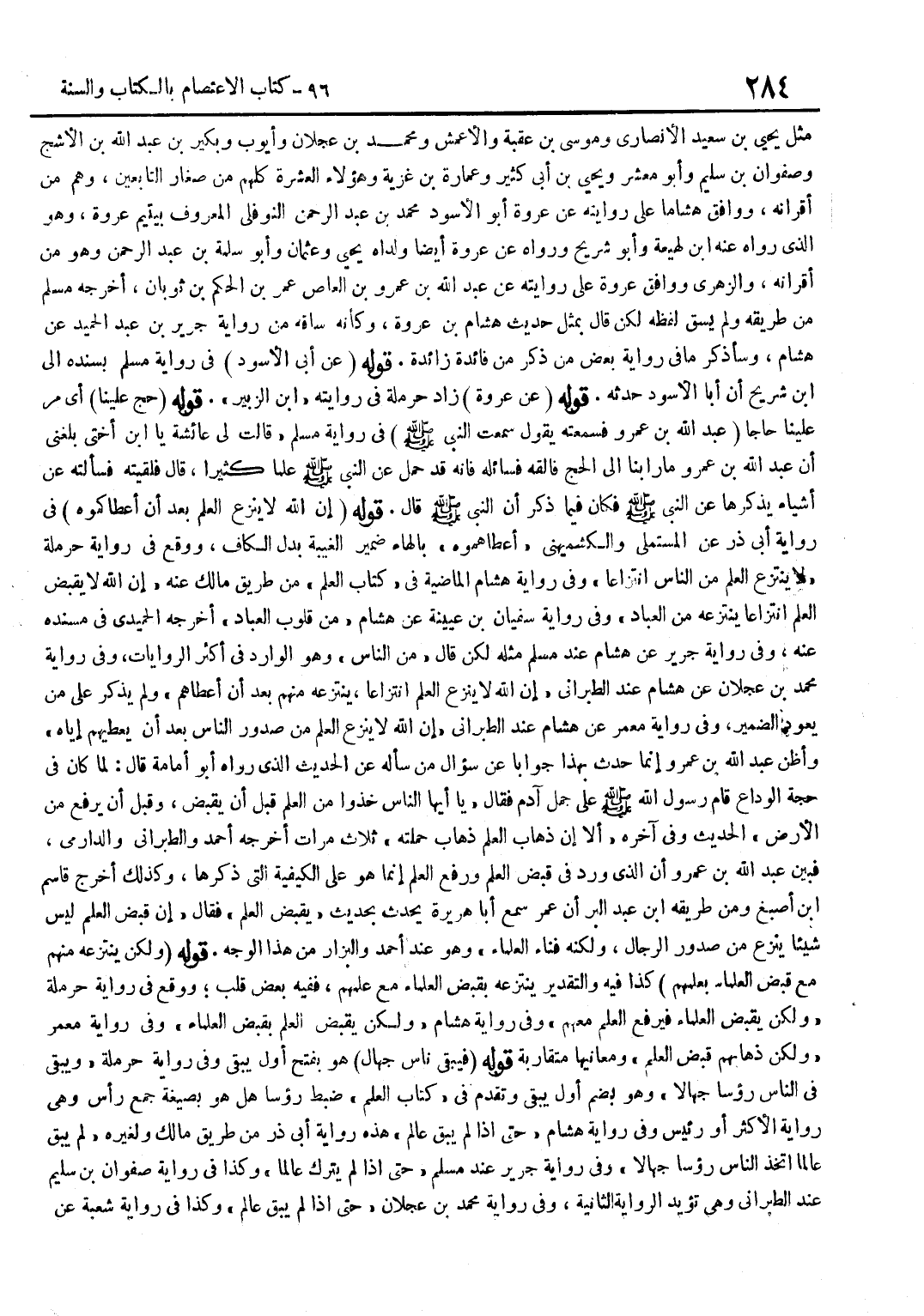 يَحْيَى بْنُ سَعِيدٍ الْأَنْصَارِيُّ وَمُوسَى بْنُ عُقْبَةَ وَالْأَعْمَشُ وَمُحَمَّدُ بْنُ عَجْلَانَ وَأَيُّوبُ وَبُكَيْرُ بْنُ عَبْدِ اللَّهِ بْنِ الْأَشَجِّ وَصَفْوَانُ بْنُ سُلَيْمٍ وَأَبُو مَعْشَرٍ وَيَحْيَى بْنُ أَبِي كَثِيرٍ وَعُمَارَةُ بْنُ غَزِيَّةَ وَهَؤُلَاءِ الْعَشَرَةُ كُلُّهُمْ مِنْ صِغَارِ التَّابِعِينَ وَهُمْ مِنْ أَقْرَانِهِ وَوَافَقَ هِشَامًا عَلَى رِوَايَتِهِ عَنْ عُرْوَةَ أَبُو الْأَسْوَدِ مُحَمَّدُ بْنُ عَبْدِ الرَّحْمَنِ النَّوْفَلِيُّ الْمَعْرُوفُ بِيَتِيمِ عُرْوَةَ وَهُوَ الَّذِي رَوَاهُ عَنهُ بن لَهِيعَةَ وَأَبُو شُرَيْحٍ وَرَوَاهُ عَنْ عُرْوَةَ أَيْضًا وَلَدَاهُ يَحْيَى وَعُثْمَانُ وَأَبُو سَلَمَةَ بْنُ عَبْدِ الرَّحْمَنِ وَهُوَ مِنْ أَقْرَانِهِ وَالزُّهْرِيُّ وَوَافَقَ عُرْوَةَ عَلَى رِوَايَتِهِ عَنْ عَبْدِ اللَّهِ بْنِ عَمْرِو بْنِ الْعَاصِ عُمَرُ بْنُ الْحَكَمِ بْنِ ثَوْبَانِ أَخْرَجَهُ مُسْلِمٌ مِنْ طَرِيقِهِ وَلَمْ يَسُقْ لَفْظَهُ لَكِنْ قَالَ بِمِثْلِ حَدِيثِ هِشَامِ بْنِ عُرْوَةَ وَكَأَنَّهُ سَاقَهُ مِنْ رِوَايَةِ جَرِيرِ بْنِ عَبْدِ الْحَمِيدِ عَنْ هِشَامٍ وَسَأَذْكُرُ مَا فِي رِوَايَةِ بَعْضِ مَنْ ذُكِرَ مِنْ فَائِدَةٍ زَائِدَةٍ قَوْلُهُ عَنْ أَبِي الْأَسْوَدِ فِي رِوَايَةِ مُسْلِمٍ بِسَنَدِهِ إِلَى بن شُرَيْحٍ أَنَّ أَبَا الْأَسْوَدِ حَدَّثَهُ قَوْلُهُ عَنْ عُرْوَة زَاد حَرْمَلَة فِي رِوَايَته بن الزُّبَيْرِ قَوْلُهُ حَجَّ عَلَيْنَا أَيْ مَرَّ عَلَيْنَا حَاجًّا عَبْدُ اللَّهِ بْنُ عَمْرٍو فَسَمِعْتُهُ يَقُولُ سَمِعْتُ النَّبِيِّ صَلَّى اللَّهُ عَلَيْهِ وَسَلَّمَ فِي رِوَايَةِ مُسلم قَالَت لي عَائِشَة يَا بن أُخْتِي بَلَغَنِي أَنَّ عَبْدَ اللَّهِ بْنَ عَمْرٍو مَارًّا بِنَا إِلَى الْحَجِّ فَالْقَهُ فَسَائِلْهُ فَإِنَّهُ قَدْ حَمَلَ عَنِ النَّبِيِّ صَلَّى اللَّهُ عَلَيْهِ وَسَلَّمَ عِلْمًا كَثِيرًا قَالَ فَلَقِيتُهُ فَسَأَلْتُهُ عَنْ أَشْيَاءَ يَذْكُرُهَا عَنِ النَّبِيِّ صَلَّى اللَّهُ عَلَيْهِ وَسَلَّمَ فَكَانَ فِيمَا ذَكَرَ أَنَّ النَّبِيَّ صَلَّى اللَّهُ عَلَيْهِ وَسَلَّمَ قَالَ قَوْلُهُ إِنَّ اللَّهَ لَا يَنْزِعُ الْعِلْمَ بَعْدَ أَنْ أَعْطَاكُمُوهُ فِي رِوَايَةِ أَبِي ذَرٍّ عَنِ الْمُسْتَمْلِي وَالْكُشْمِيهَنِيِّ أَعْطَاهُمُوهُ بِالْهَاءِ ضَمِيرُ الْغَيْبَةِ بَدَلَ الْكَافِ وَوَقَعَ فِي رِوَايَةِ حَرْمَلَةَ لَا يَنْتَزِعُ الْعِلْمَ مِنَ النَّاسِ انْتِزَاعًا وَفِي رِوَايَةِ هِشَامٍ الْمَاضِيَةِ فِي كِتَابِ الْعِلْمِ مِنْ طَرِيقِ مَالِكٍ عَنْهُ إِنَّ اللَّهَ لَا يَقْبِضُ الْعِلْمَ انْتِزَاعًا يَنْتَزِعُهُ مِنَ الْعِبَادِ وَفِي رِوَايَةِ سُفْيَانَ بْنِ عُيَيْنَةَ عَنْ هِشَامٍ مِنْ قُلُوبِ الْعِبَادِ أَخْرَجَهُ الْحُمَيْدِيُّ فِي مُسْنَدِهِ عَنْهُ وَفِي رِوَايَةِ جَرِيرٍ عَنْ هِشَامٍ عِنْدَ مُسْلِمٍ مِثْلُهُ لَكِنْ قَالَ مِنَ النَّاسِ وَهُوَ الْوَارِدُ فِي أَكْثَرِ الرِّوَايَاتِ وَفِي رِوَايَةِ مُحَمَّدِ بْنِ عَجْلَانَ عَنْ هِشَامٍ عِنْدَ الطَّبَرَانِيِّ إِنَّ اللَّهَ لَا يَنْزِعُ الْعِلْمَ انْتِزَاعًا يَنْتَزِعُهُ مِنْهُمْ بَعْدَ أَنْ أَعْطَاهُمْ وَلَمْ يَذْكُرْ عَلَى مَنْ يَعُودُ الضَّمِيرُ وَفِي رِوَايَةِ مَعْمَرٍ عَنْ هِشَامٍ عِنْدَ الطَّبَرَانِيِّ إِنَّ اللَّهَ لَا يَنْزِعُ الْعِلْمَ مِنْ صُدُورِ النَّاسِ بَعْدَ أَنْ يُعْطِيَهُمْ إِيَّاهُ وَأَظُنُّ عَبْدَ اللَّهِ بْنَ عَمْرٍو إِنَّمَا حَدَّثَ بِهَذَا جَوَابًا عَنْ سُؤَالِ مَنْ سَأَلَهُ عَنِ الْحَدِيثِ الَّذِي رَوَاهُ أَبُو أُمَامَةَ قَالَ لَمَّا كَانَ فِي حَجَّةِ الْوَدَاعِ قَامَ رَسُولُ اللَّهِ صَلَّى اللَّهُ عَلَيْهِ وَسَلَّمَ عَلَى جَمَلٍ آدَمَ فَ