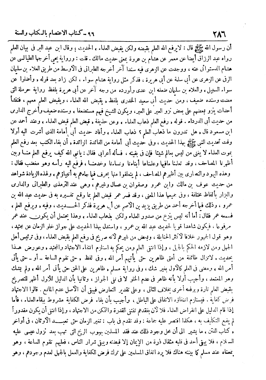 أَنَّ رَسُولَ اللَّهِ صَلَّى اللَّهُ عَلَيْهِ وَسَلَّمَ قَالَ لَا يَرْفَعُ اللَّهُ الْعِلْمَ بِقَبْضِهِ وَلَكِنْ يقبض الْعلمَاء الحَدِيث وَقَالَ بن عَبْدِ الْبَرِّ فِي بَيَانِ الْعِلْمِ رَوَاهُ عَبْدُ الرَّزَّاقِ أَيْضًا عَنْ مَعْمَرٍ عَنْ هِشَامِ بْنِ عُرْوَةَ بِمَعْنَى حَدِيثِ مَالِكٍ قُلْتُ وَرِوَايَةُ يَحْيَى أَخْرَجَهَا الطَّيَالِسِيُّ عَنْ هِشَامٍ الدَّسْتُوَائِيِّ عَنْهُ وَوَجَدْتُ عَنِ الزُّهْرِيِّ فِيهِ سَنَدًا آخَرَ أَخْرَجَهُ الطَّبَرَانِيُّ فِي الْأَوْسَطِ مِنْ طَرِيقِ الْعَلَاءِ بْنِ سُلَيْمَانَ الرَّقِّيِّ عَنِ الزُّهْرِيِّ عَنْ أَبِي سَلَمَةَ عَنْ أَبِي هُرَيْرَةَ فَذَكَرَ مِثْلَ رِوَايَةِ هِشَامٍ سَوَاءً لَكِنْ زَادَ بَعْدَ قَوْلِهِ وَأَضَلُّوا عَنْ سَوَاءِ السَّبِيل والْعَلَاء بن سُلَيْمَان ضعفه بن عَدِيٍّ وَأَوْرَدَهُ مِنْ وَجْهٍ آخَرَ عَنْ أَبِي هُرَيْرَةَ بِلَفْظِ رِوَايَةِ حَرْمَلَةَ الَّتِي مَضَتْ وَسَنَدُهُ ضَعِيفٌ وَمِنْ حَدِيثِ أَبِي سَعِيدٍ الْخُدْرِيِّ بِلَفْظِ يَقْبِضُ اللَّهُ الْعُلَمَاءَ وَيَقْبِضُ الْعِلْمَ مَعَهُمْ فَتَنْشَأُ أَحْدَاثٌ يَنْزُو بَعْضُهُمْ عَلَى بَعْضٍ نَزْوَ الْعِيرِ عَلَى الْعِيرِ وَيَكُونُ الشَّيْخُ فِيهِمْ مُسْتَضْعَفًا وَسَنَدُهُ ضَعِيفٌ وَأَخْرَجَ الدَّارِمِيُّ مِنْ حَدِيثِ أَبِي الدَّرْدَاءِ قَوْلَهُ رَفْعُ الْعِلْمِ ذَهَابُ الْعُلَمَاءِ وَعَنْ حُذَيْفَةَ قَبْضُ الْعِلْمِ قَبْضُ الْعُلَمَاءِ وَعِنْدَ أَحْمَدَ عَنِ بن مَسْعُودٍ قَالَ هَلْ تَدْرُونَ مَا ذَهَابُ الْعِلْمِ ذَهَابُ الْعُلَمَاءِ وَأَفَادَ حَدِيثُ أَبِي أُمَامَةَ الَّذِي أَشَرْتُ إِلَيْهِ أَوَّلًا وَقْتَ تَحْدِيثِ النَّبِيُّ صَلَّى اللَّهُ عَلَيْهِ وَسَلَّمَ بِهَذَا الْحَدِيثِ وَفِي حَدِيثِ أَبِي أُمَامَةَ مِنَ الْفَائِدَةِ الزَّائِدَةِ أَنَّ بَقَاءَ الْكُتُبِ بَعْدَ رَفْعِ الْعِلْمِ بِمَوْتِ الْعُلَمَاءِ لَا يُغْنِي مَنْ لَيْسَ بِعَالِمٍ شَيْئًا فَإِنَّ فِي بَقِيَّتِهِ فَسَأَلَهُ أَعْرَابِيٌّ فَقَالَ يَا نَبِيَّ اللَّهِ كَيْفَ يُرْفَعُ الْعِلْمُ مِنَّا وَبَيْنَ أَظْهُرِنَا الْمَصَاحِفُ وَقَدْ تَعَلَّمْنَا مَا فِيهَا وَعَلَّمْنَاهَا أَبْنَاءَنَا وَنِسَاءَنَا وَخَدَمَنَا فَرَفَعَ إِلَيْهِ رَأْسَهُ وَهُوَ مُغْضَبٌ فَقَالَ وَهَذِهِ الْيَهُودُ وَالنَّصَارَى بَيْنَ أَظْهُرِهِمُ الْمَصَاحِفُ لَمْ يَتَعَلَّقُوا مِنْهَا بِحَرْفٍ فِيمَا جَاءَهُمْ بِهِ أَنْبِيَاؤُهُمْ وَلِهَذِهِ الزِّيَادَةِ شَوَاهِدُ مِنْ حَدِيثِ عَوْفِ بْنِ مَالك وبن عَمْرٍو وَصَفْوَانَ بْنِ عَسَّالٍ وَغَيْرِهِمْ وَهِيَ عِنْدَ التِّرْمِذِيِّ وَالطَّبَرَانِيِّ وَالدَّارِمِيِّ وَالْبَزَّارِ بِأَلْفَاظٍ مُخْتَلِفَةٍ وَفِي جَمِيعِهَا هَذَا الْمَعْنَى وَقَدْ فَسَّرَ عُمَرُ قَبْضَ الْعِلْمِ بِمَا وَقَعَ تَفْسِيرُهُ بِهِ فِي حَدِيثِ عَبْدِ اللَّهِ بْنِ عَمْرٍو وَذَلِكَ فِيمَا أَخْرَجَهُ أَحْمَدُ مِنْ طَرِيقِ يَزِيدَ بْنِ الْأَصَمِّ عَنْ أَبِي هُرَيْرَةَ فَذَكَرَ الْحَدِيثَ وَفِيهِ وَيُرْفَعُ الْعِلْمُ فَسَمِعَهُ عُمَرُ فَقَالَ أَمَا إنَّهُ لَيْسَ يُنْزَعُ مِنْ صُدُورِ الْعُلَمَاءِ وَلَكِنْ بِذَهَابِ الْعُلَمَاءِ وَهَذَا يَحْتَمِلُ أَنْ يَكُونَ عِنْدَ عُمَرَ مَرْفُوعًا فَيَكُونُ شَاهِدًا قَوِيًّا لِحَدِيثِ عَبْدِ اللَّهِ بْنِ عَمْرٍو وَاسْتُدِلَّ بِهَذَا الْحَدِيثِ عَلَى جَوَازِ خُلُوِّ الزَّمَانِ عَنْ مُجْتَهِدٍ وَهُوَ قَوْلُ الْجُمْهُورِ خِلَافًا لِأَكْثَرِ الْحَنَابِلَةِ وَبَعْضٍ منْ غَيْرِهِمْ لِأَنَّهُ صَرِيحٌ فِي رَفْعِ الْعِلْمِ بِقَبْضِ الْعُلَمَاءِ وَفِي تَرْئِيسِ أَهْلِ الْجَهْلِ وَمِنْ لَازِمِهِ الْحُكْمُ بِالْجَهْلِ وَإِذَا انْتَفَى الْعِلْمُ وَمَنْ 