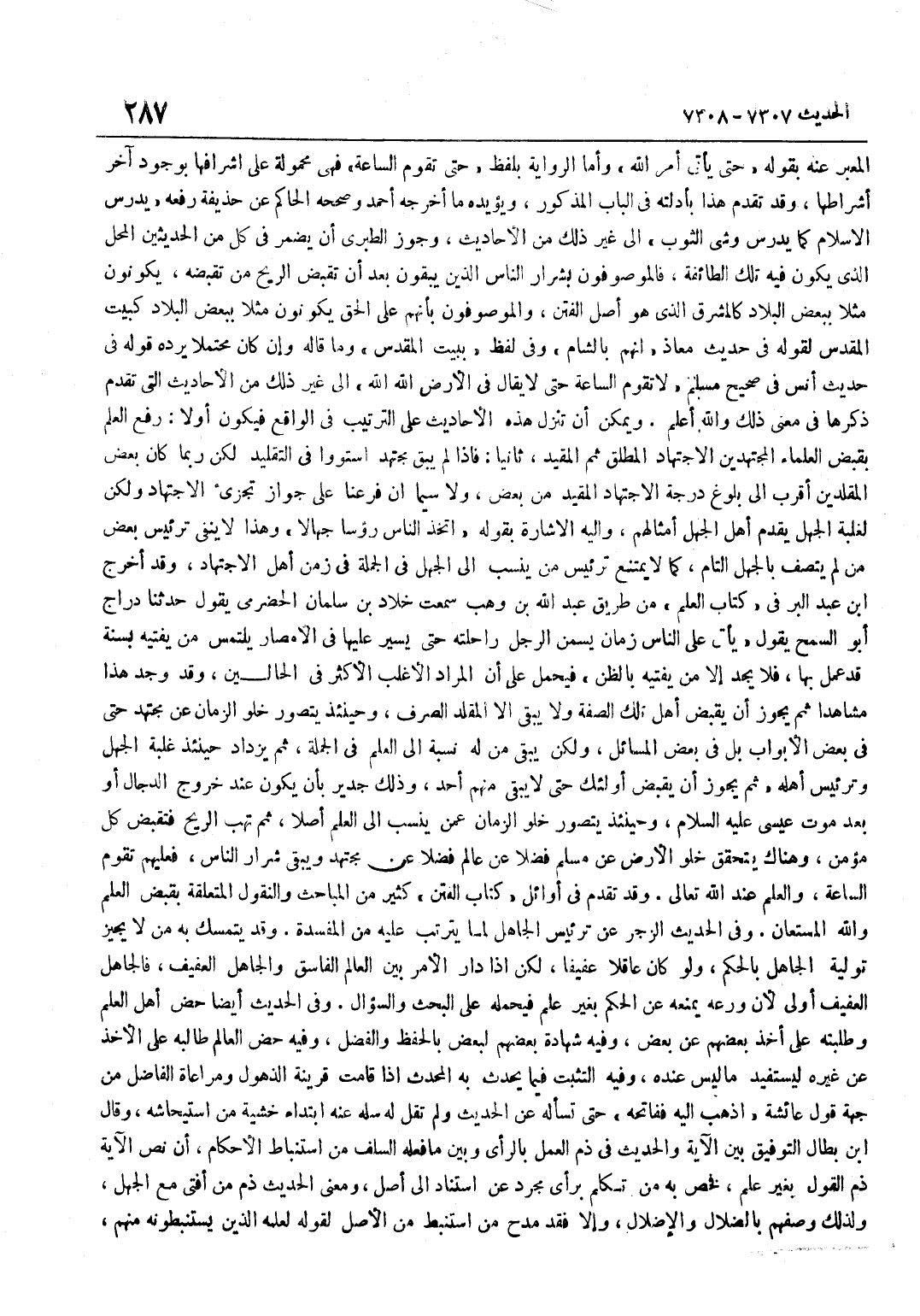 الْمُعَبَّرُ عَنْهُ بِقَوْلِهِ حَتَّى يَأْتِيَ أَمْرُ اللَّهِ وَأَمَّا الرِّوَايَةُ بِلَفْظِ حَتَّى تَقُومَ السَّاعَةُ فَهِيَ مَحْمُولَةٌ عَلَى إِشْرَافِهَا بِوُجُودِ آخِرِ أَشْرَاطِهَا وَقَدْ تَقَدَّمَ هَذَا بِأَدِلَّتِهِ فِي الْبَابِ الْمَذْكُورِ وَيُؤَيِّدُهُ مَا أَخْرَجَهُ أَحْمَدُ وَصَحَّحَهُ الْحَاكِمُ عَنْ حُذَيْفَةَ رَفَعَهُ يَدْرُسُ الْإِسْلَامُ كَمَا يَدْرُسُ وَشْيُ الثَّوْبِ إِلَى غَيْرِ ذَلِكَ مِنَ الْأَحَادِيثِ وَجَوَّزَ الطَّبَرِيُّ أَنْ يُضْمَرَ فِي كُلٍّ مِنَ الْحَدِيثَيْنِ الْمَحَلُّ الَّذِي يَكُونُ فِيهِ تِلْكَ الطَّائِفَةُ فَالْمَوْصُوفُونَ بِشِرَارِ النَّاسِ الَّذِينَ يَبْقَوْنَ بَعْدَ أَنْ تَقْبِضَ الرِّيحُ مَنْ تَقْبِضُهُ يَكُونُونَ مَثَلًا بِبَعْضِ الْبِلَادِ كَالْمَشْرِقِ الَّذِي هُوَ أَصْلُ الْفِتَنِ وَالْمَوْصُوفُونَ بِأَنَّهُمْ عَلَى الْحَقِّ يَكُونُونَ مَثَلًا بِبَعْضِ الْبِلَادِ كَبَيْتِ الْمَقْدِسِ لِقَوْلِهِ فِي حَدِيثِ مُعَاذٍ إِنَّهُمْ بِالشَّامِ وَفِي لَفْظٍ بِبَيْتِ الْمَقْدِسِ وَمَا قَالَهُ وَإِنْ كَانَ مُحْتَمَلًا يَرُدُّهُ قَوْلُهُ فِي حَدِيثِ أَنَسٍ فِي صَحِيحِ مُسْلِمٍ لَا تَقُومُ السَّاعَةُ حَتَّى لَا يُقَالَ فِي الْأَرْضِ اللَّهُ اللَّهُ إِلَى غَيْرِ ذَلِكَ مِنَ الْأَحَادِيثِ الَّتِي تَقَدَّمَ ذِكْرُهَا فِي مَعْنَى ذَلِكَ وَاللَّهُ أَعْلَمُ وَيُمْكِنُ أَنْ تَنْزِلَ هَذِهِ الْأَحَادِيثُ عَلَى التَّرْتِيبِ فِي الْوَاقِعِ فَيَكُونُ أَوَّلًا رَفْعُ الْعِلْمِ بِقَبْضِ الْعُلَمَاءِ الْمُجْتَهِدِينَ الِاجْتِهَادَ الْمُطْلَقَ ثُمَّ الْمُقَيَّدَ ثَانِيًا فَإِذَا لَمْ يَبْقَ مُجْتَهِدٌ اسْتَوَوْا فِي التَّقْلِيدِ لَكِنْ رُبَّمَا كَانَ بَعْضُ الْمُقَلِّدِينَ أَقْرَبَ إِلَى بُلُوغِ دَرَجَةِ الِاجْتِهَادِ الْمُقَيَّدِ مِنْ بَعْضٍ وَلَا سِيَّمَا إِنْ فَرَّعْنَا على جَوَاز تجزيء الِاجْتِهَادِ وَلَكِنْ لِغَلَبَةِ الْجَهْلِ يُقَدِّمُ أَهْلُ الْجَهْلِ أمثالهم واليه الْإِشَارَة بقوله اتخذ النَّاس رؤسا جُهَّالًا وَهَذَا لَا يَنْفِي تَرْئِيسَ بَعْضِ مَنْ لَمْ يَتَّصِفْ بِالْجَهْلِ التَّامِّ كَمَا لَا يَمْتَنِعُ تَرْئِيسُ مَنْ يُنْسَبُ إِلَى الْجَهْلِ فِي الْجُمْلَةِ فِي زمن أهل الِاجْتِهَاد وَقد أخرج بن عَبْدِ الْبَرِّ فِي كِتَابِ الْعِلْمِ مِنْ طَرِيقِ عَبْدِ اللَّهِ بْنِ وَهْبٍ سَمِعْتُ خَلَّادَ بْنَ سَلْمَانَ الْحَضْرَمِيَّ يَقُولُ حَدَّثَنَا دَرَّاجُ أَبُو السَّمْحِ يَقُولُ يَأْتِي عَلَى النَّاسِ زَمَانٌ يُسَمِّنُ الرَّجُلُ رَاحِلَتَهُ حَتَّى يَسِيرَ عَلَيْهَا فِي الْأَمْصَارِ يَلْتَمِسَ مَنْ يُفْتِيهِ بِسُنَّةٍ قَدْ عَمِلَ بِهَا فَلَا يَجِدَ إِلَّا مَنْ يُفْتِيهِ بِالظَّنِّ فَيُحْمَلُ عَلَى أَنَّ الْمُرَادَ الْأَغْلَبُ الْأَكْثَرُ فِي الْحَالَيْنِ وَقَدْ وُجِدَ هَذَا مُشَاهَدًا ثُمَّ يَجُوزُ أَنْ يُقْبَضَ أَهْلُ تِلْكَ الصِّفَةِ وَلَا يَبْقَى إِلَّا الْمُقَلِّدُ الصِّرْفُ وَحِينَئِذٍ يُتَصَوَّرُ خُلُوُّ الزَّمَانِ عَنْ مُجْتَهِدٍ حَتَّى فِي بَعْضِ الْأَبْوَابِ بَلْ فِي بَعْضِ الْمَسَائِلِ وَلَكِنْ يَبْقَى مَنْ لَهُ نِسْبَةٌ إِلَى الْعِلْمِ فِي الْجُمْلَةِ ثُمَّ يَزْدَادُ حِينَئِذٍ غَلَبَةُ الْجَهْلِ وَتَرْئِيسُ أَهْلِهِ ثُمَّ يَجُوزُ أَنْ يُقْبَضَ أُولَئِكَ حَتَّى لَا يَبْقَى مِنْهُمْ أَحَدٌ وَذَلِكَ جَدِيرٌ بِأَنْ يَكُونَ عِنْدَ خُرُوجِ الدَّجَّالِ أَوْ بَعْدَ مَوْتِ عِيسَى عَلَيْهِ السَّلَامُ وَحِينَئِذٍ يُتَصَوَّرُ خُلُوُّ الزَّمَانِ عَمَّنْ يُنْسَبُ إِلَى الْعِلْمِ أَصْلًا ثُمَّ تَهُبُّ الرِّيحُ فَتَقْبِضُ كُلَّ مُؤْمِنٍ وَهُنَاكَ يَتَحَقَّقُ خُلُوُّ الْأَرْضِ عَنْ مُسْلِمٍ فَضْلًا عَنْ عَالِمٍ فَضْل