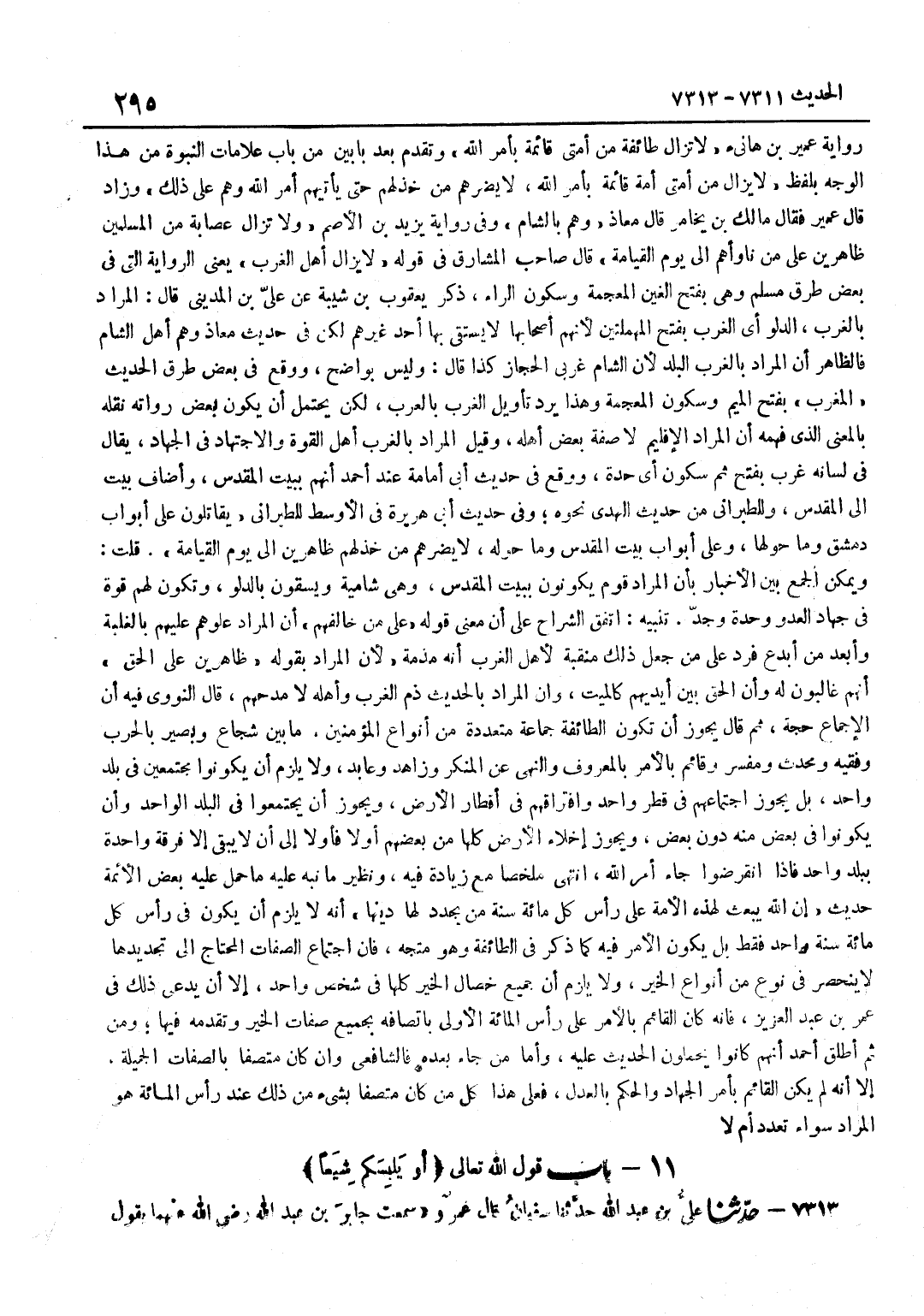رِوَايَةِ عُمَيْرِ بْنِ هَانِئٍ لَا تَزَالُ طَائِفَةٌ مِنْ أُمَّتِي قَائِمَةً بِأَمْرِ اللَّهِ وَتَقَدَّمَ بَعْدَ بَابَيْنِ مِنْ بَابِ عَلَامَاتِ النُّبُوَّةِ مِنْ هَذَا الْوَجْهِ بِلَفْظِ لَا يَزَالُ مِنْ أُمَّتِي أُمَّةٌ قَائِمَةً بِأَمْرِ اللَّهِ لَا يَضُرُّهُمْ مَنْ خَذَلَهُمْ حَتَّى يَأْتِيَهُمْ أَمْرُ اللَّهِ وَهُمْ عَلَى ذَلِكَ وَزَادَ قَالَ عُمَيْرٌ فَقَالَ مَالِكُ بْنُ يُخَامِرَ قَالَ مُعَاذٌ وَهُمْ بِالشَّامِ وَفِي رِوَايَةِ يَزِيدَ بْنِ الْأَصَمِّ وَلَا تَزَالُ عِصَابَةٌ مِنَ الْمُسْلِمِينَ ظَاهِرِينَ عَلَى مَنْ نَاوَأَهُمْ إِلَى يَوْمِ الْقِيَامَةِ قَالَ صَاحِبُ الْمَشَارِقِ فِي قَوْلِهِ لَا يَزَالُ أَهْلُ الْغَرْبِ يَعْنِي الرِّوَايَةَ الَّتِي فِي بَعْضِ طُرُقِ مُسْلِمٍ وَهِيَ بِفَتْحِ الْغَيْنِ الْمُعْجَمَةِ وَسُكُونِ الرَّاءِ ذَكَرَ يَعْقُوبُ بْنُ شَيْبَةَ عَنْ عَلِيِّ بْنِ الْمَدِينِيِّ قَالَ الْمُرَادُ بِالْغَرْبِ الدَّلْوُ أَيِ الغرب بِفَتْحِ الْمُهْمَلَتَيْنِ لِأَنَّهُمْ أَصْحَابُهَا لَا يَسْتَقِي بِهَا أَحَدٌ غَيْرُهُمْ لَكِنْ فِي حَدِيثِ مُعَاذٍ وَهُمْ أَهْلُ الشَّامِ فَالظَّاهِرُ أَنَّ الْمُرَادَ بِالْغَرْبِ الْبَلَدُ لِأَن الشَّام غربي الْحجاز كَذَا قَالَ وَلَيْسَ بِوَاضِحٍ وَوَقَعَ فِي بَعْضِ طُرُقِ الْحَدِيثِ الْمَغْرِبُ بِفَتْحِ الْمِيمِ وَسُكُونِ الْمُعْجَمَةِ وَهَذَا يَرُدُّ تَأْوِيلَ الْغَرْبِ بِالْعَرَبِ لَكِنْ يَحْتَمِلُ أَنْ يَكُونَ بَعْضُ رُوَاتِهِ نَقَلَهُ بِالْمَعْنَى الَّذِي فَهِمَهُ أَنَّ الْمُرَادَ الْإِقْلِيمُ لَا صِفَةُ بَعْضِ أَهْلِهِ وَقِيلَ الْمُرَادُ بِالْغَرْبِ أَهْلُ الْقُوَّةِ وَالِاجْتِهَادِ فِي الْجِهَادِ يُقَالُ فِي لِسَانِهِ غَرْبٌ بِفَتْحٍ ثُمَّ سُكُونٍ أَيْ حِدَّةٌ وَوَقَعَ فِي حَدِيثِ أَبِي أُمَامَةَ عِنْدَ أَحْمَدَ أَنَّهُمْ بِبَيْتِ الْمَقْدِسِ وَأَضَافَ بَيْتَ إِلَى الْمَقْدِسِ ولِلطَّبَرَانِيِّ مِنْ حَدِيثِ النَّهْدِيِّ نَحْوُهُ وَفِي حَدِيثِ أَبِي هُرَيْرَةَ فِي الْأَوْسَطِ لِلطَّبَرَانِيِّ يُقَاتِلُونَ عَلَى أَبْوَابِ دِمَشْقَ وَمَا حَوْلَهَا وَعَلَى أَبْوَابِ بَيْتِ الْمَقْدِسِ وَمَا حَوْلَهُ لَا يَضُرُّهُمْ مَنْ خَذَلَهُمْ ظَاهِرِينَ إِلَى يَوْمِ الْقِيَامَةِ قُلْتُ وَيُمْكِنُ الْجَمْعُ بَيْنَ الْأَخْبَارِ بِأَنَّ الْمُرَادَ قَوْمٌ يَكُونُونَ بِبَيْتِ الْمَقْدِسِ وَهِيَ شَامِيَّةٌ وَيَسْقُونَ بِالدَّلْوِ وَتَكُونُ لَهُمْ قُوَّةٌ فِي جِهَادِ الْعَدُوِّ وَحِدَّةٌ وَجِدٌّ تَنْبِيهٌ اتَّفَقَ الشُّرَّاحُ عَلَى أَنَّ مَعْنَى قَوْلِهِ عَلَى مَنْ خَالَفَهُمْ أَنَّ الْمُرَادَ عُلُوُّهُمْ عَلَيْهِمْ بِالْغَلَبَةِ وَأَبْعَدَ مَنْ أَبْدَعَ فَرَدَّ عَلَى مَنْ جَعَلَ ذَلِكَ مَنْقَبَةً لِأَهْلِ الْغَرْبِ أَنَّهُ مَذَمَّةٌ لِأَنَّ الْمُرَادَ بِقَوْلِهِ ظَاهِرِينَ عَلَى الْحَقِّ أَنَّهُمْ غَالِبُونَ لَهُ وَأَنَّ الْحَقَّ بَيْنَ أَيْدِيهِمْ كَالْمَيِّتِ وَأَنَّ الْمُرَادَ بِالْحَدِيثِ ذَمُّ الْغَرْبِ وَأَهْلِهِ لَا مَدْحُهُمْ قَالَ النَّوَوِيُّ فِيهِ أَنَّ الْإِجْمَاعَ حُجَّةٌ ثُمَّ قَالَ يَجُوزُ أَنْ تَكُونَ الطَّائِفَةُ جَمَاعَةً مُتَعَدِّدَةً مِنْ أَنْوَاعِ الْمُؤْمِنِينَ مَا بَيْنَ شُجَاعٍ وَبَصِيرٍ بِالْحَرْبِ وَفَقِيهٍ وَمُحَدِّثٍ وَمُفَسِّرٍ وَقَائِمٍ بِالْأَمْرِ بِالْمَعْرُوفِ وَالنَّهْيِ عَنِ الْمُنْكَرِ وَزَاهِدٍ وَعَابِدٍ وَلَا يَلْزَمُ أَنْ يَكُونُوا مُجْتَمَعِينَ فِي بَلَدٍ وَاحِدٍ بَلْ يَجُوزُ اجْتِمَاعُهُمْ فِي قُطْرٍ وَاحِدٍ وَافْتِرَاقُهُمْ فِي أَقْطَارِ الْأَرْضِ وَيَجُوزُ أَنْ يَجْتَمِعُوا فِي الْبَلَدِ الْوَاحِدِ وَأَنْ يَكُونُوا فِي بَعْضٍ مِنْهُ دُونَ بَعْضٍ وَ