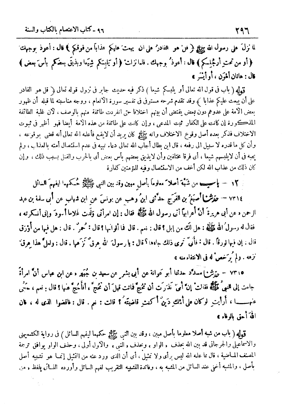 [7313] قُلْ هُوَ الْقَادِرُ عَلَى أَنْ يَبْعَثَ عَلَيْكُمْ عذَابا وَقَدْ تَقَدَّمَ شَرْحُهُ مُسْتَوْفًى فِي تَفْسِيرِ سُورَةِ الْأَنْعَامِ وَوَجْهُ مُنَاسَبَتِهِ لِمَا قَبْلَهُ أَنَّ ظُهُورَ بَعْضِ الْأُمَّةِ عَلَى عَدُوِّهُمْ دُونَ بَعْضٍ يَقْتَضِي أَنَّ بَيْنَهُمُ اخْتِلَافًا حَتَّى انْفَرَدَتْ طَائِفَةٌ مِنْهُمْ بِالْوَصْفِ لِأَنَّ غَلَبَةَ الطَّائِفَةِ الْمَذْكُورَةِ إِنْ كَانَتْ عَلَى الْكُفَّارِ ثَبَتَ الْمُدَّعَى وَإِنْ كَانَتْ عَلَى طَائِفَةٍ مِنْ هَذِهِ الْأُمَّةِ أَيْضًا فَهُوَ أَظْهَرُ فِي ثُبُوتِ الِاخْتِلَافِ فَذَكَرَ بَعْدَهُ أَصْلَ وُقُوعِ الِاخْتِلَافِ وَأَنَّهُ صَلَّى اللَّهُ عَلَيْهِ وَسَلَّمَ كَانَ يُرِيدُ أَنْ لَا يَقَعَ فَأَعْلَمَهُ اللَّهُ تَعَالَى أَنَّهُ قَضَى بِوُقُوعِهِ وَأَنَّ كُلَّ مَا قَدَّرَهُ لَا سَبِيل إِلَى رَفعه قَالَ بن بَطَّالٍ أَجَابَ اللَّهُ تَعَالَى دُعَاءَ نَبِيِّهِ فِي عَدَمِ اسْتِئْصَالِ أُمَّتِهِ بِالْعَذَابِ وَلَمْ يُجِبْهُ فِي أَنْ لَا يُلْبِسَهُمْ شِيَعًا أَيْ فِرَقًا مُخْتَلِفِينَ وَأَنْ لَا يُذِيقَ بَعْضَهُمْ بَأْسَ بَعْضٍ أَيْ بِالْحَرْبِ وَالْقَتْلِ بِسَبَبِ ذَلِكَ وَإِنْ كَانَ ذَلِكَ مِنْ عَذَابِ اللَّهِ لَكِنْ أَخَفُّ مِنَ الِاسْتِئْصَالِ وَفِيه للْمُؤْمِنين كَفَّارَة