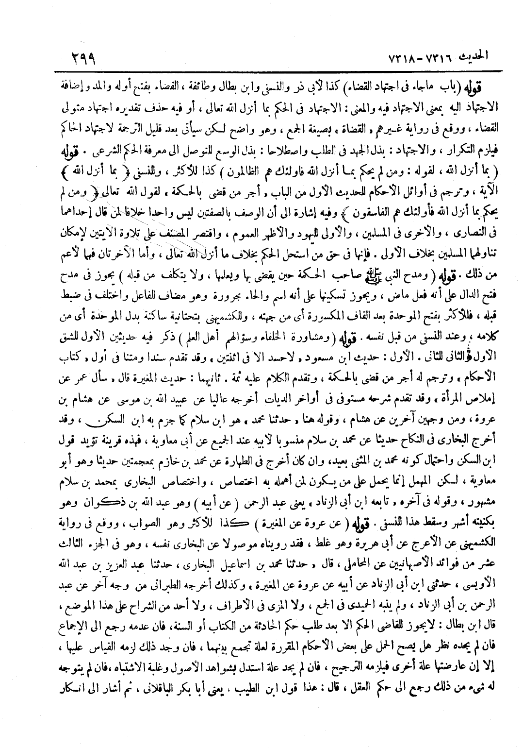 [7317] هُنَا حَدثنَا مُحَمَّد هُوَ بن سَلام كَمَا جزم بِهِ بن السَّكَنِ وَقَدْ أَخْرَجَ الْبُخَارِيُّ فِي النِّكَاحِ حَدِيثًا عَنْ مُحَمَّدِ بْنِ سَلَّامٍ مَنْسُوبًا لِأَبِيهِ عِنْدَ الْجَمِيعِ عَنْ أَبِي مُعَاوِيَةَ فَهَذِهِ قَرِينَةٌ تُؤَيِّدُ قَول بن السَّكَنِ وَاحْتِمَالُ كَوْنِهِ مُحَمَّدَ بْنَ الْمُثَنَّى بَعِيدٌ وَإِنْ كَانَ أَخْرَجَ فِي الطَّهَارَةِ عَنْ مُحَمَّدِ بْنِ خَازِمٍ بِمُعْجَمَتَيْنِ حَدِيثًا وَهُوَ أَبُو مُعَاوِيَةَ لَكِنَّ الْمُهْمَلَ إِنَّمَا يُحْمَلُ عَلَى مَنْ يَكُونُ لِمَنْ أَهْمَلَهُ بِهِ اخْتِصَاصٌ وَاخْتِصَاصُ الْبُخَارِيِّ بِمُحَمَّدِ بْنِ سَلَّامٍ مَشْهُورٌ وَقَوْلُهُ فِي آخِرِهِ تَابَعَهُ بن أَبِي الزِّنَادِ يَعْنِي عَبْدَ الرَّحْمَنِ عَنْ أَبِيهِ وَهُوَ عَبْدُ اللَّهِ بْنُ ذَكْوَانَ وَهُوَ بِكُنْيَتِهِ أَشْهَرُ وَسَقَطَ هَذَا لِلنَّسَفِيِّ قَوْلُهُ عَنْ عُرْوَةَ عَنِ الْمُغِيرَةِ كَذَا لِلْأَكْثَرِ وَهُوَ الصَّوَابُ وَوَقَعَ فِي رِوَايَةِ الْكُشْمِيهَنِيِّ عَنِ الْأَعْرَجِ عَنْ أَبِي هُرَيْرَةَ وَهُوَ غَلَطٌ فَقَدْ رُوِّينَاهُ مَوْصُولًا عَنِ الْبُخَارِيِّ نَفْسِهِ وَهُوَ فِي الْجُزْءِ الثَّالِثَ عَشَرَ مِنْ فَوَائِدِ الْأَصْبَهَانِيِّينَ عَنِ الْمُحَامِلِيِّ قَالَ حَدَّثَنَا مُحَمَّدُ بْنُ إِسْمَاعِيلَ الْبُخَارِيُّ حَدَّثَنَا عَبْدُ الْعَزِيزِ بن عبد الله الأويسي حَدثنِي بن أَبِي الزِّنَادِ عَنْ أَبِيهِ عَنْ عُرْوَةَ عَنِ الْمُغِيرَةِ وَكَذَلِكَ أَخْرَجَهُ الطَّبَرَانِيُّ مِنْ وَجْهٍ آخَرَ عَنْ عَبْدِ الرَّحْمَنِ بْنِ أَبِي الزِّنَادِ وَلَمْ يُنَبِّهِ الْحُمَيْدِيُّ فِي الْجَمْعِ وَلَا الْمِزِّيُّ فِي الْأَطْرَافِ وَلَا أَحَدٌ مِنَ الشُّرَّاحِ عَلَى هَذَا الْموضع قَالَ بن بَطَّالٍ لَا يَجُوزُ لِلْقَاضِي الْحُكْمُ إِلَّا بَعْدَ طَلَبِ حُكْمِ الْحَادِثَةِ مِنَ الْكِتَابِ أَوِ السُّنَّةِ فَإِنْ عَدِمَهُ رَجَعَ إِلَى الْإِجْمَاعِ فَإِنْ لَمْ يَجِدْهُ نَظَرَ هَلْ يَصِحُّ الْحَمْلُ عَلَى بَعْضِ الْأَحْكَامِ الْمُقَرَّرَةِ لِعِلَّةٍ تَجْمَعُ بَيْنَهُمَا فَإِنْ وَجَدَ ذَلِكَ لَزِمَهُ الْقِيَاسُ عَلَيْهَا إِلَّا إِنْ عَارَضَتْهَا عِلَّةٌ أُخْرَى فَيَلْزَمُهُ التَّرْجِيحُ فَإِنْ لَمْ يَجِدْ عِلَّةً اسْتَدَلَّ بِشَوَاهِدِ الْأُصُولِ وَغَلَبَةِ الِاشْتِبَاهِ فَإِنْ لَمْ يَتَوَجَّهْ لَهُ شَيْءٌ مِنْ ذَلِكَ رَجَعَ إِلَى حكم الْعقل قَالَ هَذَا قَول بن الطَّيِّبِ يَعْنِي أَبَا بَكْرٍ الْبَاقِلَّانِيَّ ثُمَّ أَشَارَ إِلَى إِنْكَار