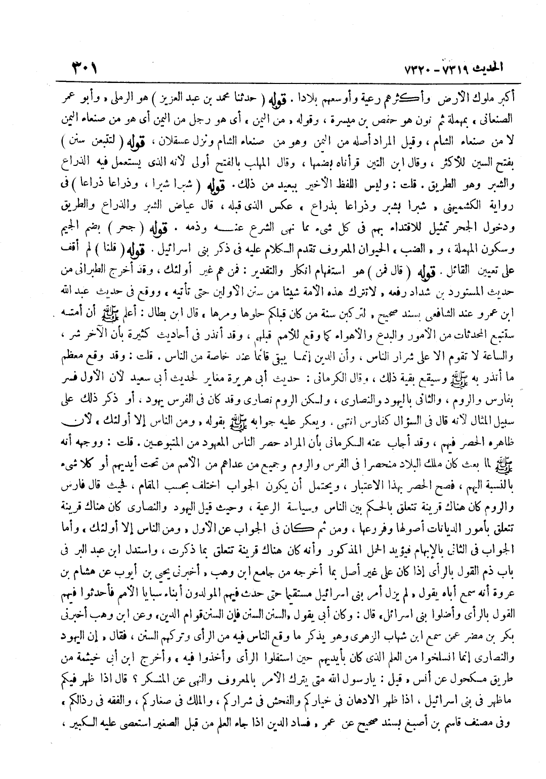 [7320] قَوْلُهُ حَدَّثَنَا مُحَمَّدُ بْنُ عَبْدِ الْعَزِيزِ هُوَ الرَّمْلِيُّ وَأَبُو عُمَرَ الصَّنْعَانِيُّ بِمُهْمَلَةٍ ثُمَّ نُونٍ هُوَ حَفْصُ بْنُ مَيْسَرَةَ وَقَوْلُهُ مِنَ الْيَمَنِ أَيْ هُوَ رَجُلٌ مِنَ الْيَمَنِ أَيْ هُوَ مِنْ صَنْعَاءِ الْيَمَنِ لَا مِنْ صَنْعَاءِ الشَّامِ وَقِيلَ الْمُرَادُ أَصْلُهُ مِنَ الْيَمَنِ وَهُوَ مِنْ صَنْعَاءِ الشَّامِ وَنَزَلَ عَسْقَلَانَ قَوْلُهُ لَتَتَّبِعُنَّ سَنَنَ بِفَتْح السِّين للْأَكْثَر وَقَالَ بن التِّينِ قَرَأْنَاهُ بِضَمِّهَا وَقَالَ الْمُهَلَّبُ بِالْفَتْحِ أَوْلَى لِأَنَّهُ الَّذِي يُسْتَعْمَلُ فِيهِ الذِّرَاعُ وَالشِّبْرُ وَهُوَ الطَّرِيقُ قُلْتُ وَلَيْسَ اللَّفْظُ الْأَخِيرُ بِبَعِيدٍ مِنْ ذَلِكَ قَوْلُهُ شِبْرًا شِبْرًا وَذِرَاعًا ذِرَاعًا فِي رِوَايَةِ الْكُشْمِيهَنِيِّ شِبْرًا بِشِبْرٍ وَذِرَاعًا بِذِرَاعٍ عَكْسَ الَّذِي قَبْلَهُ قَالَ عِيَاضٌ الشِّبْرُ وَالذِّرَاعُ وَالطَّرِيقُ وَدُخُولُ الْجُحْرِ تَمْثِيلٌ لِلِاقْتِدَاءِ بِهِمْ فِي كُلِّ شَيْءٍ مِمَّا نَهَى الشَّرْعُ عَنْهُ وَذَمَّهُ قَوْلُهُ جُحر بِضَم الْجِيم وَسُكُون الْمُهْملَة والضب الْحَيَوَانُ الْمَعْرُوفُ تَقَدَّمَ الْكَلَامِ عَلَيْهِ فِي ذِكْرِ بَنِي إِسْرَائِيلَ قَوْلُهُ قُلْنَا لَمْ أَقِفْ عَلَى تَعْيِينِ الْقَائِلِ قَوْلُهُ قَالَ فَمَنْ هُوَ اسْتِفْهَامُ إِنْكَارٍ وَالتَّقْدِيرُ فَمَنْ هُمْ غَيْرُ أُولَئِكَ وَقَدْ أَخْرَجَ الطَّبَرَانِيُّ مِنْ حَدِيثِ الْمُسْتَوْرِدِ بْنِ شَدَّادٍ رَفَعَهُ لَا تَتْرُكْ هَذِهِ الْأُمَّةُ شَيْئًا مِنْ سُنَنِ الْأَوَّلِينَ حَتَّى تَأْتِيَهُ وَوَقَعَ فِي حَدِيثِ عَبْدِ اللَّهِ بْنِ عَمْرٍو عِنْدَ الشَّافِعِيِّ بِسَنَدٍ صَحِيحٍ لَتَرْكَبُنَّ سُنَّةَ مَنْ كَانَ قَبْلَكُمْ حُلْوَهَا ومرها قَالَ بن بَطَّالٍ أَعْلَمَ صَلَّى اللَّهُ عَلَيْهِ وَسَلَّمَ أَنَّ أُمَّتَهُ سَتَتَّبِعُ الْمُحْدَثَاتِ مِنَ الْأُمُورِ وَالْبِدَعِ وَالْأَهْوَاءِ كَمَا وَقَعَ لِلْأُمَمِ قَبْلَهُمْ وَقَدْ أَنْذَرَ فِي أَحَادِيثَ كَثِيرَةٍ بِأَنَّ الْآخِرَ شَرٌّ وَالسَّاعَةُ لَا تَقُومُ إِلَّا عَلَى شِرَارِ النَّاسِ وَأَنَّ الدِّينَ إِنَّمَا يَبْقَى قَائِمًا عِنْدَ خَاصَّةٍ مِنَ النَّاسِ قُلْتُ وَقَدْ وَقَعَ مُعْظَمُ مَا أَنْذَرَ بِهِ صَلَّى اللَّهُ عَلَيْهِ وَسَلَّمَ وَسَيَقَعُ بَقِيَّةُ ذَلِكَ وَقَالَ الْكِرْمَانِيُّ حَدِيثُ أَبِي هُرَيْرَةَ مُغَايِرٌ لِحَدِيثِ أَبِي سَعِيدٍ لِأَنَّ الْأَوَّلَ فَسَّرَ بِفَارِسَ وَالرُّومِ وَالثَّانِي باليهود وَالنَّصَارَى وَلَكِن الرُّومَ نَصَارَى وَقَدْ كَانَ فِي الْفُرْسِ يَهُودٌ أَوْ ذَكَرَ ذَلِكَ عَلَى سَبِيلِ الْمِثَالِ لِأَنَّهُ قَالَ فِي السُّؤَال كفارس انْتهى وَيُعَكر عَلَيْهِ جَوَابَهُ صَلَّى اللَّهُ عَلَيْهِ وَسَلَّمَ بِقَوْلِهِ وَمَنِ النَّاسُ إِلَّا أُولَئِكَ لِأَنَّ ظَاهِرَهُ الْحَصْرُ فِيهِمْ وَقَدْ أَجَابَ عَنْهُ الْكِرْمَانِيُّ بِأَنَّ الْمُرَادَ حَصْرُ النَّاسِ الْمَعْهُودَ مِنَ الْمَتْبُوعِينَ قُلْتُ وَوَجْهُهُ أَنَّهُ صَلَّى اللَّهُ عَلَيْهِ وَسَلَّمَ لَمَّا بُعِثَ كَانَ مُلْكُ الْبِلَادِ مُنْحَصِرًا فِي الْفُرْسِ وَالرُّومِ وَجَمِيعُ مَنْ عَدَاهُمْ مِنَ الْأُمَمِ مِنْ تَحْتِ أَيْدِيهِمْ أَوْ كَلَا شَيْءٍ بِالنِّسْبَةِ إِلَيْهِمْ فَصَحَّ الْحَصْرُ بِهَذَا الِاعْتِبَارِ وَيُحْتَمَلُ أَنْ يَكُونَ الْجَوَابُ اخْتَلَفَ بِحَسَبِ الْمَقَامِ فَحَيْثُ قَالَ فَارِسُ وَالرُّومُ كَانَ هُنَاكَ قَرِينَةٌ تَتَعَلَّقُ بِالْحُكْمِ بَيْنَ النَّاسِ وَسِيَاسَةِ الرَّعِيَّةِ وَحَيْثُ قِيلَ الْيَهُودُ وَالنَّصَارَى كَانَ هُنَاكَ قَرِينَةٌ تَتَعَلَّقُ بِأُمُورِ الدِّيَانَاتِ أُصُولِه