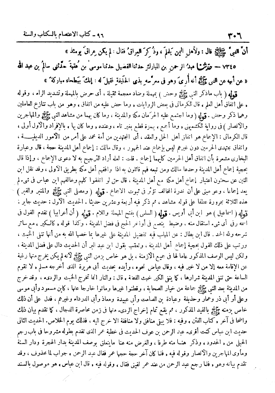[7322] قَوْله إِسْمَاعِيل هُوَ بن أَبِي أُوَيْسٍ قَوْلُهُ السَّلَمِيِّ بِفَتْحِ الْمُهْمَلَةِ وَاللَّامِ قَوْلُهُ أَنَّ أَعْرَابِيًّا تَقَدَّمَ الْقَوْلُ فِي اسْمِهِ وَفِي أَيِّ شَيْءٍ اسْتَقَالَ مِنْهُ وَضَبْطُ يَنْصَعُ فِي أَوَاخِرِ الْحَجِّ فِي فَضْلِ الْمَدِينَةِ وَكَذَا قَوْلُهُ كَالْكِيرِ مَعَ سَائِرِ شَرْحِهِ وَلِلَّهِ الْحَمْدُ قَالَ بن بَطَّالٍ عَنِ الْمُهَلَّبِ فِيهِ تَفْضِيلُ الْمَدِينَةِ عَلَى غَيْرِهَا بِمَا خَصَّهَا اللَّهُ بِهِ مِنْ أَنَّهَا تَنْفِي الْخَبَثَ وَرَتَّبَ عَلَى ذَلِكَ الْقَوْلَ بِحُجِّيَّةِ إِجْمَاع أهل الْمَدِينَة وَتعقب بقول بن عَبْدِ الْبَرِّ أَنَّ الْحَدِيثَ دَالٌّ عَلَى فَضْلِ الْمَدِينَةِ وَلَكِنْ لَيْسَ الْوَصْفُ الْمَذْكُورُ عَامًّا لَهَا فِي جَمِيعِ الْأَزْمِنَةِ بَلْ هُوَ خَاصٌّ بِزَمَنِ النَّبِيِّ صَلَّى اللَّهُ عَلَيْهِ وَسَلَّمَ لِأَنَّهُ لَمْ يَكُنْ يَخْرُجُ مِنْهَا رَغْبَةً عَنِ الْإِقَامَةِ مَعَهُ إِلَّا مَنْ لَا خَيْرَ فِيهِ وَقَالَ عِيَاضٌ نَحْوَهُ وَأَيَّدَهُ بِحَدِيثِ أَبِي هُرَيْرَةَ الَّذِي أَخْرَجَهُ مُسْلِمٍ لَا تَقُومُ السَّاعَةُ حَتَّى تَنْفِيَ الْمَدِينَةُ شِرَارَهَا كَمَا يَنْفِي الْكِيرُ خَبَثَ الْفِضَّةِ قَالَ وَالنَّارُ إِنَّمَا تُخْرِجُ الْخَبَثَ وَالرَّدِيءَ وَقَدْ خَرَجَ مِنَ الْمَدِينَةِ بَعْدَ النَّبِيِّ صَلَّى اللَّهُ عَلَيْهِ وَسَلَّمَ جَمَاعَةٌ مِنَ خِيَارِ الصَّحَابَةِ وَقَطَنُوا غَيْرَهَا وَمَاتُوا خَارِجًا عَنْهَا كَابْنِ مَسْعُودٍ وَأَبِي مُوسَى وَعَلِيٍّ أَوْ أَبِي ذَرٍّ وَعَمَّارٍ وَحُذَيْفَةَ وَعُبَادَةَ بْنِ الصَّامِتِ وَأَبِي عُبَيْدَةَ وَمُعَاذٍ وَأَبِي الدَّرْدَاءِ وَغَيْرِهِمْ فَدَلَّ عَلَى أَنَّ ذَلِكَ خَاصٌّ بِزَمَنِهِ صَلَّى اللَّهُ عَلَيْهِ وَسَلَّمَ بِالْقَيْدِ الْمَذْكُورِ ثُمَّ يَقَعُ تَمَامُ إِخْرَاجِ الرَّدِيءِ مِنْهَا فِي زَمَنِ مُحَاصَرَةِ الدَّجَّالِ كَمَا تَقَدَّمَ بَيَانُ ذَلِكَ وَاضِحًا فِي آخَرِ كِتَابِ الْفِتَنِ وَفِيهِ فَلَا يَبْقَى مُنَافِقٌ وَلَا مُنَافِقَةٌ إِلَّا خَرَجَ إِلَيْهِ فَذَلِكَ يَوْم الْخَلَاص الحَدِيث الثَّانِي حَدِيث بن عَبَّاسٍ كُنْتُ أُقْرِئُ عَبْدَ الرَّحْمَنِ بْنَ عَوْفٍ الْحَدِيثَ فِي خُطْبَةِ عُمَرَ الَّذِي تَقَدَّمَ بِطُولِهِ مَشْرُوحًا فِي بَابِ رَجْمِ الْحُبْلَى مِنَ الْحُدُودِ وَذَكَرَ هُنَا مِنْهُ طَرَفًا وَالْغَرَضُ مِنْهُ هُنَا مَا يَتَعَلَّقُ بِوَصْفِ الْمَدِينَةِ بِدَارِ الْهِجْرَةِ وَدَارِ السُّنَّةِ وَمَأْوَى الْمُهَاجِرِينَ وَالْأَنْصَارِ وَقَوْلُهُ فِيهِ فَلَمَّا كَانَ آخِرُ حَجَّةٍ حَجَّهَا عُمَرُ فَقَالَ عَبْدُ الرَّحْمَنِ جَوَابُ لَمَّا مَحْذُوفٌ وَقَدْ تَقَدَّمَ بَيَانُهُ وَهُوَ فَلَمَّا رَجَعَ عَبْدُ الرَّحْمَنِ مِنْ عِنْدِ عمر لَقِيَنِي فَقَالَ وَقَوله فِيهِ قَالَ بن عَبَّاسٍ هُوَ مَوْصُولٌ بِالسَّنَدِ