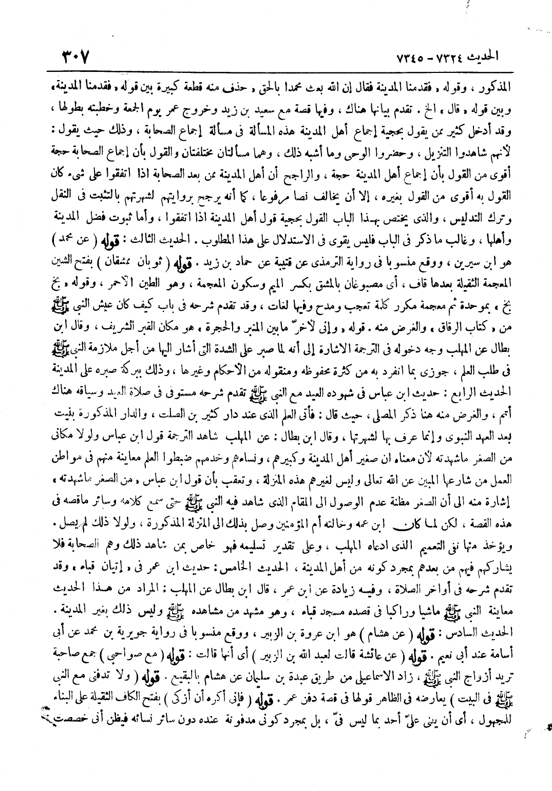 [7323] قَوْله عَن مُحَمَّد هُوَ بن سِيرِينَ وَوَقَعَ مَنْسُوبًا فِي رِوَايَةِ التِّرْمِذِيِّ عَنْ قُتَيْبَةَ عَنْ حَمَّادِ بْنِ زَيْدٍ قَوْلُهُ ثَوْبَانِ مُمَشَّقَانِ بِفَتْحِ الشِّينِ الْمُعْجَمَةِ الثَّقِيلَةِ بَعْدَهَا قَافٌ أَيْ مَصْبُوغَانِ بِالْمِشْقِ بِكَسْرِ الْمِيمِ وَسُكُونِ الْمُعْجَمَةِ وَهُوَ الطِّينُ الْأَحْمَرُ وَقَوْلُهُ بَخٍ بَخٍ بِمُوَحَّدَةٍ ثُمَّ مُعْجَمَةٍ مُكَرَّرٍ كَلِمَةُ تَعَجُّبٍ وَمَدْحٍ وَفِيهَا لُغَاتٌ وَقَدْ تَقَدَّمَ شَرْحُهُ فِي بَاب كَيْفَ كَانَ عَيْشُ النَّبِيِّ صَلَّى اللَّهُ عَلَيْهِ وَسَلَّمَ مِنْ كِتَابِ الرِّقَاقِ وَالْغَرَضُ مِنْهُ قَوْلُهُ وَإِنِّي لَأَخِرُّ مَا بَيْنَ الْمِنْبَرِ وَالْحُجْرَةِ هُوَ مَكَانُ الْقَبْر الشريف وَقَالَ بن بَطَّالٍ عَنِ الْمُهَلَّبِ وَجْهُ دُخُولِهِ فِي التَّرْجَمَةِ الْإِشَارَةُ إِلَى أَنَّهُ لَمَّا صَبَرَ عَلَى الشِّدَّةِ الَّتِي أَشَارَ إِلَيْهَا مِنْ أَجْلِ مُلَازَمَةِ النَّبِيُّ صَلَّى اللَّهُ عَلَيْهِ وَسَلَّمَ فِي طَلَبِ الْعِلْمِ جُوزِيَ بِمَا انْفَرَدَ بِهِ مِنْ كَثْرَةِ مَحْفُوظِهِ وَمَنْقُولِهِ مِنَ الْأَحْكَامِ وَغَيْرِهَا وَذَلِكَ بِبَرَكَةِ صَبْرِهِ على الْمَدِينَة الحَدِيث الرَّابِع حَدِيث بن عَبَّاسٍ فِي شُهُودِهِ الْعِيدِ مَعَ النَّبِيِّ صَلَّى اللَّهُ عَلَيْهِ وَسَلَّمَ تَقَدَّمَ شَرْحُهُ مُسْتَوْفًى فِي صَلَاةِ الْعِيدِ وَسِيَاقُهُ هُنَاكَ أَتَمُّ وَالْغَرَضُ مِنْهُ هُنَا ذِكْرُ الْمُصَلَّى حَيْثُ قَالَ فَأَتَى الْعَلَمَ الَّذِي عِنْدَ دَارِ كَثِيرِ بْنِ الصَّلْتِ وَالدَّارُ الْمَذْكُورَةُ بُنِيَتْ بَعْدَ الْعَهْدِ النَّبَوِيِّ وَإِنَّمَا عُرِفَ بهَا لشهرتها وَقَالَ بن بطال عَن الْمُهلب شَاهد التَّرْجَمَة قَول بن عَبَّاسٍ وَلَوْلَا مَكَانِي مِنَ الصِّغَرِ مَا شَهِدْتُهُ لِأَنَّ مَعْنَاهُ أَنَّ صَغِيرَ أَهْلِ الْمَدِينَةِ وَكَبِيرَهُمْ وَنِسَاءَهُمْ وَخَدَمَهُمْ ضَبَطُوا الْعِلْمَ مُعَايَنَةً مِنْهُمْ فِي مَوَاطِنِ الْعَمَلِ مِنْ شَارِعِهَا الْمُبَيِّنِ عَنِ اللَّهِ تَعَالَى وَلَيْسَ لِغَيْرِهِمْ هَذِهِ الْمَنْزِلَةُ وَتُعُقِّبَ بِأَنَّ قَول بن عَبَّاسٍ مِنَ الصِّغَرِ مَا شَهِدْتُهُ إِشَارَةٌ مِنْهُ إِلَى أَنَّ الصِّغَرَ مَظِنَّةُ عَدَمِ الْوُصُولِ إِلَى الْمَقَامِ الَّذِي شَاهَدَ فِيهِ النَّبِيَّ صَلَّى اللَّهُ عَلَيْهِ وَسَلَّمَ حَتَّى سَمِعَ كَلَامَهُ وَسَائِرَ مَا قَصَّهُ فِي هَذِهِ الْقِصَّةِ لَكِنْ لَمَّا كَانَ بن عَمِّهِ وَخَالَتُهُ أُمُّ الْمُؤْمِنِينَ وَصَلَ بِذَلِكَ إِلَى الْمَنْزِلَةِ الْمَذْكُورَةِ وَلَوْلَا ذَلِكَ لَمْ يَصِلْ وَيُؤْخَذُ مِنْهَا نَفْيُ التَّعْمِيمِ الَّذِي ادَّعَاهُ الْمُهَلَّبُ وَعَلَى تَقْدِيرِ تَسْلِيمِهِ فَهُوَ خَاصٌّ بِمَنْ شَاهَدَ ذَلِكَ وَهُمُ الصَّحَابَةُ فَلَا يُشَارِكُهُمْ فِيهِمْ مَنْ بَعْدَهُمْ بِمُجَرَّدِ كَوْنِهِ مِنْ أَهْلِ الْمَدِينَةِ الْحَدِيثُ الْخَامِسُ حَدِيث بن عُمَرَ فِي إِتْيَانِ قُبَاءَ وَقَدْ تَقَدَّمَ شَرْحُهُ فِي أَوَاخِر الصَّلَاة وَفِيه زِيَادَة عَن بن عمر قَالَ بن بَطَّالٍ عَنِ الْمُهَلَّبِ الْمُرَادُ مِنْ هَذَا الْحَدِيثِ مُعَايَنَةُ النَّبِيِّ صَلَّى اللَّهُ عَلَيْهِ وَسَلَّمَ مَاشِيًا وَرَاكِبًا فِي قَصْدِهِ مَسْجِدَ قُبَاءَ وَهُوَ مَشْهَدٌ مِنْ مَشَاهِدِهِ صَلَّى اللَّهُ عَلَيْهِ وَسَلَّمَ وَلَيْسَ ذَلِكَ بِغَيْرِ الْمَدِينَةِ الْحَدِيثُ السَّادِسُ