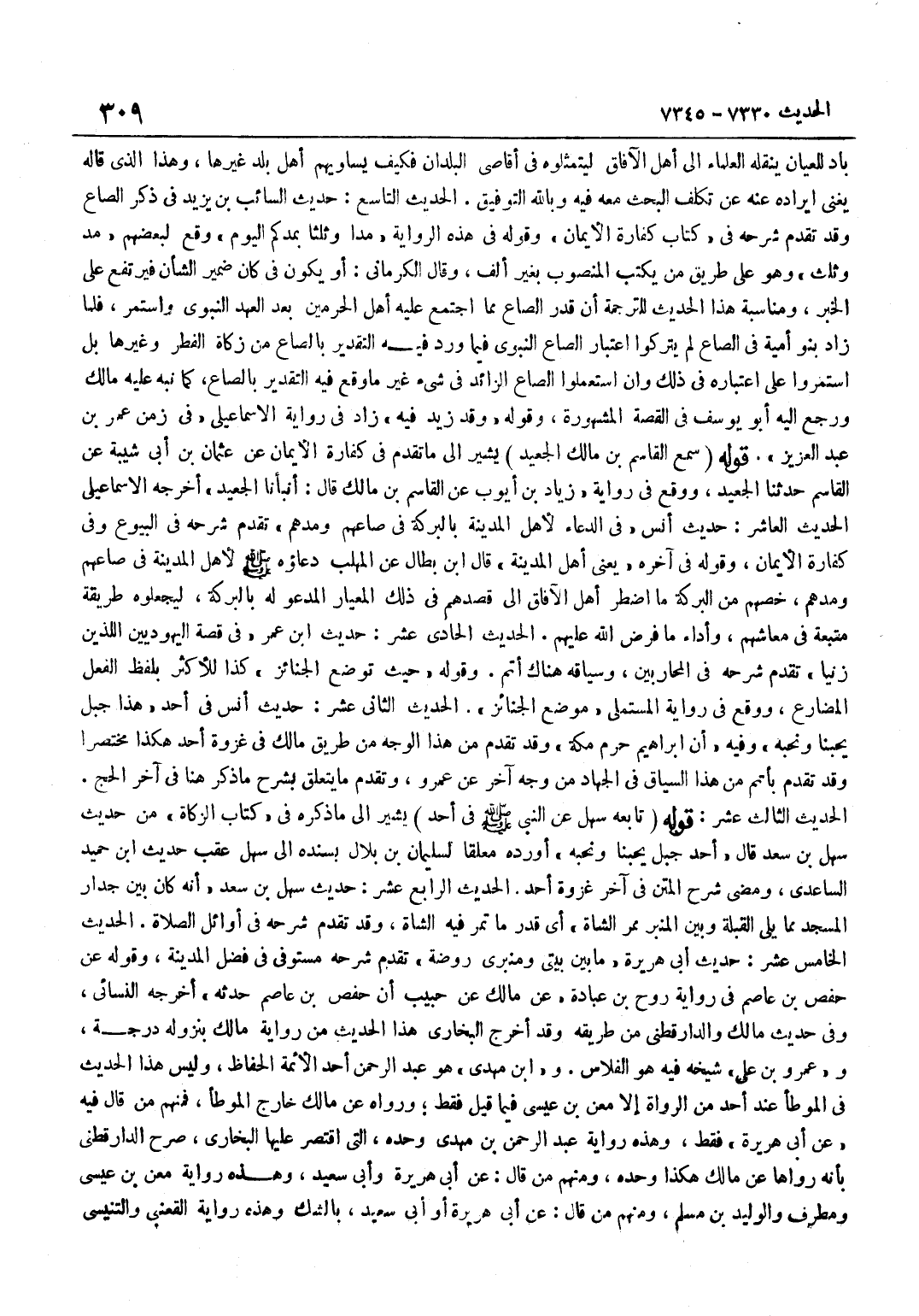 [7330] فِي هَذِهِ الرِّوَايَةِ مُدًّا وَثُلُثًا بِمُدِّكُمُ الْيَوْمَ وَقَعَ لِبَعْضِهِمْ مُدًّ وَثُلُثً وَهُوَ عَلَى طَرِيقِ مَنْ يَكْتُبُ الْمَنْصُوبَ بِغَيْرِ أَلْفٍ وَقَالَ الْكِرْمَانِيُّ أَوْ يَكُونُ فِي كَانَ ضَمِيرُ الشَّأْنِ فَيَرْتَفِعُ عَلَى الْخَبَرِ وَمُنَاسَبَةُ هَذَا الْحَدِيثِ لِلتَّرْجَمَةِ أَنَّ قَدْرَ الصَّاعِ مِمَّا اجْتَمَعَ عَلَيْهِ أَهْلُ الْحَرَمَيْنِ بَعْدَ الْعَهْدِ النَّبَوِيِّ وَاسْتَمَرَّ فَلَمَّا زَادَ بَنُو أُمَيَّةَ فِي الصَّاعِ لَمْ يَتْرُكُوا اعْتِبَارَ الصَّاعِ النَّبَوِيِّ فِيمَا وَرَدَ فِيهِ التَّقْدِيرُ بِالصَّاعِ مِنْ زَكَاةِ الْفِطْرِ وَغَيْرِهَا بَلِ اسْتَمَرُّوا عَلَى اعْتِبَارِهِ فِي ذَلِكَ وَإِنِ اسْتَعْمَلُوا الصَّاعَ الزَّائِدَ فِي شَيْءٍ غَيْرِ مَا وَقَعَ فِيهِ التَّقْدِيرُ بِالصَّاعِ كَمَا نَبَّهَ عَلَيْهِ مَالِكٌ وَرَجَعَ إِلَيْهِ أَبُو يُوسُفَ فِي الْقِصَّةِ الْمَشْهُورَةِ وَقَوله وَقد زيد فِيهِ زَاد فِي رِوَايَةَ الْإِسْمَاعِيلِيِّ فِي زَمَنِ عُمَرَ بْنِ عَبْدِ الْعَزِيزِ قَوْلُهُ سَمِعَ الْقَاسِمُ بْنُ مَالِكٍ الْجُعَيْدَ يُشِيرُ إِلَى مَا تَقَدَّمَ فِي كَفَّارَةِ الْأَيْمَانِ عَنْ عُثْمَانَ بْنِ أَبِي شَيْبَةَ عَنِ الْقَاسِمِ حَدَّثَنَا الْجُعَيْدُ وَوَقَعَ فِي رِوَايَةِ زِيَادِ بْنِ أَيُّوبَ عَنِ الْقَاسِمِ بْنِ مَالِكٍ قَالَ أَنْبَأَنَا الْجُعَيْدُ أَخْرَجَهُ الْإِسْمَاعِيلِيُّ الْحَدِيثُ الْعَاشِرُ حَدِيثُ أَنَسٍ فِي الدُّعَاءِ لِأَهْلِ الْمَدِينَةِ بِالْبَرَكَةِ فِي صَاعِهِمْ وَمُدِّهِمْ تَقَدَّمَ شَرْحُهُ فِي الْبُيُوعِ وَفِي كَفَّارَةِ الْأَيْمَانِ وَقَوْلُهُ