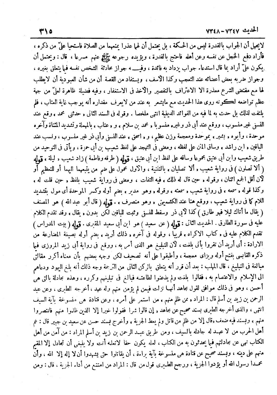 [7348] قَوْله عَن سعيد هُوَ بن أَبِي سَعِيدٍ الْمَقْبُرِيُّ قَوْلُهُ بَيْتَ الْمِدْرَاسِ تَقَدَّمَ الْكَلَامُ عَلَيْهِ فِي كِتَابِ الْإِكْرَاهِ قَرِيبًا وَقَوْلُهُ فِي آخِرِهِ ذَلِكَ أُرِيدُ بِضَمِّ أَوَّلِهِ بِصِيغَةِ الْمُضَارَعَةِ مِنَ الْإِرَادَةِ أَيْ أُرِيدُ أَنْ تُقِرُّوا بِأَنِّي بَلَّغْتُ لِأَنَّ التَّبْلِيغَ هُوَ الَّذِي أُمِرَ بِهِ وَوَقَعَ فِي رِوَايَةِ أَبِي زَيْدٍ الْمَرْوَزِيِّ فِيمَا ذَكَرَهُ الْقَابِسِيُّ بِفَتْحِ أَوَّلِهِ وَبِزَايٍ مُعْجَمَةٍ وَأَطْبَقُوا عَلَى أَنَّهُ تَصْحِيفٌ لَكِنْ وَجَّهَهُ بَعْضُهُمْ بِأَنَّ مَعْنَاهُ أُكَرِّرُ مَقَالَتِي مُبَالَغَةً فِي التَّبْلِيغِ قَالَ الْمُهَلَّبُ بَعْدَ أَنْ قَرَّرَ أَنَّهُ يَتَعَلَّقُ بِالرُّكْنِ الثَّانِي مِنَ التَّرْجَمَةِ وَجْهُ ذَلِكَ أَنَّهُ بَلَّغَ الْيَهُودَ وَدَعَاهُمْ إِلَى الْإِسْلَامِ وَالِاعْتِصَامِ بِهِ فَقَالُوا بَلَّغْتَ وَلَمْ يُذْعِنُوا لِطَاعَتِهِ فَبَالَغَ فِي تَبْلِيغِهِمْ وَكَرَّرَهُ وَهَذِهِ مُجَادَلَةٌ بِالَّتِي هِيَ أَحْسَنُ وَهُوَ فِي ذَلِكَ مُوَافِقٌ لِقَوْلِ مُجَاهِدٍ أَنَّهَا نَزَلَتْ فِيمَنْ لَمْ يُؤْمِنْ مِنْهُمْ وَلَهُ عَهْدٌ أَخْرَجَهُ الطَّبَرِيُّ وَعَنْ عَبْدِ الرَّحْمَنِ بْنِ زَيْدِ بْنِ أَسْلَمَ قَالَ الْمُرَادُ مِمَّنْ ظَلَمَ مِنْهُمْ مَنِ اسْتَمَرَّ عَلَى أَمْرِهِ وَعَنْ قَتَادَةَ هِيَ مَنْسُوخَةٌ بِآيَةِ السَّيْفِ انْتَهَى وَالَّذِي أَخْرَجَهُ الطَّبَرِيُّ بِسَنَدٍ صَحِيحٍ عَنْ مُجَاهِدٍ إِنْ قَالُوا شَرًّا فَقُولُوا خَيْرًا إِلَّا الَّذِينَ ظَلَمُوا مِنْهُمْ فَانْتَصِرُوا مِنْهُمْ وَبِسَنَدٍ فِيهِ ضَعْفٌ قَالَ إِلَّا مَنْ ظَلَمَ مَنْ قَاتَلَ وَلَمْ يُعْطِ الْجِزْيَةَ وَأَخْرَجَ بِسَنَدٍ حَسَنٍ عَنْ سَعِيدِ بْنِ جُبَيْرٍ قَالَ هُمْ أَهْلُ الْحَرْبِ مَنْ لَا عَهْدَ لَهُ جَادِلْهُ بِالسَّيْفِ وَمِنْ طَرِيقِ عَبْدِ الرَّحْمَنِ بْنِ زَيْدِ بْنِ أَسْلَمَ الْمُرَادُ مَنْ آمَنَ مِنْ أَهْلِ الْكِتَابِ نَهَى عَنْ مُجَادَلَتِهِمْ فِيمَا يُحَدِّثُونَ بِهِ مِنَ الْكِتَابِ لَعَلَّهُ يَكُونُ حَقًّا لَا تَعْلَمُهُ أَنْتَ وَلَا يَنْبَغِي أَنْ تُجَادِلَ إِلَّا الْمُقِيمَ مِنْهُمْ عَلَى دِينِهِ وَبِسَنَدٍ صَحِيحٍ عَنْ قَتَادَةَ هِيَ مَنْسُوخَةٌ بِآيَةِ بَرَاءَةٌ أَنْ يُقَاتَلُوا حَتَّى يَشْهَدُوا أَنْ لَا إِلَهَ إِلَّا اللَّهُ وَأَنَّ مُحَمَّدًا رَسُولُ اللَّهِ أَوْ يُؤَدُّوا الْجِزْيَةَ وَرَجَّحَ الطَّبَرِيُّ قَوْلَ مَنْ قَالَ الْمُرَادُ مَنِ امْتَنَعَ مِنْ أَدَاءِ الْجِزْيَةِ قَالَ وَمَنْ