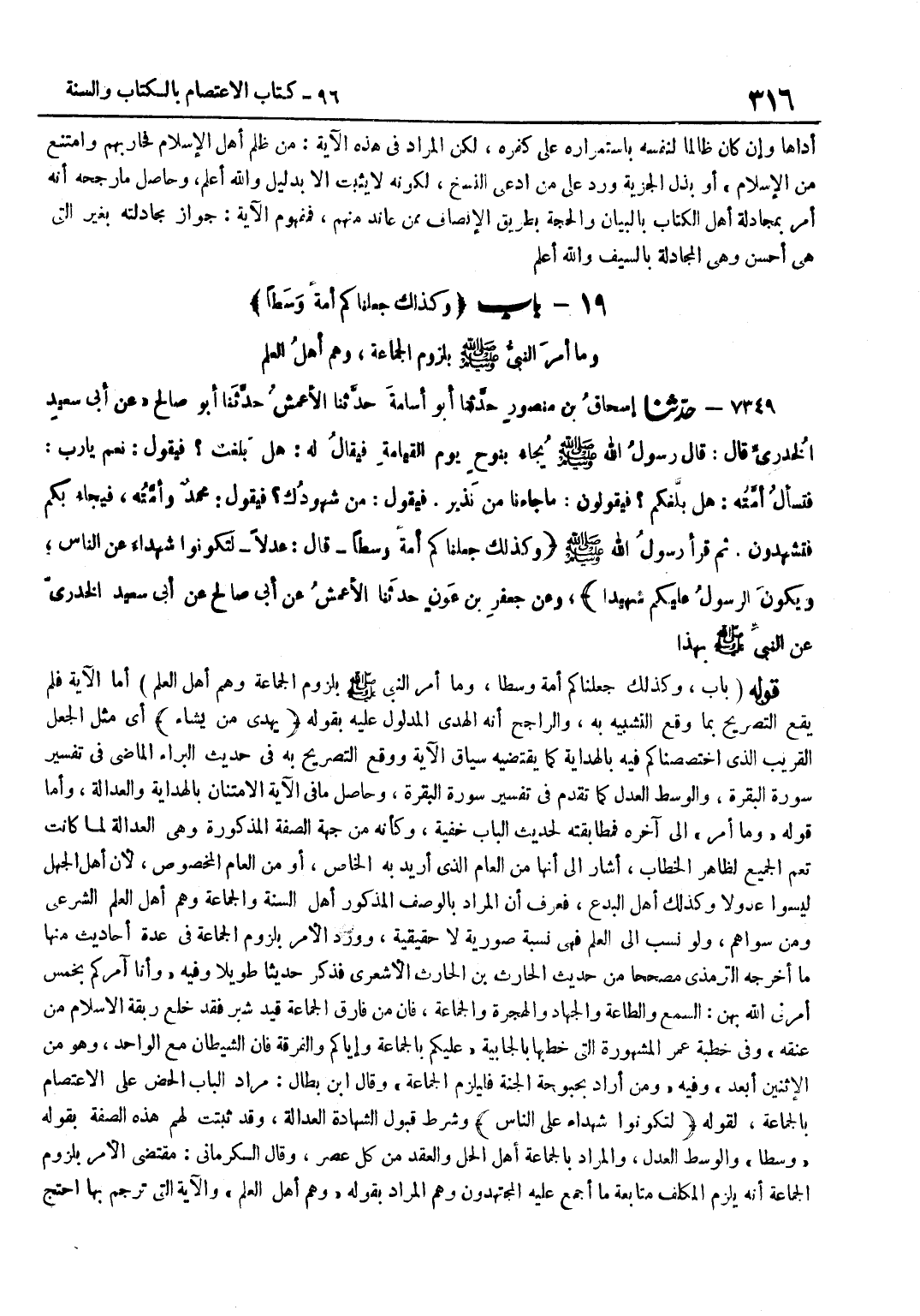 وَمَا أَمَرَ النَّبِيُّ صَلَّى اللَّهُ عَلَيْهِ وَسَلَّمَ بِلُزُومِ الْجَمَاعَةِ وَهُمْ أَهْلُ الْعِلْمِ أَمَّا الْآيَةُ فَلَمْ يَقَعِ التَّصْرِيحُ بِمَا وَقَعَ التَّشْبِيهُ بِهِ وَالرَّاجِحُ أَنَّهُ الْهُدَى الْمَدْلُول عَلَيْهِ بقوله يهدي من يَشَاء أَيْ مِثْلَ الْجُعْلِ الْقَرِيبِ الَّذِي اخْتَصَصْنَاكُمْ فِيهِ بِالْهِدَايَةِ كَمَا يَقْتَضِيهِ سِيَاقُ الْآيَةِ وَوَقَعَ التَّصْرِيحُ بِهِ فِي حَدِيثِ الْبَرَاءِ الْمَاضِي فِي تَفْسِيرِ سُورَةِ الْبَقَرَةِ وَالْوَسَطُ الْعَدْلُ كَمَا تَقَدَّمَ فِي تَفْسِيرِ سُورَةِ الْبَقَرَةِ وَحَاصِلُ مَا فِي الْآيَةِ الِامْتِنَانُ بِالْهِدَايَةِ وَالْعَدَالَةِ وَأَمَّا قَوْلُهُ وَمَا أَمَرَ إِلَى آخِرِهِ فَمُطَابَقَتُهُ لِحَدِيثِ الْبَابِ خَفِيَّةٌ وَكَأَنَّهُ مِنْ جِهَةِ الصِّفَةِ الْمَذْكُورَةِ وَهِيَ الْعَدَالَةُ لَمَّا كَانَتْ تَعُمُّ الْجَمِيعَ لِظَاهِرِ الْخِطَابِ أَشَارَ إِلَى أَنَّهَا مِنَ الْعَامِّ الَّذِي أُرِيدَ بِهِ الْخَاصُّ أَوْ مِنَ الْعَامِّ الْمَخْصُوصِ لِأَنَّ أَهْلَ الْجَهْلِ لَيْسُوا عُدُولًا وَكَذَلِكَ أَهْلُ الْبِدَعِ فَعُرِفَ أَنَّ الْمُرَادَ بِالْوَصْفِ الْمَذْكُورِ أَهْلُ السُّنَّةِ وَالْجَمَاعَةِ وَهُمْ أَهْلُ الْعِلْمِ الشَّرْعِيِّ وَمَنْ سِوَاهُمْ وَلَوْ نُسِبَ إِلَى الْعِلْمِ فَهِيَ نِسْبَةٌ صُورِيَّةٌ لَا حَقِيقِيَّةٌ وَوَرَدَ الْأَمْرُ بِلُزُومِ الْجَمَاعَةِ فِي عِدَّةِ أَحَادِيثَ مِنْهَا مَا أَخْرَجَهُ التِّرْمِذِيُّ مُصَحَّحًا مِنْ حَدِيثِ الْحَارِثِ بْنِ الْحَارِثِ الْأَشْعَرِيِّ فَذَكَرَ حَدِيثًا طَوِيلًا وَفِيهِ وَأَنَا آمُرُكُمْ بِخَمْسٍ أَمَرَنِي اللَّهُ بِهِنَّ السَّمْعُ وَالطَّاعَةُ وَالْجِهَادُ وَالْهِجْرَةُ وَالْجَمَاعَةُ فَإِنَّ مَنْ فَارَقَ الْجَمَاعَةَ قِيدَ شِبْرٍ فَقَدْ خَلَعَ رِبْقَةَ الْإِسْلَامِ مِنْ عُنُقِهِ وَفِي خُطْبَةِ عُمَرَ الْمَشْهُورَةِ الَّتِي خَطَبَهَا بِالْجَابِيَةِ عَلَيْكُمْ بِالْجَمَاعَةِ وَإِيَّاكُمْ وَالْفُرْقَةَ فَإِنَّ الشَّيْطَانَ مَعَ الْوَاحِدِ وَهُوَ مِنَ الِاثْنَيْنِ أَبْعَدُ وَفِيهِ وَمَنْ أَرَادَ بُحْبُوحَةَ الْجَنَّةِ فَلْيَلْزَمِ الْجَمَاعَة وَقَالَ بن بَطَّالٍ مُرَادُ الْبَابِ الْحَضُّ عَلَى الِاعْتِصَامِ بِالْجَمَاعَةِ لقَوْله لِتَكُونُوا شُهَدَاء على النَّاس وَشَرْطُ قَبُولِ الشَّهَادَةِ الْعَدَالَةُ وَقَدْ ثَبَتَتْ لَهُمْ هَذِهِ الصِّفَةُ بِقَوْلِهِ وَسَطًا وَالْوَسَطُ الْعَدْلُ وَالْمُرَادُ بِالْجَمَاعَةِ أَهْلُ الْحَلِّ وَالْعَقْدِ مِنْ كُلِّ عَصْرٍ وَقَالَ الْكِرْمَانِيُّ مُقْتَضَى الْأَمْرِ بِلُزُومِ الْجَمَاعَةِ أَنَّهُ يَلْزَمُ الْمُكَلَّفُ مُتَابَعَةَ مَا أَجْمَعَ عَلَيْهِ الْمُجْتَهِدُونَ وَهُمُ الْمُرَادُ بِقَوْلِهِ وَهُمْ أَهْلُ الْعِلْمِ وَالْآيَةُ الَّتِي تَرْجَمَ بِهَا احْتَجَّ