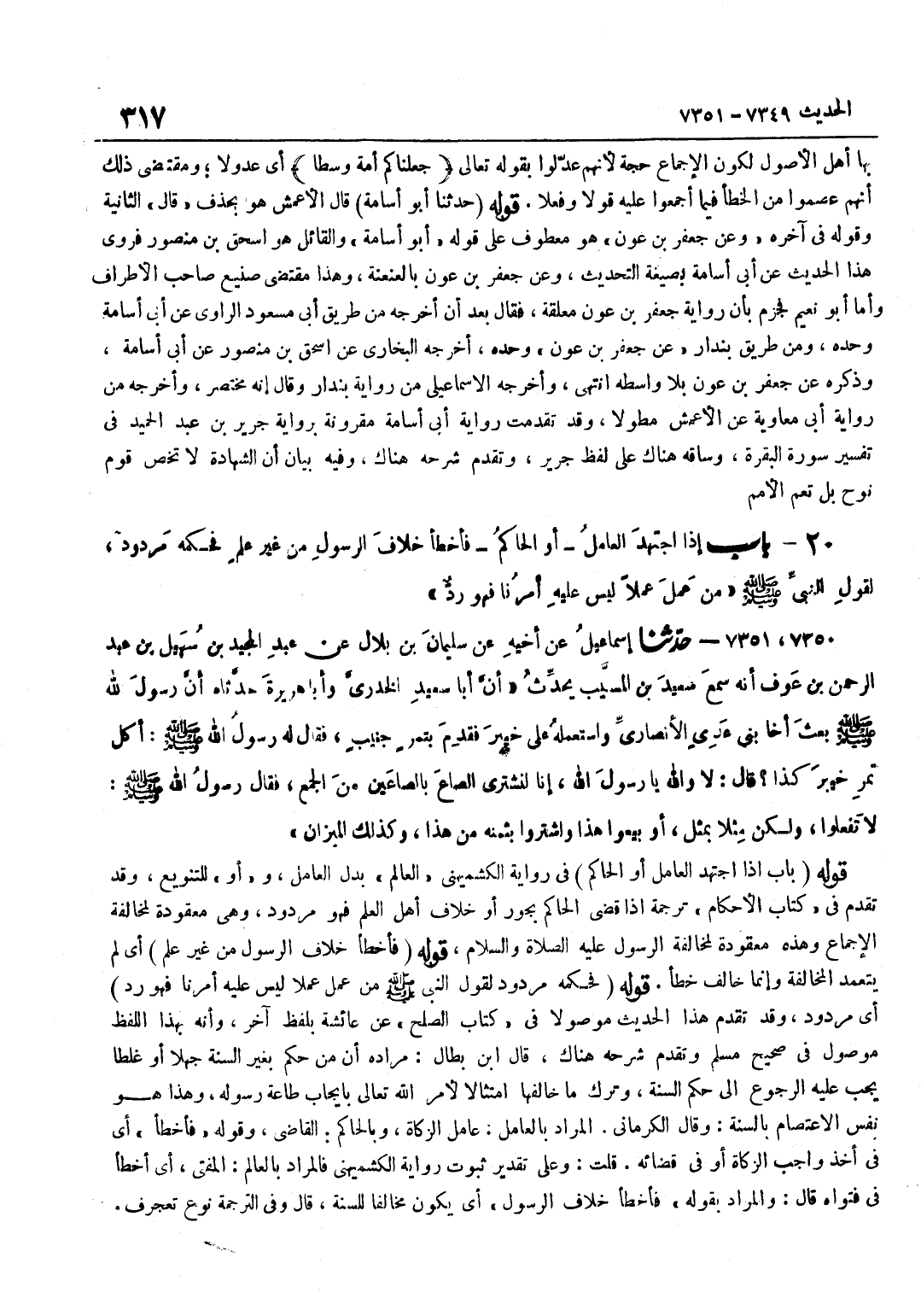 فِي رِوَايَة الْكشميهني الْعَالم بدل الْعَامِل أَوْ لِلتَّنْوِيعِ وَقَدْ تَقَدَّمَ فِي كِتَابِ الْأَحْكَامِ تَرْجَمَةُ إِذَا قَضَى الْحَاكِمُ بِجَوْرٍ أَوْ خِلَافَ أَهْلِ الْعِلْمِ فَهُوَ مَرْدُودٌ وَهِيَ مَعْقُودَةٌ لِمُخَالَفَةِ الْإِجْمَاعِ وَهَذِهِ مَعْقُودَةٌ لِمُخَالَفَةِ الرَّسُولِ عَلَيْهِ الصَّلَاةُ وَالسَّلَامُ قَوْلُهُ فَأَخْطَأَ خِلَافَ الرَّسُولِ مِنْ غَيْرِ عِلْمٍ أَيْ لَمْ يَتَعَمَّدِ الْمُخَالَفَةَ وَإِنَّمَا خَالَفَ خَطَأً قَوْلُهُ فَحُكْمُهُ مَرْدُودٌ لِقَوْلِ النَّبِيِّ صَلَّى اللَّهُ عَلَيْهِ وَسَلَّمَ مَنْ عَمِلَ عَمَلًا لَيْسَ عَلَيْهِ أَمْرُنَا فَهُوَ رَدٌّ أَيْ مَرْدُودٌ وَقَدْ تَقَدَّمَ هَذَا الْحَدِيثُ مَوْصُولًا فِي كِتَابِ الصُّلْحِ عَنْ عَائِشَةَ بِلَفْظٍ آخَرَ وَأَنَّهُ بِهَذَا اللَّفْظِ مَوْصُولٌ فِي صَحِيحِ مُسْلِمٍ وَتَقَدَّمَ شَرْحُهُ هُنَاكَ قَالَ بن بَطَّالٍ مُرَادُهُ أَنَّ مَنْ حَكَمَ بِغَيْرِ السُّنَّةِ جَهْلًا أَوْ غَلَطًا يَجِبُ عَلَيْهِ الرُّجُوعُ إِلَى حُكْمِ السُّنَّةِ وَتَرْكُ مَا خَالَفَهَا امْتِثَالًا لِأَمْرِ اللَّهِ تَعَالَى بِإِيجَابِ طَاعَةِ رَسُولِهِ وَهَذَا هُوَ نَفْسُ الِاعْتِصَامِ بِالسُّنَّةِ وَقَالَ الْكِرْمَانِيُّ الْمُرَادُ بِالْعَامِلِ عَامِلُ الزَّكَاةِ وَبِالْحَاكِمِ الْقَاضِي وَقَوْلُهُ فَأَخْطَأَ أَيْ فِي أَخْذِ وَاجِبِ الزَّكَاةِ أَوْ فِي قَضَائِهِ قُلْتُ وَعَلَى تَقْدِيرِ ثُبُوتِ رِوَايَةِ الْكُشْمِيهَنِيِّ فَالْمُرَادُ بِالْعَالِمِ الْمُفْتِي أَيْ أَخْطَأَ فِي فَتْوَاهُ قَالَ وَالْمُرَادُ بِقَوْلِهِ فَأَخْطَأَ خِلَافَ الرَّسُولِ أَيْ يَكُونُ مُخَالِفًا لِلسُّنَّةِ قَالَ وَفِي التَّرْجَمَةِ نَوْعُ تَعَجْرُفٍ