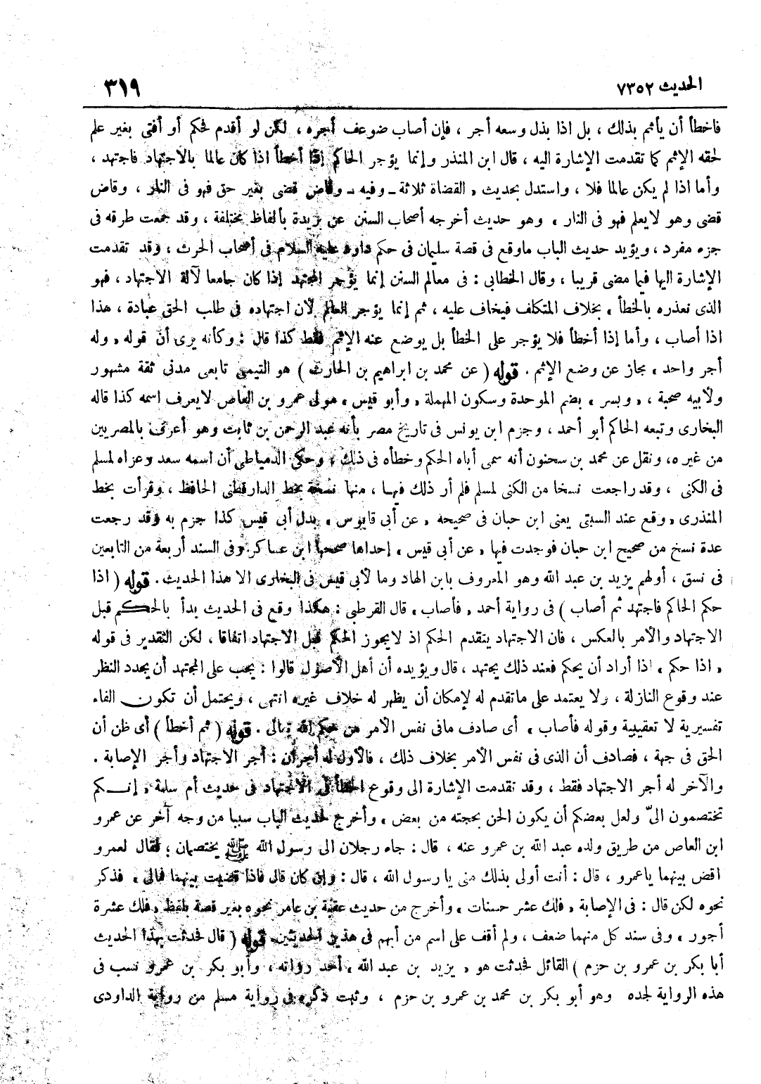 [7352] قَوْله عَن مُحَمَّد بن إِبْرَاهِيم بن الْحَارِث هُوَ التَّيْمِيّ تَابِعِيّ مدنِي ثِقَة مَشْهُور ولأبيه صُحْبَة وَبسر بِضَم الْمُوَحدَة وَسُكُون الْمُهْملَة وَأَبُو قيس مولى عَمْرو بن الْعَاصِ لَا يعرف اسْمه كَذَا قَالَه البُخَارِيّ وَتَبعهُ الْحَاكِم أَبُو احْمَد وَجزم بن يُونُس فِي تَارِيخ مصر بِأَنَّهُ عبد الرَّحْمَن بن ثَابت وَهُوَ أعرف بالمصريين من غَيره وَنقل عَن مُحَمَّد بن سَحْنُون انه سمى أَبَاهُ الحكم وَخَطأَهُ فِي ذَلِك وَحكى الدمياطي أَن اسْمه سعد وَعَزاهُ لمُسلم فِي الكنى وَقد راجعت نسخا من الكنى لمُسلم فَلم ار ذَلِك فِيهَا مِنْهَا نُسْخَة بِخَط الدَّارَقُطْنِيّ الْحَافِظ وقرأت بِخَط الْمُنْذِرِيّ وَقع عِنْد السبتي يَعْنِي بن حبَان فِي صَحِيحه عَن أبي قَابُوس بدل أبي قيس كَذَا جزم بِهِ وَقد رجعت عدَّة نسخ من صَحِيح بن حبَان فَوجدت فِيهَا عَن أبي قيس احداها صححها بن عَسَاكِر وَفِي السَّنَد أَرْبَعَة من التَّابِعين فِي نسق اولهم يزِيد بن عبد الله وَهُوَ الْمَعْرُوف بِابْن الْهَاد وَمَا لأبي قيس فِي البُخَارِيّ الا هَذَا الحَدِيث قَوْله اذا حكم الْحَاكِم فاجتهد ثمَّ أصَاب فِي رِوَايَة احْمَد فَأصَاب قَالَ الْقُرْطُبِيّ هَكَذَا وَقع فِي الحَدِيث بَدَأَ بالحكم قبل الِاجْتِهَاد وَالْأَمر بِالْعَكْسِ فان الِاجْتِهَاد يتَقَدَّم الحكم إِذْ لَا يجوز الحكم قبل الِاجْتِهَاد اتِّفَاقًا لَكِن التَّقْدِير فِي قَوْله إِذا حكم إِذا أَرَادَ ان يحكم فَعِنْدَ ذَلِك يجْتَهد قَالَ وَيُؤَيِّدهُ ان أهل الْأُصُول قَالُوا يجب على الْمُجْتَهد ان يجدد النّظر عِنْد وُقُوع النَّازِلَة وَلَا يعْتَمد على مَا تقدم لَهُ لأمكان ان يظْهر لَهُ خلاف غَيره انْتهى وَيحْتَمل أَن تكون الْفَاء تفسيرية لَا تعقيبية وَقَوله فَأصَاب أَي صَادف مَا فِي نفس الْأَمر من حكم الله تَعَالَى قَوْله ثمَّ أَخطَأ أَي ظن أَن الْحق فِي جِهَة فصادف ان الَّذِي فِي نفس الْأَمر بِخِلَاف ذَلِك فَالْأول لَهُ أَجْرَانِ أجر الِاجْتِهَاد واجر الْإِصَابَة وَالْآخر لَهُ أجر الِاجْتِهَاد فَقَط وَقد تقدّمت الْإِشَارَة إِلَى وُقُوع الخطا فِي الِاجْتِهَاد فِي حَدِيث أم سَلمَة انكم تَخْتَصِمُونَ إِلَيَّ وَلَعَلَّ بَعْضَكُمْ أَنْ يَكُونَ أَلْحَنَ بحجته من بعض وَأخرج لحَدِيث الْبَاب سَببا من وَجه آخر عَن عَمْرو بن الْعَاصِ من طَرِيق وَلَده عبد الله بن عَمْرو عَنهُ قَالَ جَاءَ رجلَانِ إِلَى رَسُولِ اللَّهِ صَلَّى اللَّهُ عَلَيْهِ وَسَلَّمَ يختصمان فَقَالَ لعَمْرو اقْضِ بَينهمَا يَا عَمْرو قَالَ أَنْت أولى بذلك مني يَا رَسُول الله قَالَ وان كَانَ قَالَ فَإِذا قضيت بَينهمَا فَمَالِي فَذكر نَحوه لَكِن قَالَ فِي الْإِصَابَة فلك عشر حَسَنَات وَأخرج من حَدِيث عقبَة بن عَامر نَحوه بِغَيْر قصَّة بِلَفْظ فلك عشرَة أجور وَفِي سَنَد كل مِنْهُمَا ضعف وَلم أَقف على اسْم من أبهم فِي هذَيْن الْحَدِيثين قَوْله قَالَ فَحدثت بِهَذَا الحَدِيث أَبَا بكر بن عَمْرو بن حزم الْقَائِل فَحدثت هُوَ يزِيد بن عبد الله أحد رُوَاته وَأَبُو بكر بن عَمْرو نسب فِي هَذِه الرِّوَايَة لجده وَهُوَ أَبُو بَكْرِ بْنِ مُحَمَّدِ بْنِ عَمْرِو بْنِ حَزْمٍ وَثَبت ذكره فِي رِوَايَة مُسلم من رِوَايَة الدَّاودِيّ