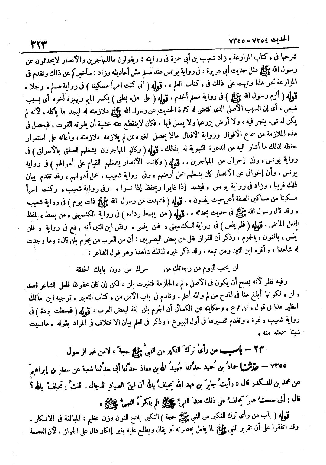 شَرْحُهَا فِي كِتَابِ الْمُزَارَعَةِ زَادَ شُعَيْبُ بْنُ أَبِي حَمْزَةَ فِي رِوَايَتِهِ وَيَقُولُونَ مَا لِلْمُهَاجِرِينَ وَالْأَنْصَارِ لَا يُحَدِّثُونَ عَنْ رَسُولِ اللَّهِ صَلَّى اللَّهُ عَلَيْهِ وَسَلَّمَ مِثْلَ حَدِيثِ أَبِي هُرَيْرَةَ فِي رِوَايَةِ يُونُسَ عِنْدَ مُسْلِمٍ مِثْلَ أَحَادِيثِهِ وَزَادَ سَأُخْبِرُكُمْ عَنْ ذَلِكَ وَتَقَدَّمَ فِي الْمُزَارَعَةِ نَحْوُ هَذَا وَنَبَّهْتُ عَلَى ذَلِكَ فِي كِتَابِ الْعِلْمِ قَوْلُهُ إِنِّي كُنْتُ امْرَأً مِسْكِينًا فِي رِوَايَةِ مُسْلِمٍ رَجُلًا قَوْلُهُ أَلْزَمُ رَسُولَ اللَّهِ صَلَّى اللَّهُ عَلَيْهِ وَسَلَّمَ فِي رِوَايَةِ مُسْلِمٍ أَخْدُمُ قَوْلُهُ عَلَى مِلْءِ بَطْنِي بِكَسْرِ الْمِيمِ وَبِهَمْزَةٍ آخِرَهُ أَيْ بِسَبَبِ شِبَعِي أَيْ إِنَّ السَّبَبَ الْأَصْلِيَّ الَّذِي اقْتَضَى لَهُ كَثْرَةَ الْحَدِيثِ عَنْ رَسُولِ اللَّهِ صَلَّى اللَّهُ عَلَيْهِ وَسَلَّمَ مُلَازَمَتُهُ لَهُ لِيَجِدَ مَا يَأْكُلُهُ لِأَنَّهُ لَمْ يَكُنْ لَهُ شَيْءٌ يَتَّجِرُ فِيهِ وَلَا أَرْضٌ يَزْرَعُهَا وَلَا يَعْمَلُ فِيهَا فَكَانَ لَا يَنْقَطِعُ عَنْهُ خَشْيَةَ أَنْ يَفُوتَهُ الْقُوتُ فَيَحْصُلُ فِي هَذِهِ الْمُلَازَمَةِ مِنْ سَمَاعِ الْأَقْوَالِ وَرِوَايَةِ الْأَفْعَالِ مَا لَا يَحْصُلُ لِغَيْرِهِ مِمَّنْ لَمْ يُلَازِمُهُ مُلَازَمَتَهُ وَأَعَانَهُ عَلَى اسْتِمْرَارِ حِفْظِهِ لِذَلِكَ مَا أَشَارَ إِلَيْهِ مِنَ الدَّعْوَةِ النَّبَوِيَّةِ لَهُ بِذَلِكَ قَوْلُهُ وَكَانَ الْمُهَاجِرُونَ يَشْغَلُهُمُ الصَّفْقُ بِالْأَسْوَاقِ فِي رِوَايَة يُونُسَ وَإِنَّ إِخْوَانِي مِنَ الْمُهَاجِرِينَ قَوْلُهُ وَكَانَتِ الْأَنْصَارُ يَشْغَلُهُمُ الْقِيَامُ عَلَى أَمْوَالِهِمْ فِي رِوَايَةِ يُونُس وَأَن إخْوَانِي عَن الْأَنْصَارِ كَانَ يَشْغَلُهُمْ عَمَلُ أَرْضِهِمْ وَفِي رِوَايَةِ شُعَيْبٍ عَمَلُ أَمْوَالِهِمْ وَقَدْ تَقَدَّمَ بَيَانُ ذَلِكَ قَرِيبًا وَزَادَ فِي رِوَايَةِ يُونُسَ فَيَشْهَدُ إِذَا غَابُوا وَيَحْفَظُ إِذَا نَسُوا وَفِي رِوَايَةِ شُعَيْبٍ وَكُنْتُ امْرَأً مِسْكِينًا مِنْ مَسَاكِينِ الصُّفَّةِ أَعِي حَيْثُ يَنْسَوْنَ قَوْلُهُ فَشَهِدْتُ مِنْ رَسُولِ اللَّهِ صَلَّى اللَّهُ عَلَيْهِ وَسَلَّمَ ذَاتَ يَوْمٍ فِي رِوَايَةِ شُعَيْبٍ وَقَدْ قَالَ رَسُولُ اللَّهِ صَلَّى اللَّهُ عَلَيْهِ وَسَلَّمَ فِي حَدِيثٍ يُحَدِّثُهُ قَوْلُهُ مَنْ يَبْسُطُ رِدَاءَهُ فِي رِوَايَةِ الْكُشْمِيهَنِيِّ مَنْ بَسَطَ بِلَفْظِ الْفِعْلِ الْمَاضِي قَوْلُهُ فَلَمْ يَنْسَ فِي رِوَايَة الْكشميهني فَلَنْ ينسى وَنقل بن التِّينِ أَنَّهُ وَقَعَ فِي رِوَايَةٍ فَلَنْ يَنْسَ بِالنُّونِ وَبِالْجَزْمِ وَذَكَرَ أَنَّ الْقَزَّازَ نَقَلَ عَنْ بَعْضِ الْبَصْرِيِّينَ أَنَّ مِنَ الْعَرَبِ مَنْ يَجْزِمُ بِلَنْ قَالَ وَمَا وَجَدْتُ لَهُ شَاهِدًا وَأَقَرَّهُ بن التِّينِ وَمَنْ تَبِعَهُ وَقَدْ ذَكَرَ غَيْرُهُ لِذَلِكَ شَاهدا وَهُوَ قَول الشَّاعِر لن يحب الْيَوْمَ مِنْ رَجَائِكَ مَنْ حَرَّكَ مِنْ دُونِ بَابِكَ الْحَلَقَةَ وَفِيهِ نَظَرٌ لِأَنَّهُ يَصِحُّ أَنْ يَكُونَ فِي الْأَصْلِ لَمْ الْجَازِمَةُ فَتَغَيَّرَتْ بِلَنْ لَكِنْ إِنْ كَانَ مَحْفُوظًا فَلَعَلَّ الشَّاعِرُ قَصَدَ لَنْ لِكَوْنِهَا أَبْلَغُ هُنَا فِي الْمَدْحِ مِنْ لَمْ وَاللَّهُ أَعْلَمُ وَتَقَدَّمَ فِي بَابِ الْأَمْنِ من كتاب التَّعْبِير تَوْجِيه بن مَالِكٍ لِنَظِيرِ هَذَا فِي قَوْلِ لَنْ تُرَعَ وَحِكَايَتُهُ عَنِ الْكِسَائِيِّ أَنَّ الْجَزْمَ بِلَنْ لُغَةٌ لِبَعْضِ الْعَرَبِ قَوْلُهُ فَبَسَطْتُ بُرْدَةً فِي رِوَايَةِ شُعَيْبٍ نَمِرَةً وَتَقَدَّمَ تَفْسِيرُهَا فِي أَوَّلِ الْبُيُوعِ وَذَكَرَ فِي الْعِلْمِ بَيَانَ 