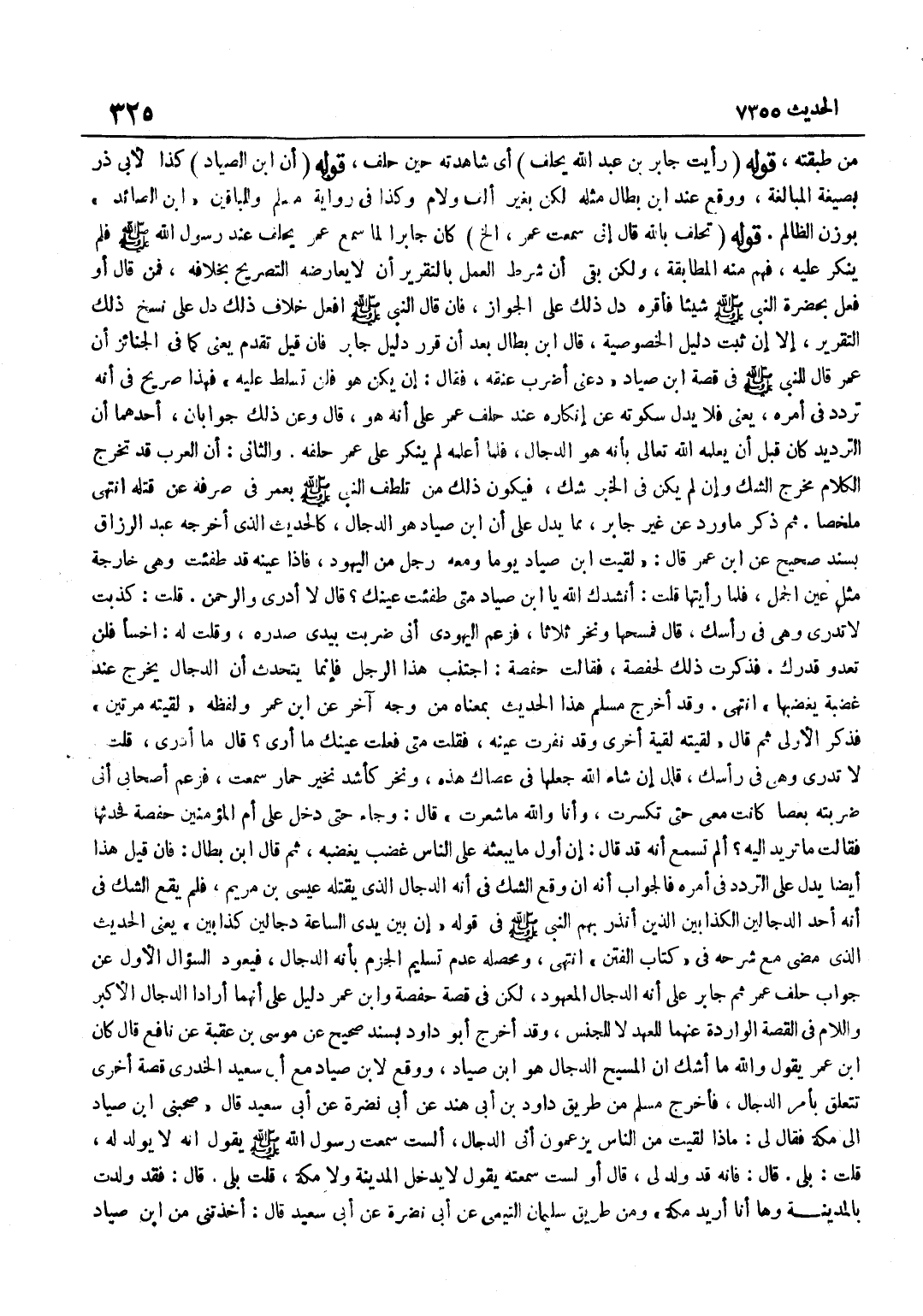 مِنْ طَبَقَتِهِ قَوْلُهُ رَأَيْتُ جَابِرَ بْنَ عَبْدِ اللَّهِ يَحْلِفُ أَيْ شَاهَدْتُهُ حِينَ حَلَفَ قَوْلُهُ ان بن الصَّيَّادِ كَذَا لِأَبِي ذَرٍّ بِصِيغَةِ الْمُبَالَغَةِ وَوَقَعَ عِنْد بن بَطَّالٍ مِثْلُهُ لَكِنْ بِغَيْرِ أَلِفٍ وَلَامٍ وَكَذَا فِي رِوَايَة مُسلم وللباقين بن الصَّائِد بِوَزْن الظَّالِم قَوْله تَحْلِفُ بِاللَّهِ قَالَ إِنِّي سَمِعْتُ عُمَرَ إِلَخْ كَأَنَّ جَابِرًا لَمَّا سَمِعَ عُمَرَ يَحْلِفُ عِنْدَ رَسُولِ اللَّهِ صَلَّى اللَّهُ عَلَيْهِ وَسَلَّمَ فَلَمْ يُنْكِرْ عَلَيْهِ فَهِمَ مِنْهُ الْمُطَابَقَةَ وَلَكِنْ بَقِيَ أَنَّ شَرْطَ الْعَمَلِ بِالتَّقْرِيرِ أَنْ لَا يُعَارِضَهُ التَّصْرِيحُ بِخِلَافِهِ فَمَنْ قَالَ أَوْ فُعِلَ بِحَضْرَةِ النَّبِيِّ صَلَّى اللَّهُ عَلَيْهِ وَسَلَّمَ شَيْئًا فَأَقَرَّهُ دَلَّ ذَلِكَ عَلَى الْجَوَازِ فَإِنْ قَالَ النَّبِيُّ صَلَّى اللَّهُ عَلَيْهِ وَسَلَّمَ افْعَلْ خِلَافَ ذَلِكَ دَلَّ عَلَى نَسْخِ ذَلِكَ التَّقْرِيرِ إِلَّا إِنْ ثَبت دَلِيل الخصوصية قَالَ بن بَطَّالٍ بَعْدَ أَنْ قَرَّرَ دَلِيلَ جَابِرٍ فَإِنْ قِيلَ تَقَدَّمَ يَعْنِي كَمَا فِي الْجَنَائِزِ أَنَّ عُمَرَ قَالَ لِلنَّبِيِّ صَلَّى اللَّهُ عَلَيْهِ وَسَلَّمَ فِي قصَّة بن صياد دَعْنِي أَضْرِبَ عُنُقَهُ فَقَالَ إِنْ يَكُنْ هُوَ فَلَنْ تُسَلَّطْ عَلَيْهِ فَهَذَا صَرِيحٌ فِي أَنَّهُ تَرَدَّدَ فِي أَمْرِهِ يَعْنِي فَلَا يَدُلُّ سُكُوتُهُ عَنْ إِنْكَارِهِ عِنْدَ حَلِفِ عُمَرَ عَلَى أَنَّهُ هُوَ قَالَ وَعَنْ ذَلِكَ جَوَابَانِ أَحَدُهُمَا أَنَّ التَّرْدِيدَ كَانَ قَبْلَ أَنْ يُعْلِمَهُ اللَّهُ تَعَالَى بِأَنَّهُ هُوَ الدَّجَّالُ فَلَمَّا أَعْلَمَهُ لَمْ يُنْكِرْ عَلَى عُمَرَ حَلِفَهُ وَالثَّانِي أَنَّ الْعَرَبَ قَدْ تُخْرِجُ الْكَلَامَ مَخْرَجَ الشَّكِّ وَإِنْ لَمْ يَكُنْ فِي الْخَبَرِ شَكٌّ فَيَكُونُ ذَلِكَ مِنْ تَلَطُّفِ النَّبِيِّ صَلَّى اللَّهُ عَلَيْهِ وَسَلَّمَ بِعُمَرَ فِي صَرْفِهِ عَنْ قَتْلِهِ انْتَهَى مُلَخَّصًا ثُمَّ ذَكَرَ مَا وَرَدَ عَنْ غَيْرِ جَابِرٍ مِمَّا يَدُلُّ على ان بن صَيَّادٍ هُوَ الدَّجَّالُ كَالْحَدِيثِ الَّذِي أَخْرَجَهُ عَبْدُ الرَّزَّاق بِسَنَد صَحِيح عَن بن عمر قَالَ لقِيت بن صَيَّادٍ يَوْمًا وَمَعَهُ رَجُلٌ مِنَ الْيَهُودِ فَإِذَا عَيْنُهُ قَدْ طَفِئَتْ وَهِيَ خَارِجَةٌ مِثْلَ عَيْنِ الْجَمَلِ فَلَمَّا رَأَيْتُهَا قُلْتُ أَنْشُدُكَ اللَّهَ يَا بن صَيَّادٍ مَتَى طَفِئَتْ عَيْنَكَ قَالَ لَا أَدْرِي وَالرَّحْمَنِ قُلْتُ كَذَبْتَ لَا تَدْرِي وَهِيَ فِي رَأْسِكِ قَالَ فَمَسَحَهَا وَنَخَرَ ثَلَاثًا فَزَعَمَ الْيَهُودِيُّ أَنِّي ضَرَبْتُ بِيَدَيَّ صَدْرَهُ وَقُلْتُ لَهُ اخْسَأْ فَلَنْ تَعْدُو قَدَرَكَ فَذَكَرْتُ ذَلِكَ لِحَفْصَةَ فَقَالَتْ حَفْصَةُ اجْتَنِبْ هَذَا الرَّجُلَ فَإِنَّمَا يُتَحَدَّثُ أَنَّ الدَّجَّالَ يَخْرُجُ عِنْدَ غَضْبَةٍ يَغْضَبُهَا انْتَهَى وَقَدْ أَخْرَجَ مُسْلِمٌ هَذَا الْحَدِيثَ بِمَعْنَاهُ مِنْ وَجْهٍ آخر عَن بن عُمَرَ وَلَفْظُهُ لَقِيتُهُ مَرَّتَيْنِ فَذَكَرَ الْأُولَى ثُمَّ قَالَ لَقِيتُهُ لُقْيَةً أُخْرَى وَقَدْ نَفَرَتْ عَيْنُهُ فَقُلْتُ مَتَى فَعَلَتْ عَيْنُكَ مَا أَرَى قَالَ مَا أَدْرِي قُلْتُ لَا تَدْرِي وَهِيَ فِي رَأْسِكَ قَالَ إِنْ شَاءَ اللَّهُ جَعَلَهَا فِي عَصَاكَ هَذِهِ وَنَخَرَ كَأَشَدَّ نَخِيرِ حِمَارٍ سَمِعْتُ فَزَعَمَ أَصْحَابِي أَنِّي ضَرَبْتُهُ بِعَصًا كَانَتْ مَعِي حَتَّى تَكَسَّرَتْ وَأَنَا وَاللَّهِ مَا شَعَرْتُ قَالَ وَجَاءَ حَتَّى دَخَلَ عَلَى أُمِّ الْمُؤْمِنِينَ حَفْصَةَ فَحَدَّثَهَا فَقَالَتْ مَا تُرِيدُ إِلَيْهِ أَلَمْ تَسْمَعْ أَنَّهُ قَدْ قَالَ إِنَّ أَوَّلَ مَا يَبْعَث