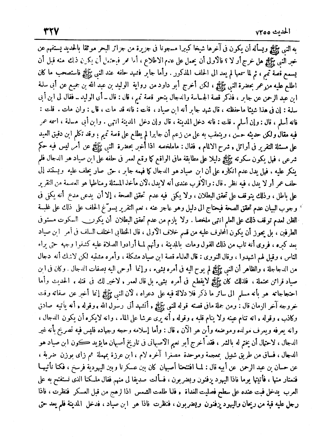 بِهِ النَّبِيُّ صَلَّى اللَّهُ عَلَيْهِ وَسَلَّمَ وَيَسْأَلُهُ أَنْ يَكُونَ فِي آخِرِهَا شَيْخًا كَبِيرًا مَسْجُونًا فِي جَزِيرَةٍ مِنْ جَزَائِرِ الْبَحْرِ مُوثَقًا بِالْحَدِيدِ يَسْتَفْهِمُ عَنْ خَبَرِ النَّبِيِّ صَلَّى اللَّهُ عَلَيْهِ وَسَلَّمَ هَلْ خَرَجَ أَوْ لَا فَالْأَوْلَى أَنْ يُحْمَلَ عَلَى عَدَمِ الِاطِّلَاعِ أَمَّا عُمَرُ فَيَحْتَمِلُ أَنْ يَكُونَ ذَلِكَ مِنْهُ قَبْلَ أَنْ يَسْمَعَ قِصَّةَ تَمِيمٍ ثُمَّ لَمَّا سَمِعَهَا لَمْ يَعُدْ إِلَى الْحَلِفِ الْمَذْكُورِ وَأَمَّا جَابِرٌ فَشَهِدَ حَلِفَهُ عِنْدَ النَّبِيِّ صَلَّى اللَّهُ عَلَيْهِ وَسَلَّمَ فَاسْتَصْحَبَ مَا كَانَ اطَّلَعَ عَلَيْهِ مِنْ عُمَرَ بِحَضْرَةِ النَّبِيِّ صَلَّى اللَّهُ عَلَيْهِ وَسَلَّمَ لَكِنَّ أَخْرَجَ أَبُو دَاوُدَ مِنْ رِوَايَةِ الْوَلِيدِ بْنِ عَبْدِ اللَّهِ بْنِ جَمِيعٍ عَنْ أَبِي سَلَمَةَ بْنِ عَبْدِ الرَّحْمَنِ عَنْ جَابِرٍ فَذَكَرَ قِصَّةَ الْجَسَّاسَةِ وَالدَّجَّالِ بِنَحْوِ قِصَّةِ تَمِيمٍ قَالَ قَالَ أَيِ الْوَلِيد فَقَالَ لي بن أَبِي سَلَمَةَ إِنَّ فِي هَذَا شَيْئًا مَا حفظته قَالَ شهد جَابر انه بن صَيَّادٍ قُلْتُ فَإِنَّهُ قَدْ مَاتَ قَالَ وَإِنْ مَاتَ قُلْتُ فَإِنَّهُ أَسْلَمَ قَالَ وَإِنْ أَسْلَمَ قُلْتُ فَإِنَّهُ دَخَلَ الْمَدِينَةَ قَالَ وَإِنْ دَخَلَ الْمَدِينَة انْتهى وبن أَبِي مَسْلَمَةَ اسْمُهُ عُمَرُ فِيهِ مَقَالٌ وَلَكِنَّ حَدِيثَهُ حَسَنٌ وَيُتَعَقَّبُ بِهِ عَلَى مَنْ زَعَمَ أَنَّ جَابِرًا لَمْ يَطَّلِعْ عَلَى قِصَّةِ تَمِيمٍ وَقد تكلم بن دَقِيقِ الْعِيدِ عَلَى مَسْأَلَةِ التَّقْرِيرِ فِي أَوَائِلِ شَرْحِ الْإِلْمَامِ فَقَالَ مَا مُلَخَّصُهُ إِذَا أَخْبَرَ بِحَضْرَةِ النَّبِيِّ صَلَّى اللَّهُ عَلَيْهِ وَسَلَّمَ عَنْ أَمْرٍ لَيْسَ فِيهِ حُكْمٌ شَرْعِيٌّ فَهَلْ يَكُونُ سُكُوتُهُ صَلَّى اللَّهُ عَلَيْهِ وَسَلَّمَ دَلِيلًا عَلَى مُطَابَقَةِ مَا فِي الْوَاقِعِ كَمَا وَقَعَ لِعُمَرَ فِي حلفه على بن صَيَّادٍ هُوَ الدَّجَّالُ فَلَمْ يُنْكِرْ عَلَيْهِ فَهَلْ يدل عدم إِنْكَاره على أَن بن صَيَّادٍ هُوَ الدَّجَّالُ كَمَا فَهِمَهُ جَابِرٌ حَتَّى صَارَ يَحْلِفُ عَلَيْهِ وَيَسْتَنِدُ إِلَى حَلِفِ عُمَرَ أَوْ لَا يَدُلُّ فِيهِ نَظَرٌ قَالَ وَالْأَقْرَبُ عِنْدِي أَنَّهُ لَا يَدُلُّ لِأَنَّ مَأْخَذَ الْمَسْأَلَةِ وَمَنَاطَهَا هُوَ الْعِصْمَةُ مِنَ التَّقْرِيرِ عَلَى بَاطِلٍ وَذَلِكَ يَتَوَقَّفُ عَلَى تَحَقُّقِ الْبُطْلَانِ وَلَا يَكْفِي فِيهِ عَدَمُ تَحَقُّقِ الصِّحَّةِ إِلَّا أَنْ يَدَّعِيَ مُدَّعٍ أَنَّهُ يَكْفِي فِي وُجُوبِ الْبَيَانِ عَدَمُ تَحَقُّقِ الصِّحَّةِ فَيَحْتَاجُ إِلَى دَلِيلٍ وَهُوَ عَاجِزٌ عَنْهُ نَعَمْ التَّقْرِيرُ يُسَوِّغُ الْحَلِفَ عَلَى ذَلِكَ عَلَى غَلَبَةِ الظَّنِّ لِعَدَمِ تَوَقُّفِ ذَلِكَ عَلَى الْعِلْمِ انْتَهَى مُلَخَّصًا وَلَا يَلْزَمْ مِنْ عَدَمِ تَحَقُّقِ الْبُطْلَانِ أَنْ يَكُونَ السُّكُوتُ مُسْتَوْفِي الطَّرَفَيْنِ بَلْ يَجُوزُ أَنْ يَكُونَ الْمَحْلُوفُ عَلَيْهِ مِنْ قِسْمٍ خِلَافَ الْأَوْلَى قَالَ الْخَطَّابِيُّ اخْتَلَفَ السَّلَفُ فِي أَمر بن صَيَّادٍ بَعْدَ كِبَرِهِ فَرُوِيَ أَنَّهُ تَابَ مِنْ ذَلِكَ الْقَوْلِ وَمَاتَ بِالْمَدِينَةِ وَأَنَّهُمْ لَمَّا أَرَادُوا الصَّلَاةَ عَلَيْهِ كَشَفُوا وَجْهَهُ حَتَّى يَرَاهُ النَّاسُ وَقِيلَ لَهُمُ اشْهَدُوا وَقَالَ النَّوَوِيُّ قَالَ الْعُلَمَاءُ قصَّة بن صَيَّادٍ مُشْكِلَةٌ وَأَمْرُهُ مُشْتَبِهٌ لَكِنْ لَا شَكَّ أَنَّهُ دَجَّالٌ مِنَ الدَّجَاجِلَةِ وَالظَّاهِرُ أَنَّ النَّبِيَّ صَلَّى اللَّهُ عَلَيْهِ وَسَلَّمَ لَمْ يُوحَ إِلَيْهِ فِي أَمْرِهِ بِشَيْءٍ وَإِنَّمَا أُوحِيَ إِلَيْهِ بِص