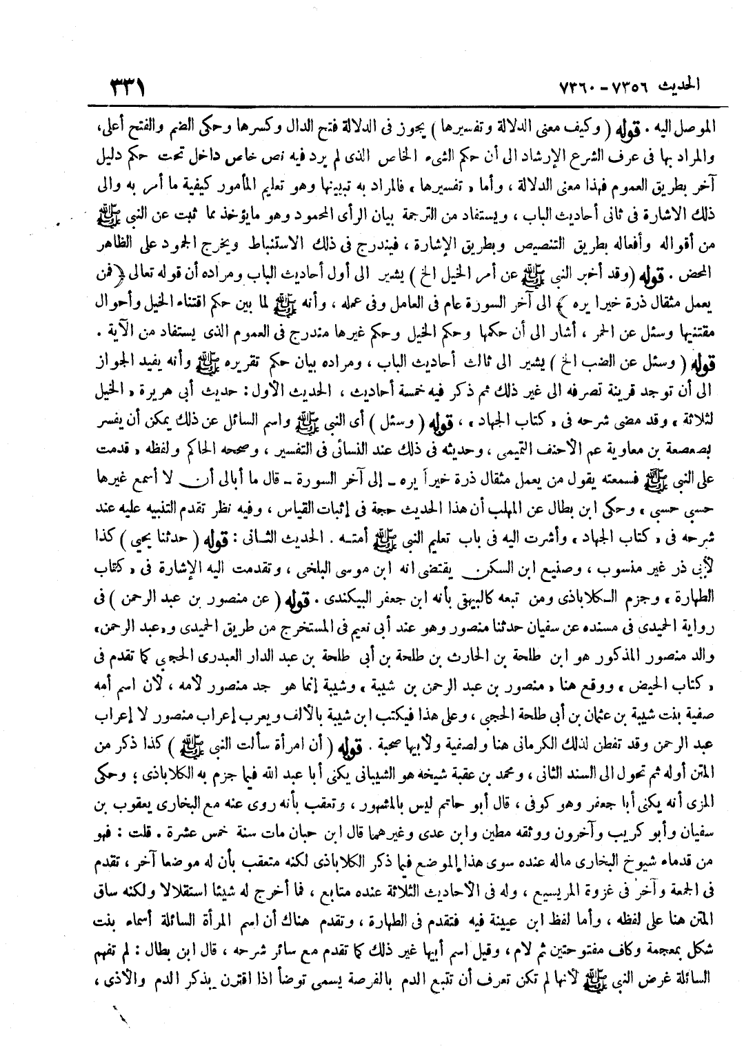 الْمُوَصِّلِ إِلَيْهِ قَوْلُهُ وَكَيْفَ مَعْنَى الدَّلَالَةِ وَتَفْسِيرُهَا يَجُوزُ فِي الدَّلَالَةِ فَتْحُ الدَّالِ وَكَسْرِهَا وَحُكِيَ الضَّمُّ وَالْفَتْحُ أَعْلَى وَالْمُرَادُ بِهَا فِي عُرْفِ الشَّرْعِ الْإِرْشَادُ إِلَى أَنَّ حُكْمَ الشَّيْءِ الْخَاصِّ الَّذِي لَمْ يَرِدْ فِيهِ نَصٌّ خَاصٌّ دَاخِلٌ تَحْتَ حُكْمِ دَلِيلٍ آخَرَ بِطَرِيقِ الْعُمُومِ فَهَذَا مَعْنَى الدَّلَالَةِ وَأَمَّا تَفْسِيرُهَا فَالْمُرَادُ بِهِ تَبْيِينُهَا وَهُوَ تَعْلِيمُ الْمَأْمُورِ كَيْفِيَّةَ مَا أُمِرَ بِهِ وَإِلَى ذَلِكَ الْإِشَارَةُ فِي ثَانِي أَحَادِيثِ الْبَابِ وَيُسْتَفَادُ مِنَ التَّرْجَمَةِ بَيَانُ الرَّأْيِ الْمَحْمُودِ وَهُوَ مَا يُؤْخَذُ مِمَّا ثَبَتَ عَنِ النَّبِيِّ صَلَّى اللَّهُ عَلَيْهِ وَسَلَّمَ مِنْ أَقْوَالِهِ وَأَفْعَالِهِ بِطَرِيقِ التَّنْصِيصِ وَبِطَرِيقِ الْإِشَارَةِ فَيَنْدَرِجُ فِي ذَلِكَ الِاسْتِنْبَاطُ وَيَخْرُجُ الْجُمُودُ عَلَى الظَّاهِرِ الْمَحْضِ قَوْلُهُ وَقَدْ أَخْبَرَ النَّبِيُّ صَلَّى اللَّهُ عَلَيْهِ وَسَلَّمَ عَنْ أَمْرِ الْخَيْلِ إِلَخْ يُشِيرُ إِلَى أَوَّلِ أَحَادِيثِ الْبَابِ وَمُرَادُهُ أَنَّ قَوْلَهُ تَعَالَى فَمَنْ يَعْمَلْ مِثْقَالَ ذَرَّةٍ خَيْرًا يَرَهُ إِلَى آخَرِ السُّورَةِ عَامٌّ فِي الْعَامِلِ وَفِي عَمَلِهِ وَأَنَّهُ صَلَّى اللَّهُ عَلَيْهِ وَسَلَّمَ لَمَّا بَيَّنَ حُكْمَ اقْتِنَاءِ الْخَيْلِ وَأَحْوَالِ مُقْتَنِيهَا وَسُئِلَ عَنِ الْحُمُرِ أَشَارَ إِلَى أَنَّ حُكْمَهَا وَحُكْمَ الْخَيْلِ وَحُكْمَ غَيْرِهَا مُنْدَرِجٌ فِي الْعُمُومِ الَّذِي يُسْتَفَادُ مِنَ الْآيَةِ قَوْلُهُ وَسُئِلَ عَنِ الضَّبِّ إِلَخْ يُشِيرُ إِلَى ثَالِثِ أَحَادِيثِ الْبَابِ وَمُرَادُهُ بَيَانُ حُكْمِ تَقْرِيرِهِ صَلَّى اللَّهُ عَلَيْهِ وَسَلَّمَ وَأَنَّهُ يُفِيدُ الْجَوَازَ إِلَى أَنْ تُوجَدَ قَرِينَةٌ تَصْرِفُهُ إِلَى غَيْرِ ذَلِكَ ثُمَّ ذَكَرَ فِيهِ خَمْسَةَ أَحَادِيثَ الْحَدِيثُ الْأَوَّلُ حَدِيثُ أَبِي هُرَيْرَةَ الْخَيْلُ لِثَلَاثَةٍ وَقَدْ مَضَى شَرْحُهُ فِي كِتَابِ الْجِهَادِ قَوْلُهُ وَسُئِلَ أَيِ النَّبِيُّ صَلَّى اللَّهُ عَلَيْهِ وَسَلَّمَ وَاسْمُ السَّائِلِ عَنْ ذَلِكَ يُمْكِنُ أَنْ يُفَسَّرَ بِصَعْصَعَةَ بْنِ مُعَاوِيَةَ عَمِّ الْأَحْنَفِ التَّمِيمِيِّ وَحَدِيثُهُ فِي ذَلِكَ عِنْدَ النَّسَائِيِّ فِي التَّفْسِيرِ وَصَحَّحَهُ الْحَاكِمُ وَلَفْظُهُ قَدِمْتُ عَلَى النَّبِيِّ صَلَّى اللَّهُ عَلَيْهِ وَسَلَّمَ فَسَمِعْتُهُ يَقُولُ مَنْ يَعْمَلُ مِثْقَالَ ذَرَّةٍ خَيْرًا يَرَهُ إِلَى آخَرِ السُّورَةِ قَالَ مَا أُبَالِي أَنْ لَا أَسْمَعَ غَيْرَهَا حَسْبِي حَسْبِي وَحكى بن بَطَّالٍ عَنِ الْمُهَلَّبِ أَنَّ هَذَا الْحَدِيثَ حُجَّةٌ فِي إِثْبَاتِ الْقِيَاسِ وَفِيهِ نَظَرٌ تَقَدَّمَ التَّنْبِيهُ عَلَيْهِ عِنْدَ شَرْحِهِ فِي كِتَابِ الْجِهَادِ وَأَشَرْتُ إِلَيْهِ فِي بَابِ تَعْلِيمِ النَّبِيِّ صَلَّى اللَّهُ عَلَيْهِ وَسَلَّمَ أُمَّتَهُ الْحَدِيثُ الثَّانِي قَوْلُهُ حَدَّثَنَا يَحْيَى كَذَا لِأَبِي ذَرٍّ غَيْرُ مَنْسُوبٍ وَصَنِيعُ بن السكن يَقْتَضِي أَنه بن مُوسَى الْبَلْخِيُّ وَتَقَدَّمَتْ إِلَيْهِ الْإِشَارَةُ فِي كِتَابِ الطَّهَارَةِ وَجَزَمَ الْكَلَابَاذِيُّ وَمَنْ تَبِعَهُ كَالْبَيْهَقِيِّ بِأَنَّهُ بن جَعْفَرٍ الْبِيكَنْدِيُّ قَوْلُهُ عَنْ مَنْصُورِ بْنِ عَبْدِ الرَّحْمَنِ فِي رِوَايَةِ الْحُمَيْدِيِّ فِي مُسْنَدِهِ عَنْ سُفْيَانَ حَدَّثَنَا مَنْصُورٌ وَهُوَ عِنْدَ أَبِي نُعَيْمٍ فِي الْمُسْتَخْرَجِ مِنْ طَرِيقِ الْحميدِي وَعبد الرَّحْمَن وَالِد مَنْصُور الْمَذْكُور هُوَ بْنُ طَلْحَةَ بْنِ الْحَارِثِ بْنِ طَلْحَةَ بْنِ أ
