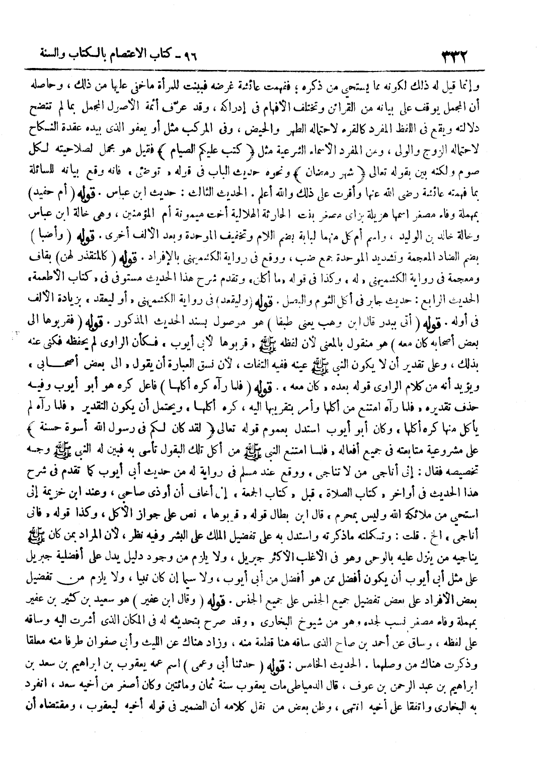 وانما قيل لَهُ ذَلِك لكَونه مِمَّا يستحيي مِنْ ذِكْرِهِ فَفَهِمَتْ عَائِشَةُ غَرَضَهُ فَبَيَّنَتْ لِلْمَرْأَةِ مَا خَفِيَ عَلَيْهَا مِنْ ذَلِكَ وَحَاصِلُهُ أَنَّ الْمُجْمَلَ يُوقَفُ عَلَى بَيَانِهِ مِنَ الْقَرَائِنِ وَتَخْتَلِفُ الْأَفْهَامُ فِي إِدْرَاكِهِ وَقَدْ عَرَّفَ أَئِمَّةُ الْأُصُولِ الْمُجْمَلَ بِمَا لَمْ تَتَّضِحْ دَلَالَتُهُ وَيَقَعُ فِي اللَّفْظِ الْمُفْرَدِ كَالْقُرْءِ لِاحْتِمَالِهِ الطُّهْرِ وَالْحَيْضِ وَفِي الْمُرَكَّبِ مِثْلَ أَوْ يَعْفُوَ الَّذِي بِيَدِهِ عُقْدَةُ النِّكَاحِ لِاحْتِمَالِهِ الزَّوْجِ وَالْوَلِيِّ وَمِنَ الْمُفْرَدِ الْأَسْمَاءُ الشَّرْعِيَّة مثل كتب عَلَيْكُم الصّيام فَقِيلَ هُوَ مُجْمَلٌ لِصَلَاحِيَّتِهِ لِكُلِّ صَوْمٍ وَلَكِنَّهُ بَيَّنَ بِقَوْلِهِ تَعَالَى شَهْرُ رَمَضَانَ وَنَحْوِهِ حَدِيثَ الْبَابِ فِي قَوْلِهِ تَوَضَّئِي فَإِنَّهُ وَقَعَ بَيَانُهُ لِلسَّائِلَةِ بِمَا فَهِمَتْهُ عَائِشَةُ رَضِيَ اللَّهُ عَنْهَا وَأُقِرَّتْ عَلَى ذَلِكَ وَاللَّهُ أَعْلَمُ الْحَدِيثُ الثَّالِثُ حَدِيث بن عَبَّاسٍ