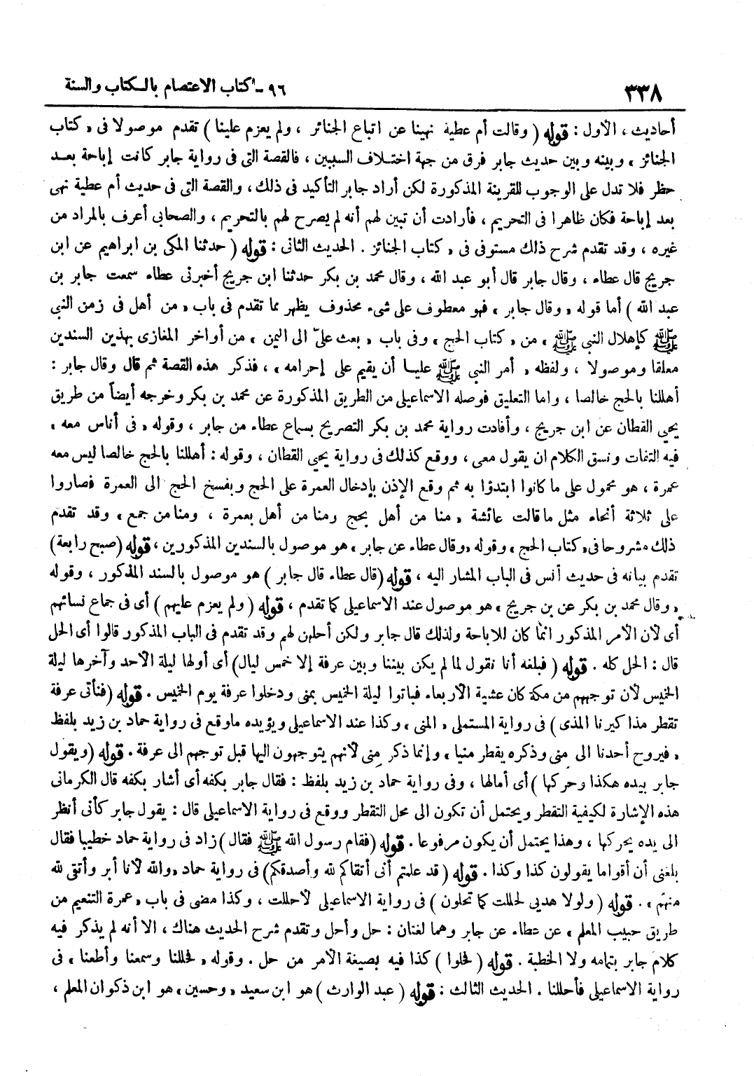 [7367] قَوْلُهُ حَدَّثَنَا الْمَكِّيُّ بْنُ إِبْرَاهِيمَ عَنِ بن جُرَيْجٍ قَالَ عَطَاءٌ وَقَالَ جَابِرٌ قَالَ أَبُو عَبْدِ اللَّهِ وَقَالَ مُحَمَّدُ بْنُ بَكْرٍ حَدَّثَنَا بن جُرَيْجٍ أَخْبَرَنِي عَطَاءٌ سَمِعْتُ جَابِرَ بْنَ عَبْدِ اللَّهِ أَمَّا قَوْلُهُ وَقَالَ جَابِرٌ فَهُوَ مَعْطُوفٌ عَلَى شَيْءٍ مَحْذُوفٍ يَظْهَرُ مِمَّا تَقَدَّمَ فِي بَابِ مَنْ أَهَلَّ فِي زَمَنِ النَّبِيِّ صَلَّى اللَّهُ عَلَيْهِ وَسَلَّمَ كَإِهْلَالِ النَّبِيِّ صَلَّى اللَّهُ عَلَيْهِ وَسَلَّمَ مِنْ كِتَابِ الْحَجِّ وَفِي بَابِ بعث عَليّ إِلَى الْيمن من اواخر الْمَغَازِي بِهَذَيْنِ السَّنَدَيْنِ مُعَلَّقًا وَمَوْصُولًا وَلَفْظُهُ أَمَرَ النَّبِيُّ صَلَّى اللَّهُ عَلَيْهِ وَسَلَّمَ عَلِيًّا أَنْ يُقِيمَ عَلَى إِحْرَامِهِ فَذَكَرَ هَذِهِ الْقِصَّةَ ثُمَّ قَالَ وَقَالَ جَابِرٌ أَهْلَلْنَا بِالْحَجِّ خَالِصًا وَأَمَّا التَّعْلِيقُ فَوَصَلَهُ الْإِسْمَاعِيلِيُّ مِنَ الطَّرِيقِ الْمَذْكُورَةِ عَنْ مُحَمَّدِ بْنِ بَكْرٍ وَخَرَّجَهُ أَيْضًا مِنْ طَرِيقِ يحيى الْقطَّان عَن بن جُرَيْجٍ وَأَفَادَتْ رِوَايَةُ مُحَمَّدِ بْنِ بَكْرٍ التَّصْرِيحَ بِسَمَاعِ عَطَاءٍ مِنْ جَابِرٍ وَقَوْلُهُ فِي أُنَاسٍ مَعَهُ فِيهِ الْتِفَاتٌ وَنَسَقُ الْكَلَامِ أَنْ يَقُولَ مَعِي وَوَقَعَ كَذَلِكَ فِي رِوَايَةِ يَحْيَى الْقَطَّانِ وَقَوْلُهُ أَهْلَلْنَا بِالْحَجِّ خَالِصًا لَيْسَ مَعَهُ عُمْرَةٌ هُوَ مَحْمُول على مَا كَانُوا ابتدؤا بِهِ ثُمَّ وَقَعَ الْإِذْنُ بِإِدْخَالِ الْعُمْرَةِ عَلَى الْحَجِّ وَبِفَسْخِ الْحَجِّ إِلَى الْعُمْرَةِ فَصَارُوا عَلَى ثَلَاثَةِ أَنْحَاءٍ مِثْلَ مَا قَالَتْ عَائِشَةُ مِنَّا مَنْ أَهَلَّ بِحَجٍّ وَمِنَّا مَنْ أَهَلَّ بِعُمْرَةٍ وَمِنَّا مَنْ جَمَعَ وَقَدْ تَقَدَّمَ ذَلِكَ مَشْرُوحًا فِي كِتَابِ الْحَجِّ وَقَوْلُهُ وَقَالَ عَطَاءٌ عَنْ جَابِرٍ هُوَ مَوْصُولٌ بِالسَّنَدَيْنِ الْمَذْكُورَيْنِ قَوْلُهُ صُبْحَ رَابِعَةٍ تَقَدَّمَ بَيَانُهُ فِي حَدِيثِ أَنَسٍ فِي الْبَابِ الْمُشَارِ إِلَيْهِ قَوْلُهُ قَالَ عَطَاءٌ قَالَ جَابِرٌ هُوَ مَوْصُولٌ بِالسَّنَدِ الْمَذْكُورِ وَقَوْلُهُ وَقَالَ مُحَمَّد بن بكر عَن بن جُرَيْجٍ هُوَ مَوْصُولٌ عِنْدَ الْإِسْمَاعِيلِيِّ كَمَا تَقَدَّمَ قَوْلُهُ وَلَمْ يَعْزِمْ عَلَيْهِمْ أَيْ فِي جِمَاعِ نِسَائِهِمْ أَيْ لِأَنَّ الْأَمْرَ الْمَذْكُورَ إِنَّمَا كَانَ لِلْإِبَاحَةِ وَلِذَلِكَ قَالَ جَابِرٌ وَلَكِنْ أَحَلَّهُنَّ لَهُمْ وَقَدْ تَقَدَّمَ فِي الْبَابِ الْمَذْكُورِ قَالُوا أَيُّ الْحِلِّ قَالَ الْحِلُّ كُلُّهُ قَوْلُهُ فَبَلَغَهُ أَنَّا نَقُولُ لَمَّا لَمْ يَكُنْ بَيْنَنَا وَبَيْنَ عَرَفَةَ إِلَّا خَمْسُ لَيَالٍ أَيْ أَوَّلُهَا لَيْلَةُ الْأَحَدِ وَآخِرُهَا لَيْلَةُ الْخَمِيسِ لِأَنَّ تَوَجُّهِهِمْ مِنْ مَكَّةَ كَانَ عَشِيَّةَ الْأَرْبِعَاءِ فَبَاتُوا لَيْلَةَ الْخَمِيسِ بِمِنًى وَدَخَلُوا عَرَفَةَ يَوْمَ الْخَمِيسِ قَوْلُهُ فَنَأْتِي عَرَفَةَ تَقْطُرُ مَذَاكِيرُنَا الْمَذْيَ فِي رِوَايَةِ الْمُسْتَمْلِي الْمَنِيَّ وَكَذَا عِنْدَ الْإِسْمَاعِيلِيِّ وَيُؤَيِّدُهُ مَا وَقَعَ فِي رِوَايَةِ حَمَّادِ بْنِ زَيْدٍ بِلَفْظِ فَيَرُوحُ أَحَدُنَا إِلَى مِنًى وَذَكَرُهُ يَقْطُرُ مَنِيًّا وَإِنَّمَا ذَكَرَ مِنًى لِأَنَّهُمْ يَتَوَجَّهُونَ إِلَيْهَا قَبْلَ تَوَجُّهِهِمْ إِلَى عَرَفَةَ قَوْلُهُ وَيَقُولُ جَابِرٌ بِيَدِهِ هَكَذَا وَحَرَّكَهَا أَيْ أَمَالَهَا وَفِي رِوَايَةِ حَمَّادِ بْنِ زَيْدٍ بِلَفْظِ فَقَالَ جَابِرٌ بِكَفِّهِ أَيْ أَشَارَ بِكَفِّهِ قَالَ الْكِرْمَانِيُّ هَذِهِ الْإِشَارَةُ لِكَيْفِيَّةِ التَّقَطُّرِ وَيَحْتَمِلُ ان تكون إِلَى مَحَلِ