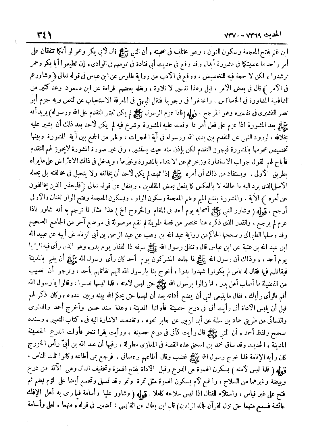 بْنِ غَنْمٍ بِفَتْحِ الْمُعْجَمَةِ وَسُكُونِ النُّونِ وَهُوَ مُخْتَلَفٌ فِي صُحْبَتِهِ أَنَّ النَّبِيَّ صَلَّى اللَّهُ عَلَيْهِ وَسَلَّمَ قَالَ لِأَبِي بَكْرٍ وَعُمَرَ لَوْ أَنَّكُمَا تَتَّفِقَانِ عَلَى أَمْرٍ وَاحِدٍ مَا عَصَيْتُكُمَا فِي مَشُورَةٍ أَبَدًا وَقَدْ وَقَعَ فِي حَدِيثِ أَبِي قَتَادَةَ فِي نَوْمِهِمْ فِي الْوَادِي إِنْ تُطِيعُوا أَبَا بَكْرٍ وَعُمَرَ تَرْشُدُوا لَكِنْ لَا حُجَّةَ فِيهِ لِلتَّخْصِيصِ وَوَقَعَ فِي الْأَدَبِ مِنْ رِوَايَة طَاوس عَن بن عَبَّاسٍ فِي قَوْلِهِ تَعَالَى وَشَاوِرْهُمْ فِي الْأَمْرِ قَالَ فِي بَعْضُ الْأَمْرِ قِيلَ وَهَذَا تَفْسِيرٌ لَا تِلَاوَة وَنَقله بَعضهم قِرَاءَة عَن بن مَسْعُودٍ وَعَدَّ كَثِيرٌ مِنَ الشَّافِعِيَّةِ الْمُشَاوَرَةَ فِي الْخَصَائِصِ وَاخْتَلَفُوا فِي وُجُوبِهَا فَنَقَلَ الْبَيْهَقِيُّ فِي الْمَعْرِفَةِ الِاسْتِحْبَابَ عَنِ النَّصِّ وَبِهِ جَزَمَ أَبُو نصر الفشيري فِي تَفْسِيرِهِ وَهُوَ الْمُرَجَّحُ قَوْلُهُ فَإِذَا عَزَمَ الرَّسُولُ صَلَّى اللَّهُ عَلَيْهِ وَسَلَّمَ لَمْ يَكُنْ لِبَشَرٍ التَّقَدُّمُ عَلَى اللَّهِ وَرَسُولِهِ يُرِيدُ أَنَّهُ صَلَّى اللَّهُ عَلَيْهِ وَسَلَّمَ بَعْدَ الْمَشُورَةِ إِذَا عَزَمَ عَلَى فِعْلِ أَمْرٍ مِمَّا وَقَعَتْ عَلَيْهِ الْمَشُورَةُ وَشَرَعَ فِيهِ لَمْ يَكُنْ لِأَحَدٍ بَعْدَ ذَلِكَ أَنْ يُشِيرَ عَلَيْهِ بِخِلَافِهِ لِوُرُودِ النَّهْيِ عَنِ التَّقَدُّمِ بَيْنَ يَدَيِ اللَّهِ وَرَسُولِهِ فِي آيَةِ الْحُجُرَاتِ وَظَهَرَ مِنَ الْجَمْعِ بَيْنَ آيَةِ الْمَشُورَةِ وَبَيْنَهَا تَخْصِيصُ عُمُومِهَا بِالْمَشُورَةِ فَيَجُوزُ التَّقَدُّمُ لَكِنْ بِإِذْنٍ مِنْهُ حَيْثُ يَسْتَشِيرُ وَفِي غَيْرِ صُورَةِ الْمَشُورَةِ لَا يَجُوزُ لَهُمُ التَّقَدُّمُ فَأَبَاحَ لَهُمُ الْقَوْلَ جَوَابَ الِاسْتِشَارَةِ وَزَجَرَهُمْ عَنِ الِابْتِدَاءِ بِالْمَشُورَةِ وَغَيْرَهَا وَيَدْخُلُ فِي ذَلِكَ الِاعْتِرَاضُ عَلَى مَا يَرَاهُ بِطَرِيقِ الْأَوْلَى وَيُسْتَفَادُ مِنْ ذَلِكَ أَنَّ أَمْرَهُ صَلَّى اللَّهُ عَلَيْهِ وَسَلَّمَ إِذَا ثَبَتَ لَمْ يَكُنْ لِأَحَدٍ أَنْ يُخَالِفَهُ وَلَا يَتَحَيَّلَ فِي مُخَالَفَتِهِ بَلْ يَجْعَلُهُ الْأَصْلَ الَّذِي يَرُدُّ إِلَيْهِ مَا خَالَفَهُ لَا بِالْعَكْسِ كَمَا يَفْعَلُ بَعْضُ الْمُقَلِّدِينَ وَيَغْفُلُ عَنْ قَوْلِهِ تَعَالَى فَلْيَحْذَرِ الَّذِينَ يُخَالِفُونَ عَنْ أَمْرِهِ الْآيَةَ وَالْمَشُورَةُ بِفَتْحِ الْمِيمِ وَضَمِّ الْمُعْجَمَةِ وَسُكُونِ الْوَاوِ وَبِسُكُونِ الْمُعْجَمَةِ وَفَتْحِ الْوَاوِ لُغَتَانِ وَالْأُولَى أَرْجَحُ قَوْلُهُ وَشَاوَرَ النَّبِيُّ صَلَّى اللَّهُ عَلَيْهِ وَسَلَّمَ أَصْحَابَهُ يَوْمَ أُحُدٍ فِي الْمُقَامِ وَالْخُرُوجِ إِلَخْ هَذَا مِثَالٌ لِمَا تَرْجَمَ بِهِ أَنَّهُ شَاوَرَ فَإِذَا عَزَمَ لَمْ يَرْجِعْ وَالْقَدْرُ الَّذِي ذَكَرَهُ هُنَا مُخْتَصَرٌ مِنْ قِصَّةٍ طَوِيلَةٍ لَمْ تَقَعْ مَوْصُولَةً فِي مَوْضِعٍ آخَرَ مِنَ الْجَامِعِ الصَّحِيحِ وَقَدْ وَصَلَهَا الطَّبَرَانِيُّ وَصَحَّحَهَا الْحَاكِمُ مِنْ رِوَايَةِ عَبْدِ اللَّهِ بْنِ وَهْبٍ عَنْ عَبْدِ الرَّحْمَنِ بْنِ أَبِي الزِّنَادِ عَنْ أَبِيهِ عَنْ عُبَيْدِ اللَّهِ بْنِ عَبْدِ اللَّهِ بْنِ عُتْبَةَ عَن بن عَبَّاسٍ قَالَ تَنَفَّلَ رَسُولُ اللَّهِ صَلَّى اللَّهُ عَلَيْهِ وَسَلَّمَ سَيْفَهُ ذَا الْفَقَارِ يَوْمَ بَدْرٍ وَهُوَ الَّذِي رَأَى فِيهِ الرُّؤْيَا يَوْمَ أُحُدٍ وَذَلِكَ أَنَّ رَسُولَ اللَّهِ صَلَّى اللَّهُ عَلَيْهِ وَسَلَّمَ لَمَّا جَاءَهُ الْمُشْرِكُونَ يَوْمَ أُحُدٍ كَانَ رَأَى رَسُولُ اللَّهِ صَلَّى اللَّهُ عَلَيْهِ وَسَلَّمَ أَنْ يُقِيمَ بِالْمَدِينَةِ فَيُقَات
