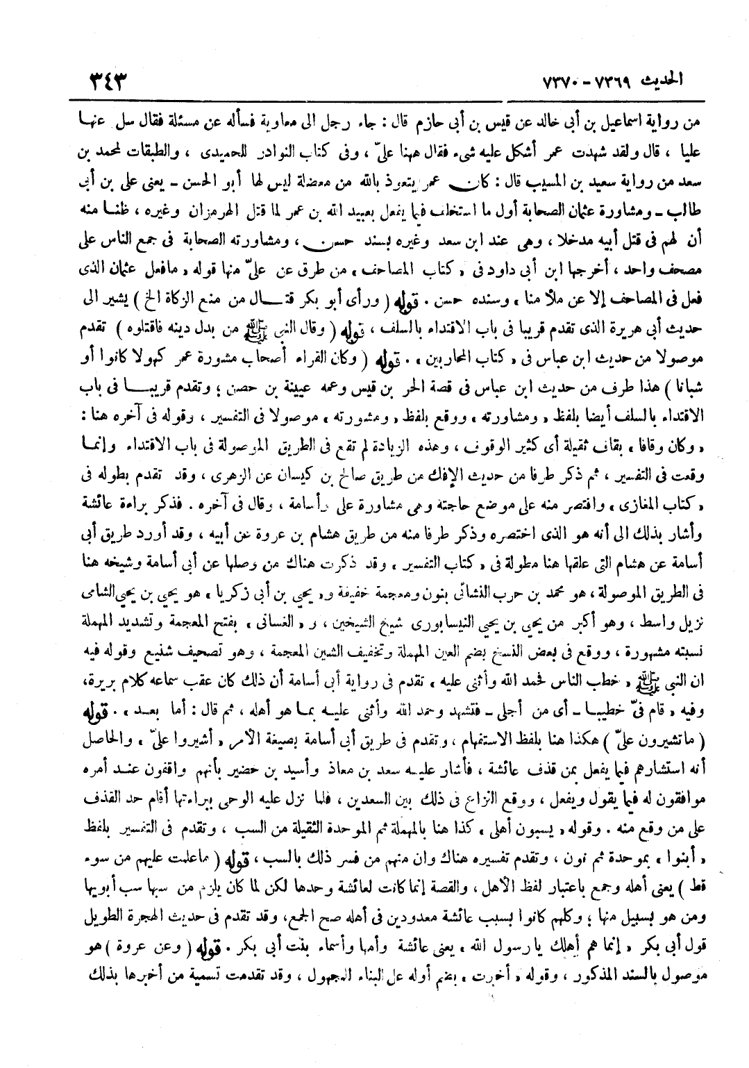 مِنْ رِوَايَةِ إِسْمَاعِيلَ بْنِ أَبِي خَالِدٍ عَنْ قَيْسِ بْنِ أَبِي حَازِمٍ قَالَ جَاءَ رَجُلٌ إِلَى مُعَاوِيَةَ فَسَأَلَهُ عَنْ مَسْأَلَةٍ فَقَالَ سَلْ عَنْهَا عَلِيًّا قَالَ وَلَقَدْ شَهِدْتُ عُمَرَ أَشْكَلَ عَلَيْهِ شَيْء فَقَالَ هَا هُنَا عَلِيٌّ وَفِي كِتَابِ النَّوَادِرِ لِلْحُمَيْدِيِّ وَالطَّبَقَاتِ لِمُحَمَّدِ بْنِ سَعْدٍ مِنْ رِوَايَةِ سَعِيدِ بْنِ الْمُسَيَّبِ قَالَ كَانَ عُمَرُ يَتَعَوَّذُ بِاللَّهِ مِنْ مُعْضِلَةٍ لَيْسَ لَهَا أَبُو الْحَسَنِ يَعْنِي عَلِيَّ بْنَ أَبِي طَالِبٍ وَمُشَاوَرَةُ عُثْمَانَ الصَّحَابَةَ أَوَّلَ مَا اسْتُخْلِفَ فِيمَا يَفْعَلُ بِعُبَيْدِ اللَّهِ بْنِ عُمَرَ لَمَّا قَتَلَ الْهُرْمُزَانَ وَغَيْرَهُ ظَنًّا مِنْهُ أَنَّ لَهُمْ فِي قَتْلِ أَبِيهِ مَدْخَلًا وَهِيَ عِنْدَ بن سَعْدٍ وَغَيْرِهِ بِسَنَدٍ حَسَنٍ وَمُشَاوَرَتُهُ الصَّحَابَةَ فِي جمع النَّاس على مصحف وَاحِد أخرجهَا بْنُ أَبِي دَاوُدَ فِي كِتَابِ الْمَصَاحِفِ مِنْ طُرُقٍ عَنْ عَلِيٍّ مِنْهَا قَوْلُهُ مَا فَعَلَ عُثْمَانُ الَّذِي فَعَلَ فِي الْمَصَاحِفِ إِلَّا عَنْ مَلَأٍ مِنَّا وَسَنَدُهُ حَسَنٌ قَوْلُهُ وَرَأَى أَبُو بَكْرٍ قِتَالَ مَنْ مَنَعَ الزَّكَاةَ إِلَخْ يُشِيرُ إِلَى حَدِيثِ أَبِي هُرَيْرَةَ الَّذِي تَقَدَّمَ قَرِيبًا فِي بَابِ الِاقْتِدَاءِ بِالسَّلَفِ قَوْلُهُ وَقَالَ النَّبِيُّ صَلَّى اللَّهُ عَلَيْهِ وَسَلَّمَ مَنْ بَدَّلَ دِينَهُ فَاقْتُلُوهُ تقدم مَوْصُولا من حَدِيث بن عَبَّاسٍ فِي كِتَابِ الْمُحَارِبِينَ قَوْلُهُ وَكَانَ الْقُرَّاءُ أَصْحَابَ مَشُورَةِ عُمَرَ كُهُولًا كَانُوا أَوْ شُبَّانًا هَذَا طرف من حَدِيث بن عَبَّاسٍ فِي قِصَّةِ الْحُرِّ بْنِ قَيْسٍ وَعَمِّهِ عُيَيْنَةَ بْنِ حِصْنٍ وَتَقَدَّمَ قَرِيبًا فِي بَابِ الِاقْتِدَاءِ بِالسَّلَفِ أَيْضًا بِلَفْظِ وَمُشَاوَرَتُهُ وَوَقَعَ بِلَفْظِ وَمَشُورَتُهُ مَوْصُولًا فِي التَّفْسِيرِ وَقَوْلُهُ فِي آخِرِهِ هُنَا وَكَانَ وَقَّافًا بِقَافٍ ثَقِيلَةٍ أَيْ كَثِيرُ الْوُقُوفِ وَهَذِهِ الزِّيَادَةُ لَمْ تَقَعْ فِي الطَّرِيقِ الْمَوْصُولَةِ فِي بَابِ الِاقْتِدَاءِ وَإِنَّمَا وَقَعَتْ فِي التَّفْسِيرِ ثُمَّ ذَكَرَ طَرَفًا مِنْ حَدِيثِ الْإِفْكِ مِنْ طَرِيقِ صَالِحِ بْنِ كَيْسَانَ عَنِ الزُّهْرِيِّ وَقَدْ تَقَدَّمَ بِطُولِهِ فِي كِتَابِ الْمَغَازِي وَاقْتَصَرَ مِنْهُ عَلَى مَوْضِعِ حَاجَتِهِ وَهِيَ مُشَاوَرَةُ عَلِيٍّ وَأُسَامَةَ وَقَالَ فِي آخِرِهِ فَذَكَرَ بَرَاءَةَ عَائِشَةَ وَأَشَارَ بِذَلِكَ إِلَى أَنَّهُ هُوَ الَّذِي اخْتَصَرَهُ وَذَكَرَ طَرَفًا مِنْهُ مِنْ طَرِيقِ هِشَامِ بْنِ عُرْوَةَ عَنْ أَبِيهِ وَقَدْ أَوْرَدَ طَرِيقَ أَبِي أُسَامَةَ عَنْ هِشَامٍ الَّتِي عَلَّقَهَا هُنَا مُطَوَّلَةً فِي كِتَابِ التَّفْسِيرِ وَقَدْ ذَكَرْتُ هُنَاكَ مَنْ وَصَلَهَا عَنْ أَبِي أُسَامَةَ وَشَيْخُهُ هُنَا فِي الطَّرِيقِ الْمَوْصُولَةِ هُوَ مُحَمَّدُ بْنُ حَرْبٍ النَّشَائِيُّ بنُون ومعجمة خَفِيفَة وَيحيى بْنُ أَبِي زَكَرِيَّا هُوَ يَحْيَى بْنُ يَحْيَى الشَّامِيُّ نَزِيلُ وَاسِطٍ وَهُوَ أَكْبَرُ مِنْ يَحْيَى بن يحيى النَّيْسَابُورِي شيخ الشَّيْخَيْنِ والغساني بِفَتْحِ الْمُعْجَمَةِ وَتَشْدِيدِ الْمُهْمَلَةِ نِسْبَتُهُ مَشْهُورَةٌ وَوَقَعَ فِي بَعْضِ النُّسَخِ بِضَمِّ الْعَيْنِ الْمُهْمَلَةِ وَتَخْفِيفِ الشِّينِ الْمُعْجَمَةِ وَهُوَ تَصْحِيفٌ شَنِيعٌ وَقَوْلُهُ