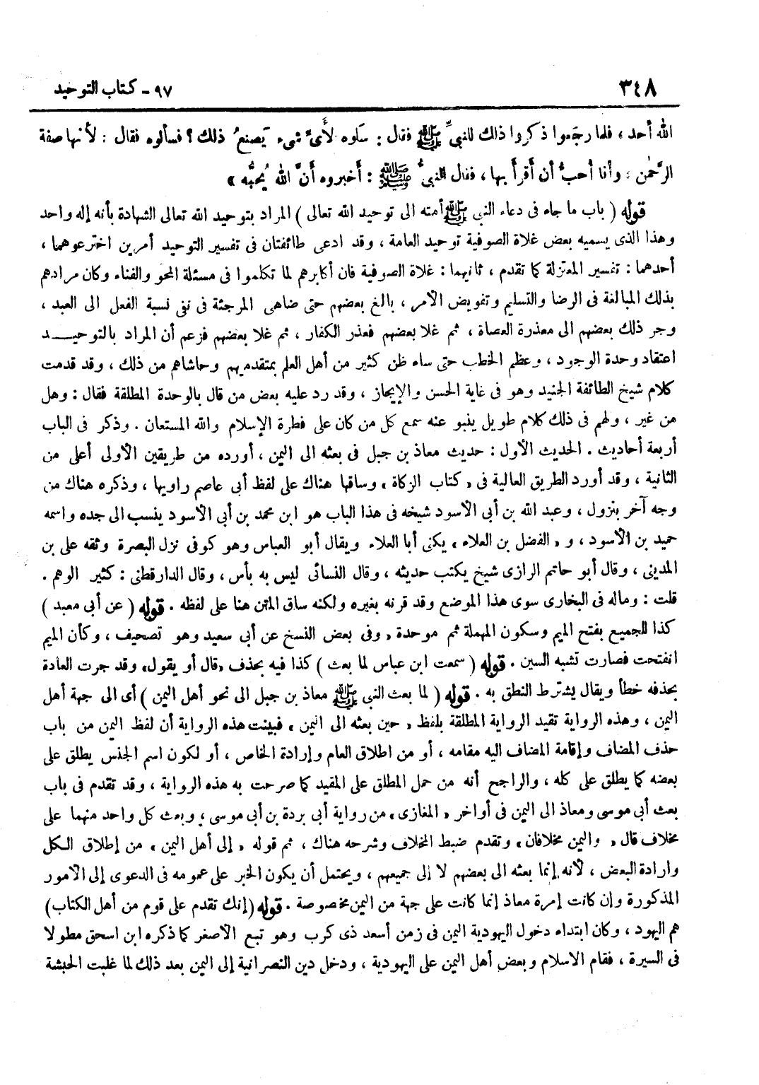 الْمُرَادُ بِتَوْحِيدِ اللَّهِ تَعَالَى الشَّهَادَةُ بِأَنَّهُ إِلَهٌ وَاحِدٌ وَهَذَا الَّذِي يُسَمِّيهِ بَعْضُ غُلَاةِ الصُّوفِيَّةِ تَوْحِيدَ الْعَامَّةِ وَقَدِ ادَّعَى طَائِفَتَانِ فِي تَفْسِيرِ التَّوْحِيدِ أَمْرَيْنِ اخْتَرَعُوهُمَا أَحَدُهُمَا تَفْسِيرُ الْمُعْتَزِلَةِ كَمَا تَقَدَّمَ ثَانِيهُمَا غُلَاةُ الصُّوفِيَّةِ فَإِنَّ أَكَابِرَهُمْ لَمَّا تَكَلَّمُوا فِي مَسْأَلَةِ الْمَحْوِ وَالْفَنَاءِ وَكَانَ مُرَادُهُمْ بِذَلِكَ الْمُبَالَغَةَ فِي الرِّضَا وَالتَّسْلِيمِ وَتَفْوِيضِ الْأَمْرِ بَالَغَ بَعْضُهُمْ حَتَّى ضَاهَى الْمُرْجِئَةَ فِي نَفْيِ نِسْبَةِ الْفِعْلِ إِلَى الْعَبْدِ وَجَرَّ ذَلِكَ بَعْضُهُمْ إِلَى مَعْذِرَةِ الْعُصَاةِ ثُمَّ غَلَا بَعْضُهُمْ فَعَذَرَ الْكُفَّارَ ثُمَّ غَلَا بَعْضُهُمْ فَزَعَمَ أَنَّ الْمُرَادَ بِالتَّوْحِيدِ اعْتِقَادُ وِحْدَةِ الْوُجُودِ وَعَظُمَ الْخَطْبُ حَتَّى سَاءَ ظَنُّ كَثِيرٍ مِنْ أَهْلِ الْعِلْمِ بِمُتَقَدِّمِيهِمْ وَحَاشَاهُمْ مِنْ ذَلِكَ وَقَدْ قَدَّمْتُ كَلَامَ شَيْخِ الطَّائِفَةِ الْجُنَيْدِ وَهُوَ فِي غَايَةِ الْحُسْنِ وَالْإِيجَازِ وَقَدْ رَدَّ عَلَيْهِ بَعْضُ مَنْ قَالَ بِالْوَحْدَةِ الْمُطْلَقَةِ فَقَالَ وَهَلْ مِنْ غَيْرٍ وَلَهُمْ فِي ذَلِكَ كَلَامٌ طَوِيلٌ يَنْبُو عَنْهُ سَمْعُ كُلِّ مَنْ كَانَ عَلَى فِطْرَةِ الْإِسْلَامِ وَاللَّهُ الْمُسْتَعَانُ وَذَكَرَ فِي الْبَابِ أَرْبَعَةَ أَحَادِيثَ الْحَدِيثُ الْأَوَّلُ حَدِيثُ مُعَاذِ بْنِ جَبَلٍ فِي بَعْثِهِ إِلَى الْيَمَنِ أَوْرَدَهُ مِنْ طَرِيقَيْنِ الْأُولَى أَعْلَى مِنَ الثَّانِيَةِ وَقَدْ أَوْرَدَ الطَّرِيقَ الْعَالِيَةَ فِي كِتَابِ الزَّكَاةِ وَسَاقَهَا هُنَاكَ عَلَى لَفْظِ أَبِي عَاصِمٍ رَاوِيهَا وَذَكَرَهُ هُنَاكَ مِنْ وَجْهٍ آخَرَ بِنُزُولٍ وَعَبْدُ اللَّهِ بْنُ أَبِي الْأَسْوَدِ شَيْخه فِي هَذَا الْبَاب هُوَ بن مُحَمَّدِ بْنِ أَبِي الْأَسْوَدِ يُنْسَبُ إِلَى جَدِّهِ واسْمه حميد بن الْأسود وَالْفضل بْنُ الْعَلَاءِ يُكْنَى أَبَا الْعَلَاءِ وَيُقَالُ أَبُو الْعَبَّاسِ وَهُوَ كُوفِيٌّ نَزَلَ الْبَصْرَةَ وَثَّقَهُ عَلِيُّ بن الْمَدِينِيِّ وَقَالَ أَبُو حَاتِمٍ الرَّازِيُّ شَيْخٌ يُكْتَبُ حَدِيثُهُ وَقَالَ النَّسَائِيُّ لَيْسَ بِهِ بَأْسٌ وَقَالَ الدَّارَقُطْنِيّ كثير الْوَهم قلت وَمَاله فِي الْبُخَارِيِّ سِوَى هَذَا الْمَوْضِعِ وَقَدْ قَرَنَهُ بِغَيْرِهِ وَلَكِنَّهُ سَاقَ الْمَتْنَ هُنَا عَلَى لَفْظِهِ