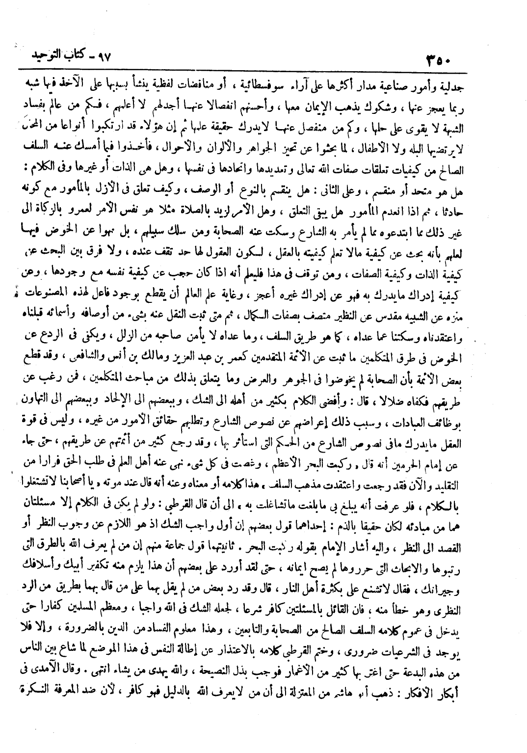 جَدَلِيَّةٍ وَأُمُورٍ صِنَاعِيَّةٍ مَدَارُ أَكْثَرِهَا عَلَى آرَاءٍ سُوفِسْطَائِيَّةٍ أَوْ مُنَاقَضَاتٍ لَفْظِيَّةٍ يَنْشَأُ بِسَبَبِهَا عَلَى الْآخِذِ فِيهَا شُبَهٌ رُبَّمَا يَعْجِزُ عَنْهَا وَشُكُوكٌ يَذْهَبُ الْإِيمَانُ مَعَهَا وَأَحْسَنُهُمُ انْفِصَالًا عَنْهَا أَجَدْلُهُمْ لَا أَعْلَمُهُمْ فَكَمْ مِنْ عَالِمٍ بِفَسَادِ الشُّبْهَةِ لَا يَقْوَى عَلَى حَلِّهَا وَكَمْ مِنْ مُنْفَصِلٍ عَنْهَا لَا يُدْرِكُ حَقِيقَةَ عِلْمِهَا ثُمَّ إِنَّ هَؤُلَاءِ قَدِ ارْتَكَبُوا أَنْوَاعًا مِنَ الْمُحَالِ لَا يَرْتَضِيهَا الْبُلْهُ وَلَا الْأَطْفَالُ لَمَّا بَحَثُوا عَنْ تَحَيُّزِ الْجَوَاهِرِ وَالْأَلْوَانِ وَالْأَحْوَالِ فَأَخَذُوا فِيمَا أَمْسَكَ عَنْهُ السَّلَفُ الصَّالِحُ مِنْ كَيْفِيَّاتِ تَعَلُّقَاتِ صِفَاتِ اللَّهِ تَعَالَى وَتَعْدِيدِهَا وَاتِّحَادِهَا فِي نَفْسِهَا وَهَلْ هِيَ الذَّاتُ أَوْ غَيْرُهَا وَفِي الْكَلَامِ هَلْ هُوَ مُتَّحِدٌ أَوْ مُنْقَسِمٌ وَعَلَى الثَّانِي هَلْ يَنْقَسِمُ بِالنَّوْعِ أَوِ الْوَصْفِ وَكَيْفَ تَعَلَّقَ فِي الْأَزَلِ بِالْمَأْمُورِ مَعَ كَوْنِهِ حَادِثًا ثُمَّ إِذَا انْعَدَمَ الْمَأْمُورُ هَلْ يَبْقَى التَّعَلُّقُ وَهَلِ الْأَمْرُ لِزَيْدٍ بِالصَّلَاةِ مَثَلًا هُوَ نَفْسُ الْأَمْرِ لِعَمْرٍو بِالزَّكَاةِ إِلَى غَيْرِ ذَلِكَ مِمَّا ابْتَدَعُوهُ مِمَّا لَمْ يَأْمُرْ بِهِ الشَّارِعُ وَسَكَتَ عَنْهُ الصَّحَابَةُ وَمَنْ سَلَكَ سَبِيلَهُمْ بَلْ نَهَوْا عَنِ الْخَوْضِ فِيهَا لَعَلَّهُم بِأَنَّهُ بَحْثٌ عَنْ كَيْفِيَّةِ مَا لَا تُعْلَمُ كَيْفِيَّتُهُ بِالْعَقْلِ لِكَوْنِ الْعُقُولِ لَهَا حَدٌّ تَقِفُ عِنْدَهُ وَلَا فَرْقَ بَيْنَ الْبَحْثِ عَنْ كَيْفِيَّةِ الذَّاتِ وَكَيْفِيَّةِ الصِّفَاتِ وَمَنْ تَوَقَّفَ فِي هَذَا فَلْيَعْلَمْ أَنَّهُ إِذَا كَانَ حُجِبَ عَنْ كَيْفِيَّةِ نَفْسِهِ مَعَ وُجُودِهَا وَعَنْ كَيْفِيَّةِ إِدْرَاكِ مَا يُدْرِكُ بِهِ فَهُوَ عَنْ إِدْرَاكِ غَيْرِهِ أَعْجَزُ وَغَايَةُ عِلْمِ الْعَالِمِ أَنْ يَقْطَعَ بِوُجُودِ فَاعِلٍ لِهَذِهِ الْمَصْنُوعَاتِ مُنَزَّهٍ عَنِ الشَّبِيهِ مُقَدَّسٍ عَنِ النَّظِيرِ مُتَّصِفٍ بِصِفَاتِ الْكَمَالِ ثُمَّ مَتَى ثَبَتَ النَّقْلُ عَنْهُ بِشَيْءٍ مِنْ أَوْصَافِهِ وَأَسْمَائِهِ قَبِلْنَاهُ وَاعْتَقَدْنَاهُ وَسَكَتْنَا عَمَّا عَدَاهُ كَمَا هُوَ طَرِيقُ السَّلَفِ وَمَا عَدَاهُ لَا يَأْمَنُ صَاحِبُهُ مِنَ الزَّلَلِ وَيَكْفِي فِي الرَّدْعِ عَنِ الْخَوْضِ فِي طُرُقِ الْمُتَكَلِّمِينَ مَا ثَبَتَ عَنِ الْأَئِمَّةِ الْمُتَقَدِّمِينَ كَعُمَرَ بْنِ عَبْدِ الْعَزِيزِ وَمَالِكِ بْنِ أَنَسٍ وَالشَّافِعِيِّ وَقَدْ قَطَعَ بَعْضُ الْأَئِمَّةِ بِأَنَّ الصَّحَابَةَ لَمْ يَخُوضُوا فِي الْجَوْهَرِ وَالْعَرَضِ وَمَا يَتَعَلَّقُ بِذَلِكَ مِنْ مَبَاحِثِ الْمُتَكَلِّمِينَ فَمَنْ رَغِبَ عَنْ طَرِيقِهِمْ فَكَفَاهُ ضَلَالًا قَالَ وَأَفْضَى الْكَلَامُ بِكَثِيرٍ مِنْ أَهْلِهِ إِلَى الشَّكِّ وَبِبَعْضِهِمْ إِلَى الْإِلْحَادِ وَبِبَعْضِهِمْ إِلَى التَّهَاوُنِ بِوَظَائِفِ الْعِبَادَاتِ وَسَبَبُ ذَلِكَ إِعْرَاضُهُمْ عَنْ نُصُوصِ الشَّارِعِ وَتَطَلُّبُهُمْ حَقَائِقَ الْأُمُورِ مِنْ غَيْرِهِ وَلَيْسَ فِي قُوَّةِ الْعَقْلِ مَا يُدْرِكُ مَا فِي نُصُوصِ الشَّارِعِ مِنَ الْحِكَمِ الَّتِي اسْتَأْثَرَ بِهَا وَقَدْ رَجَعَ كَثِيرٌ مِنْ أَئِمَّتِهِمْ عَنْ طَرِيقِهِمْ حَتَّى جَاءَ عَنْ إِمَامِ الْحَرَمَيْنِ أَنَّهُ قَالَ رَكِبْتُ الْبَحْرَ الْأَعْظَمَ وَغُصْتُ فِي كُلِّ شَيْءٍ نَهَى عَنْهُ أَهْلُ الْعِلْمِ فِي طَلَبِ الْحَقِّ فِرَارًا مِنَ التَّقْلِيدِ وَالْآنَ فَقَدْ رَجَعْتُ وَاعْتَقَدْتُ مَذْهَبَ السَّلَفِ هَذ