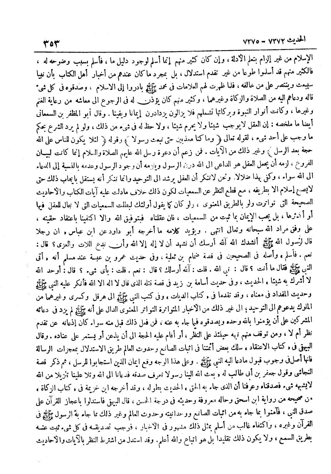 الْإِسْلَامِ مِنْ غَيْرِ إِلْزَامٍ بِتَعَلُّمِ الْأَدِلَّةِ وَإِنْ كَانَ كَثِيرٌ مِنْهُمْ إِنَّمَا أَسْلَمَ لِوُجُودِ دَلِيلٍ مَا فَأَسْلَمَ بِسَبَبِ وُضُوحِهِ لَهُ فَالْكَثِيرُ مِنْهُمْ قَدْ أَسْلَمُوا طَوْعًا مِنْ غَيْرِ تَقَدُّمِ اسْتِدْلَالٍ بَلْ بِمُجَرَّدِ مَا كَانَ عِنْدَهُمْ مِنْ أَخْبَارِ أَهْلِ الْكِتَابِ بِأَنَّ نَبِيًّا سَيُبْعَثُ وَيَنْتَصِرُ عَلَى مَنْ خَالَفَهُ فَلَمَّا ظَهَرَتْ لَهُمُ الْعَلَامَاتُ فِي مُحَمَّدٍ صَلَّى اللَّهُ عَلَيْهِ وَسَلَّمَ بَادَرُوا إِلَى الْإِسْلَام وَصَدقُوهُ فِي كل شَيْءٍ قَالَهُ وَدَعَاهُمْ إِلَيْهِ مِنَ الصَّلَاةِ وَالزَّكَاةِ وَغَيْرِهِمَا وَكَثِيرٌ مِنْهُمْ كَانَ يُؤْذَنُ لَهُ فِي الرُّجُوعِ إِلَى مَعَاشِهِ مِنْ رِعَايَةِ الْغَنَمِ وَغَيْرِهَا وَكَانَتْ أَنْوَارُ النُّبُوَّةِ وَبَرَكَاتُهَا تَشْمَلُهُمْ فَلَا يَزَالُونَ يَزْدَادُونَ إِيمَانًا وَيَقِينًا وَقَالَ أَبُو الْمُظَفَّرِ بْنُ السَّمْعَانِيِّ أَيْضًا مَا مُلَخَّصِهِ إِنَّ الْعَقْلَ لَا يُوجِبُ شَيْئًا وَلَا يُحَرِّمُ شَيْئًا وَلَا حَظَّ لَهُ فِي شَيْءٍ مِنْ ذَلِكَ وَلَوْ لَمْ يَرِدِ الشَّرْعُ بِحُكْمٍ مَا وَجَبَ عَلَى أَحَدٍ شَيْءٌ لِقَوْلِهِ تَعَالَى وَمَا كُنَّا مُعَذِّبِينَ حَتَّى نَبْعَثَ رَسُولا وَقَوْلِهِ لِئَلَّا يَكُونَ لِلنَّاسِ عَلَى اللَّهِ حُجَّةٌ بعد الرُّسُل وَغَيْرِ ذَلِكَ مِنَ الْآيَاتِ فَمَنْ زَعَمَ أَنَّ دَعْوَةَ رُسُلِ اللَّهِ عَلَيْهِمُ الصَّلَاةُ وَالسَّلَامُ إِنَّمَا كَانَتْ لِبَيَانِ الْفُرُوعِ لَزِمَهُ أَنْ يَجْعَلَ الْعَقْلَ هُوَ الدَّاعِي إِلَى اللَّهِ دُونَ الرَّسُولِ وَيَلْزَمُهُ أَنَّ وُجُودَ الرَّسُولِ وَعَدَمَهُ بِالنِّسْبَةِ إِلَى الدُّعَاءِ إِلَى اللَّهِ سَوَاءٌ وَكَفَى بِهَذَا ضَلَالًا وَنَحْنُ لَا نُنْكِرُ أَنَّ الْعَقْلَ يُرْشِدُ إِلَى التَّوْحِيدِ وَإِنَّمَا نُنْكِرُ أَنَّهُ يَسْتَقِلُّ بِإِيجَابِ ذَلِكَ حَتَّى لَا يَصِحَّ إِسْلَامٌ إِلَّا بِطَرِيقِهِ مَعَ قَطْعِ النَّظَرِ عَنِ السَّمْعِيَّاتِ لِكَوْنِ ذَلِكَ خِلَافَ مَا دَلَّتْ عَلَيْهِ آيَاتُ الْكِتَابِ وَالْأَحَادِيثُ الصَّحِيحَةُ الَّتِي تَوَاتَرَتْ وَلَو بِالطَّرِيقِ المعنوى وَلَو كَانَ كَمَا يَقُولُ أُولَئِكَ لَبَطَلَتِ السَّمْعِيَّاتُ الَّتِي لَا مَجَالَ لِلْعَقْلِ فِيهَا أَوْ أَكْثَرِهَا بَلْ يَجِبُ الْإِيمَانُ بِمَا ثَبَتَ مِنَ السَّمْعِيَّاتِ فَإِنْ عَقَلْنَاهُ فَبِتَوْفِيقِ الله والا اكتفينا باعتقاد حقيته عَلَى وَفْقِ مُرَادِ اللَّهِ سُبْحَانَهُ وَتَعَالَى انْتَهَى وَيُؤَيِّدُ كَلَامَهُ مَا أَخْرَجَهُ أَبُو دَاوُدَ عَنِ بن عَبَّاسٍ أَنَّ رَجُلًا قَالَ لِرَسُولِ اللَّهِ صَلَّى اللَّهُ عَلَيْهِ وَسَلَّمَ أَنْشُدُكَ اللَّهَ آللَّهُ أَرْسَلَكَ أَنْ نَشْهَدَ أَنْ لَا إِلَهَ إِلَّا اللَّهُ وَأَنْ نَدَعَ اللَّاتَ وَالْعُزَّى قَالَ نَعَمْ فَأَسْلَمَ وَأَصْلُهُ فِي الصَّحِيحَيْنِ فِي قِصَّةِ ضِمَامِ بْنِ ثَعْلَبَةَ وَفِي حَدِيثِ عَمْرِو بْنِ عَبْسَةَ عِنْدَ مُسْلِمٍ أَنَّهُ أَتَى النَّبِيَّ صَلَّى اللَّهُ عَلَيْهِ وَسَلَّمَ فَقَالَ مَا أَنْتَ قَالَ نَبِيُّ اللَّهِ قُلْتُ آللَّهُ أَرْسَلَكَ قَالَ نَعَمْ قُلْتُ بِأَيِّ شَيْءٍ قَالَ أُوَحِّدُ اللَّهَ لَا أُشْرِكَ بِهِ شَيْئًا الْحَدِيثَ وَفِي حَدِيثِ أُسَامَةَ بْنِ زَيْدٍ فِي قِصَّةِ قَتْلِهِ الَّذِي قَالَ لَا إِلَهَ إِلَّا اللَّهُ فَأَنْكَرَ عَلَيْهِ النَّبِيُّ صَلَّى اللَّهُ عَلَيْهِ وَسَلَّمَ وَحَدِيثِ الْمِقْدَادِ فِي مَعْنَاهُ وَقَدْ تَقَدَّمَا فِي كِتَابِ الدِّيَاتِ وَفِي كَتَبَ النَّبِيِّ صَلَّى اللَّهُ عَلَيْهِ وَسَلَّمَ إِلَى هِرَقْلَ وَكِسْرَى وَغَيْرِهِمَا مِنَ الْمُلُوكِ يَدْعُوهُمْ 