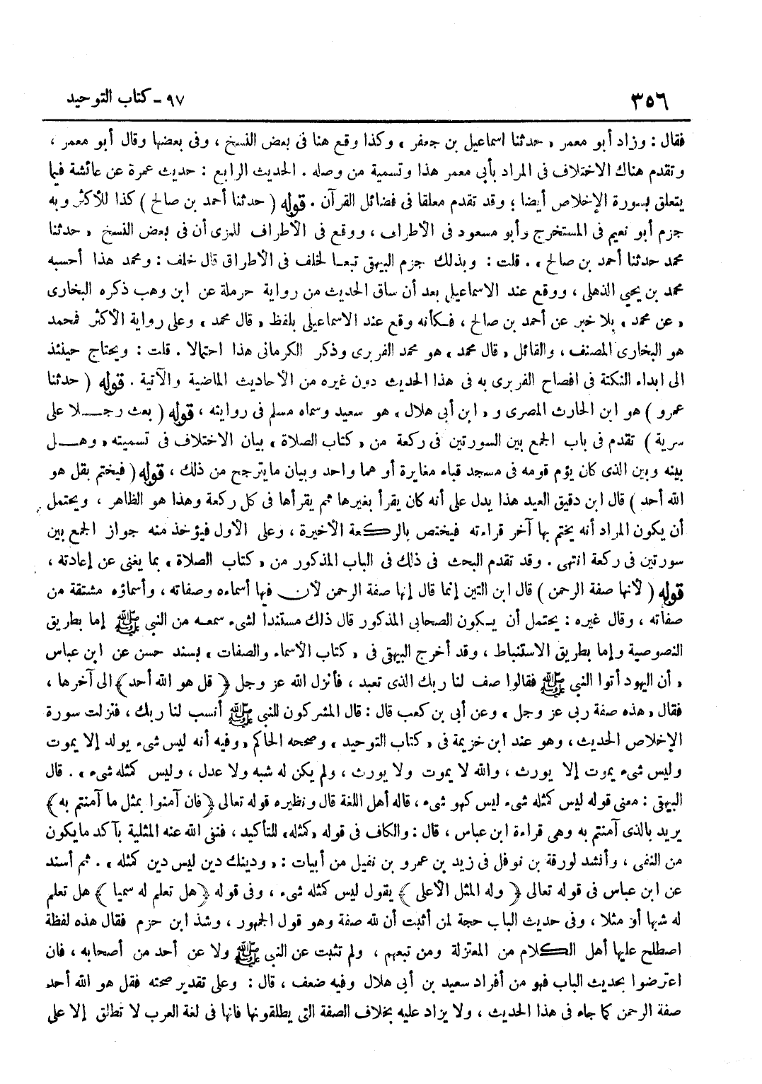 فَقَالَ وَزَادَ أَبُو مَعْمَرٍ حَدَّثَنَا إِسْمَاعِيلُ بْنُ جَعْفَرٍ وَكَذَا وَقَعَ هُنَا فِي بَعْضِ النُّسَخِ وَفِي بَعْضِهَا وَقَالَ أَبُو مَعْمَرٍ وَتَقَدَّمَ هُنَاكَ الِاخْتِلَافُ فِي الْمُرَادِ بِأَبِي مَعْمَرٍ هَذَا وَتَسْمِيَةُ مَنْ وَصَلَهُ الْحَدِيثُ الرَّابِعُ حَدِيثُ عَمْرَةَ عَنْ عَائِشَةَ فِيمَا يَتَعَلَّقُ بِسُورَةِ الْإِخْلَاصِ أَيْضًا وَقَدْ تَقَدَّمَ مُعَلَّقًا فِي فَضَائِلِ الْقُرْآنِ قَوْلُهُ حَدَّثَنَا أَحْمَدُ بْنُ صَالِحٍ كَذَا لِلْأَكْثَرِ وَبِهِ جَزَمَ أَبُو نُعَيْمٍ فِي الْمُسْتَخْرَجِ وَأَبُو مَسْعُودٍ فِي الْأَطْرَافِ وَوَقَعَ فِي الْأَطْرَافِ لِلْمِزِّيِّ أَنَّ فِي بَعْضِ النُّسَخِ حَدَّثَنَا مُحَمَّدٌ حَدَّثَنَا أَحْمَدُ بْنُ صَالِحٍ قُلْتُ وَبِذَلِكَ جَزَمَ الْبَيْهَقِيُّ تَبَعًا لِخَلَفٍ فِي الاطراق قَالَ خَلَفٌ وَمُحَمَّدُ هَذَا أَحْسَبُهُ مُحَمَّدَ بْنَ يَحْيَى الذُّهْلِيَّ وَوَقَعَ عِنْدَ الْإِسْمَاعِيلِيِّ بَعْدَ أَنْ سَاق الحَدِيث من رِوَايَة حَرْمَلَة عَن بن وَهْبٍ ذَكَرَهُ الْبُخَارِيُّ عَنْ مُحَمَّدٍ بِلَا خَبَرٍ عَنْ أَحْمَدَ بْنِ صَالِحٍ فَكَأَنَّهُ وَقَعَ عِنْدَ الْإِسْمَاعِيلِيِّ بِلَفْظِ قَالَ مُحَمَّدٌ وَعَلَى رِوَايَةِ الْأَكْثَرِ فَمُحَمَّدٌ هُوَ الْبُخَارِيُّ الْمُصَنِّفُ وَالْقَائِلُ قَالَ مُحَمَّدٌ هُوَ مُحَمَّدُ الْفَرَبْرِيُّ وَذَكَرَ الْكِرْمَانِيُّ هَذَا احْتِمَالًا قُلْتُ وَيَحْتَاجُ حِينَئِذٍ إِلَى إِبْدَاءِ النُّكْتَةِ فِي إِفْصَاحِ الْفَرَبْرِيِّ بِهِ فِي هَذَا الْحَدِيثِ دُونَ غَيْرِهِ مِنَ الْأَحَادِيثِ الْمَاضِيَةِ وَالْآتِيَةِ