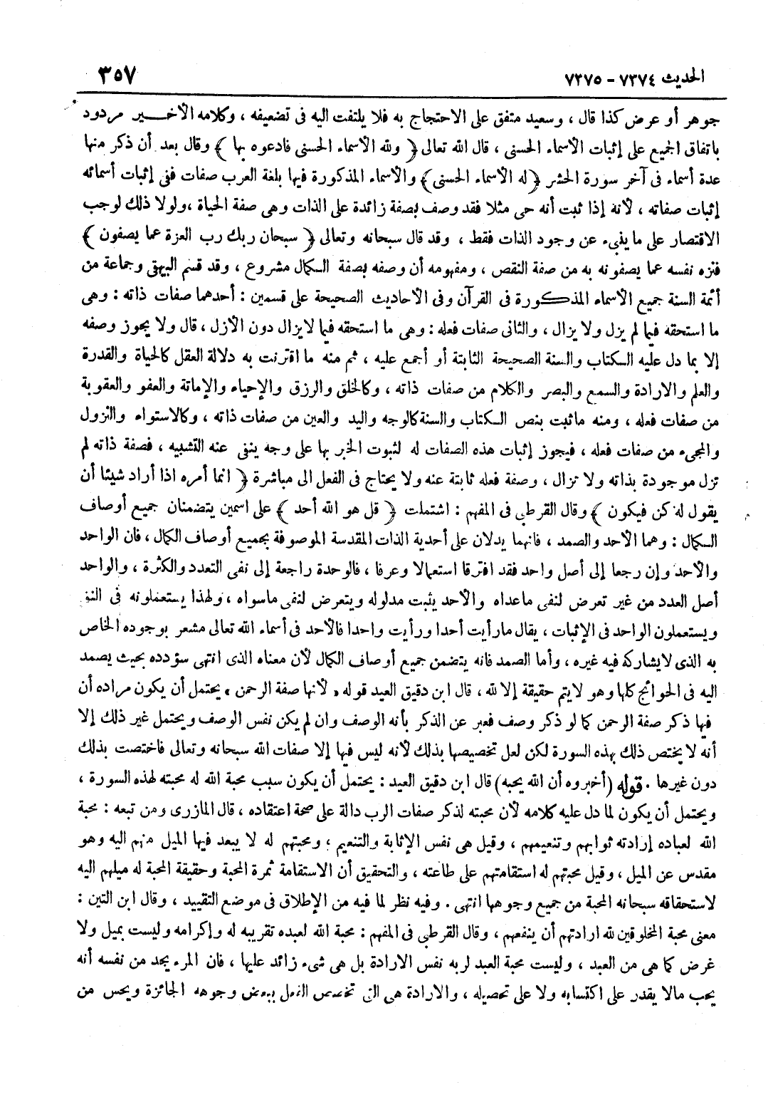 جَوْهَرٍ أَوْ عَرَضٍ كَذَا قَالَ وَسَعِيدٌ مُتَّفَقٌ عَلَى الِاحْتِجَاجِ بِهِ فَلَا يُلْتَفَتُ إِلَيْهِ فِي تَضْعِيفِهِ وَكَلَامُهُ الْأَخِيرُ مَرْدُودٌ بِاتِّفَاقِ الْجَمِيعِ عَلَى إِثْبَاتِ الْأَسْمَاءِ الْحُسْنَى قَالَ اللَّهُ تَعَالَى وَلِلَّهِ الْأَسْمَاء الْحسنى فَادعوهُ بهَا وَقَالَ بَعْدَ أَنْ ذَكَرَ مِنْهَا عِدَّةَ أَسْمَاءٍ فِي آخِرِ سُورَةِ الْحَشْرِ لَهُ الْأَسْمَاءُ الْحُسْنَى وَالْأَسْمَاءُ الْمَذْكُورَةُ فِيهَا بِلُغَةِ الْعَرَبِ صِفَاتٌ فَفِي إِثْبَاتِ أَسْمَائِهِ إِثْبَاتُ صِفَاتِهِ لِأَنَّهُ إِذَا ثَبَتَ أَنَّهُ حَيٌّ مَثَلًا فَقَدْ وُصِفَ بِصِفَةٍ زَائِدَةٍ عَلَى الذَّاتِ وَهِيَ صِفَةُ الْحَيَاةِ وَلَوْلَا ذَلِكَ لَوَجَبَ الِاقْتِصَارُ عَلَى مَا يُنْبِئُ عَنْ وُجُودِ الذَّات فَقَط وَقد قَالَ سُبْحَانَهُ وَتَعَالَى سُبْحَانَ رَبِّكَ رَبِّ الْعِزَّةِ عَمَّا يصفونَ فَنَزَّهَ نَفْسَهُ عَمَّا يَصِفُونَهُ بِهِ مِنْ صِفَةِ النَّقْصِ وَمَفْهُومُهُ أَنَّ وَصْفَهُ بِصِفَةِ الْكَمَالِ مَشْرُوعٌ وَقَدْ قَسَّمَ الْبَيْهَقِيُّ وَجَمَاعَةٌ مِنْ أَئِمَّةِ السُّنَّةِ جَمِيعَ الْأَسْمَاءِ الْمَذْكُورَةِ فِي الْقُرْآنِ وَفِي الْأَحَادِيثِ الصَّحِيحَةِ عَلَى قِسْمَيْنِ أَحَدُهُمَا صِفَاتُ ذَاتِهِ وَهِيَ مَا اسْتَحَقَّهُ فِيمَا لَمْ يَزَلْ وَلَا يَزَالُ وَالثَّانِي صِفَاتُ فِعْلِهِ وَهِيَ مَا اسْتَحَقَّهُ فِيمَا لَا يَزَالُ دُونَ الْأَزَلِ قَالَ وَلَا يَجُوزُ وَصْفُهُ إِلَّا بِمَا دَلَّ عَلَيْهِ الْكِتَابُ وَالسُّنَّةُ الصَّحِيحَةُ الثَّابِتَةُ أَوْ أُجْمِعَ عَلَيْهِ ثُمَّ مِنْهُ مَا اقْتَرَنَتْ بِهِ دَلَالَةُ الْعَقْلِ كَالْحَيَاةِ وَالْقُدْرَةِ وَالْعِلْمِ وَالْإِرَادَةِ وَالسَّمْعِ وَالْبَصَرِ وَالْكَلَامِ مِنْ صِفَاتِ ذَاتِهِ وَكَالْخَلْقِ وَالرِّزْقِ وَالْإِحْيَاءِ وَالْإِمَاتَةِ وَالْعَفْوِ وَالْعُقُوبَةِ مِنْ صِفَاتِ فِعْلِهِ وَمِنْهُ مَا ثَبَتَ بِنَصِّ الْكِتَابِ وَالسُّنَّةِ كَالْوَجْهِ وَالْيَدِ وَالْعَيْنِ مِنْ صِفَاتِ ذَاته وكا لِاسْتِوَاء وَالنُّزُولِ وَالْمَجِيءِ مِنْ صِفَاتِ فِعْلِهِ فَيَجُوزُ إِثْبَاتُ هَذِهِ الصِّفَاتِ لَهُ لِثُبُوتِ الْخَبَرِ بِهَا عَلَى وَجْهٍ يَنْفِي عَنْهُ التَّشْبِيهَ فَصِفَةُ ذَاتِهِ لَمْ تَزَلْ مَوْجُودَةً بِذَاتِهِ وَلَا تَزَالُ وَصِفَةُ فِعْلِهِ ثَابِتَةٌ عَنْهُ وَلَا يَحْتَاجُ فِي الْفِعْلِ إِلَى مُبَاشَرَةٍ إِنَّمَا أَمْرُهُ إِذَا أَرَادَ شَيْئًا أَنْ يَقُول لَهُ كن فَيكون وَقَالَ الْقُرْطُبِيُّ فِي الْمُفْهِمِ اشْتَمَلَتْ قُلْ هُوَ الله أحد عَلَى اسْمَيْنِ يَتَضَمَّنَانِ جَمِيعَ أَوْصَافِ الْكَمَالِ وَهُمَا الْأَحَدُ وَالصَّمَدُ فَإِنَّهُمَا يَدُلَّانِ عَلَى أَحَدِيَّةِ الذَّاتِ الْمُقَدَّسَةِ الْمَوْصُوفَةِ بِجَمِيعِ أَوْصَافِ الْكَمَالِ فَإِنَّ الْوَاحِدَ وَالْأَحَدَ وَإِنْ رَجَعَا إِلَى أَصْلٍ وَاحِدٍ فَقَدِ افْتَرَقَا اسْتِعْمَالًا وَعُرْفًا فَالْوَحْدَةُ رَاجِعَةٌ إِلَى نَفْيِ التَّعَدُّدِ وَالْكَثْرَةِ وَالْوَاحِدُ أَصْلُ الْعَدَدِ مِنْ غَيْرِ تَعَرُّضٍ لِنَفْيِ مَا عَدَاهُ وَالْأَحَدُ يَثْبُتُ مَدْلُولُهُ وَيَتَعَرَّضُ لِنَفْيِ مَا سِوَاهُ وَلِهَذَا يَسْتَعْمِلُونَهُ فِي النَّفْيِ وَيَسْتَعْمِلُونَ الْوَاحِدَ فِي الْإِثْبَاتِ يُقَالُ مَا رَأَيْتُ أَحَدًا وَرَأَيْتُ وَاحِدًا فَالْأَحَدُ فِي أَسْمَاءِ اللَّهِ تَعَالَى مُشْعِرٌ بِوُجُودِهِ الْخَاصِّ بِهِ الَّذِي لَا يُشَارِكُهُ فِيهِ غَيْرُهُ وَأَمَّا الصَّمَدُ فَإِنَّهُ يَتَضَمَّنُ جَمِيعَ أَوْصَافِ الْكَمَالِ لِأَنَّ مَعْنَاهُ الَّذِي انْتَهَى سُؤْدُدُهُ بِحَيْثُ يُصْمَدُ إِلَيْهِ فِي الْحَوَائِجِ كُلِّهَا وَهُوَ لَا يَتِ