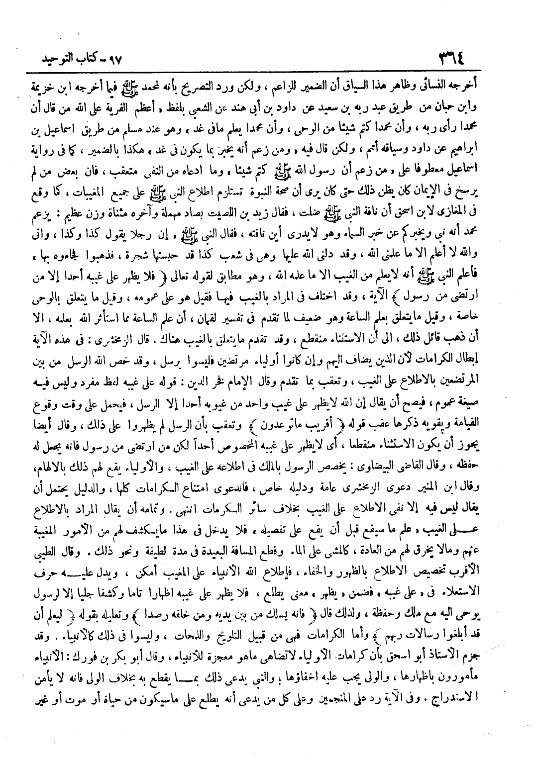 أَخْرَجَهُ النَّسَائِيُّ وَظَاهِرُ هَذَا السِّيَاقِ أَنَّ الضَّمِيرَ لِلزَّاعِمِ وَلَكِنْ وَرَدَ التَّصْرِيحُ بِأَنَّهُ لِمُحَمَّدٍ صَلَّى الله عَلَيْهِ وَسلم فِيمَا أخرجه بن خُزَيْمَة وبن حِبَّانَ مِنْ طَرِيقِ عَبْدِ رَبِّهِ بْنِ سَعِيدٍ عَنْ دَاوُدَ بْنِ أَبِي هِنْدٍ عَنِ الشَّعْبِيِّ بِلَفْظِ أَعْظَمَ الْفِرْيَةَ عَلَى اللَّهِ مَنْ قَالَ إِنَّ مُحَمَّدًا رَأَى رَبَّهُ وَإِنَّ مُحَمَّدًا كَتَمَ شَيْئًا مِنَ الْوَحْيِ وَإِنَّ مُحَمَّدًا يَعْلَمُ مَا فِي غَدٍ وَهُوَ عِنْدَ مُسْلِمٍ مِنْ طَرِيقِ إِسْمَاعِيلَ بْنِ إِبْرَاهِيمَ عَنْ دَاوُدَ وَسِيَاقُهُ أَتَمُّ وَلَكِنْ قَالَ فِيهِ وَمَنْ زَعَمَ أَنَّهُ يُخْبِرُ بِمَا يَكُونُ فِي غَدٍ هَكَذَا بِالضَّمِيرِ كَمَا فِي رِوَايَةِ إِسْمَاعِيلَ مَعْطُوفًا عَلَى مَنْ زَعَمَ أَنَّ رَسُولَ اللَّهِ صَلَّى اللَّهُ عَلَيْهِ وَسَلَّمَ كَتَمَ شَيْئًا وَمَا ادَّعَاهُ مِنَ النَّفْيِ مُتَعَقَّبٌ فَإِنَّ بَعْضَ مَنْ لَمْ يَرْسَخْ فِي الْإِيمَانِ كَانَ يَظُنُّ ذَلِكَ حَتَّى كَانَ يَرَى أَنَّ صِحَّةَ النُّبُوَّةِ تَسْتَلْزِمُ اطِّلَاعُ النَّبِيِّ صَلَّى اللَّهُ عَلَيْهِ وَسَلَّمَ عَلَى جَمِيعِ الْمُغَيَّبَاتِ كَمَا وَقَعَ فِي الْمَغَازِي لِابْنِ إِسْحَاقَ أَنَّ نَاقَةَ النَّبِيِّ صَلَّى اللَّهُ عَلَيْهِ وَسَلَّمَ ضَلَّتْ فَقَالَ زَيْدُ بْنُ اللَّصِيتِ بِصَادٍ مُهْمَلَةٍ وَآخِرُهُ مُثَنَّاةٌ وَزْنُ عَظِيمٍ يَزْعُمُ مُحَمَّدٌ أَنَّهُ نَبِيٌّ وَيُخْبِرُكُمْ عَنْ خَبَرِ السَّمَاءِ وَهُوَ لَا يَدْرِي أَيْنَ نَاقَتُهُ فَقَالَ النَّبِيُّ صَلَّى اللَّهُ عَلَيْهِ وَسَلَّمَ إِنَّ رَجُلًا يَقُولُ كَذَا وَكَذَا وَإِنِّي وَاللَّهِ لَا أَعْلَمُ إِلَّا مَا عَلَّمَنِي اللَّهُ وَقَدْ دَلَّنِي اللَّهُ عَلَيْهَا وَهِيَ فِي شِعْبِ كَذَا قَدْ حَبَسَتْهَا شَجَرَةٌ فَذَهَبُوا فَجَاءُوهُ بِهَا فَأَعْلَمَ النَّبِيُّ صَلَّى اللَّهُ عَلَيْهِ وَسَلَّمَ أَنَّهُ لَا يَعْلَمُ مِنَ الْغَيْبِ إِلَّا مَا عَلَّمَهُ اللَّهُ وَهُوَ مُطَابِقٌ لِقَوْلِهِ تَعَالَى فَلَا يُظْهِرُ عَلَى غَيْبِهِ أَحَدًا إِلَّا مَنِ ارتضى من رَسُول الْآيَةَ وَقَدِ اخْتُلِفَ فِي الْمُرَادِ بِالْغَيْبِ فِيهَا فَقِيلَ هُوَ عَلَى عُمُومِهِ وَقِيلَ مَا يَتَعَلَّقُ بِالْوَحْيِ خَاصَّةً وَقِيلَ مَا يَتَعَلَّقُ بِعِلْمِ السَّاعَةِ وَهُوَ ضَعِيفٌ لِمَا تَقَدَّمَ فِي تَفْسِيرِ لُقْمَانَ أَنَّ عِلْمَ السَّاعَةِ مِمَّا اسْتَأْثَرَ اللَّهُ بِعِلْمِهِ إِلَّا إِنْ ذَهَبَ قَائِلُ ذَلِكَ إِلَى أَنَّ الِاسْتِثْنَاءَ مُنْقَطِعٌ وَقَدْ تَقَدَّمَ مَا يَتَعَلَّقُ بِالْغَيْبِ هُنَاكَ قَالَ الزَّمَخْشَرِيُّ فِي هَذِهِ الْآيَةِ إِبْطَالُ الْكَرَامَاتِ لِأَنَّ الَّذِينَ يُضَافُ إِلَيْهِمْ وَإِنْ كَانُوا أَوْلِيَاءَ مُرْتَضِينَ فَلَيْسُوا بِرُسُلٍ وَقَدْ خَصَّ اللَّهُ الرُّسُل من بَين المرتضعين بِالِاطِّلَاعِ عَلَى الْغَيْبِ وَتُعُقِّبَ بِمَا تَقَدَّمَ وَقَالَ الْإِمَامُ فَخْرُ الدِّينِ قَوْلُهُ عَلَى غَيْبِهِ لَفْظٌ مُفْرَدٌ وَلَيْسَ فِيهِ صِيغَةُ عُمُومٍ فَيَصِحُّ أَنْ يُقَالَ إِنَّ اللَّهَ لَا يُظْهِرُ عَلَى غَيْبٍ وَاحِدٍ مِنْ غُيُوبِهِ أَحَدًا إِلَّا الرُّسُلَ فَيُحْمَلُ عَلَى وَقْتِ وُقُوعِ الْقِيَامَةِ وَيُقَوِّيهِ ذِكْرُهَا عَقِبَ قَوْله اقريب مَا توعدون وَتُعُقِّبَ بِأَنَّ الرُّسُلَ لَمْ يَظْهَرُوا عَلَى ذَلِكَ وَقَالَ أَيْضًا يَجُوزُ أَنْ يَكُونَ الِاسْتِثْنَاءُ مُنْقَطِعًا أَيْ لَا يُظْهِرُ عَلَى غَيْبِهِ الْمَخْصُوصِ أَحَدًا لَكِنْ مَنِ ارْتَضَى مِنْ رَسُولٍ فَإِنَّهُ يَجْعَلُ لَهُ حِفْظَهُ وَقَالَ الْقَاضِي الْبَيْضَاوِيُّ يُخَصَّصُ الرَّسُولُ بِالْمَلَكِ فِي اطِّلَاعِهِ عَلَى الْغَيْ