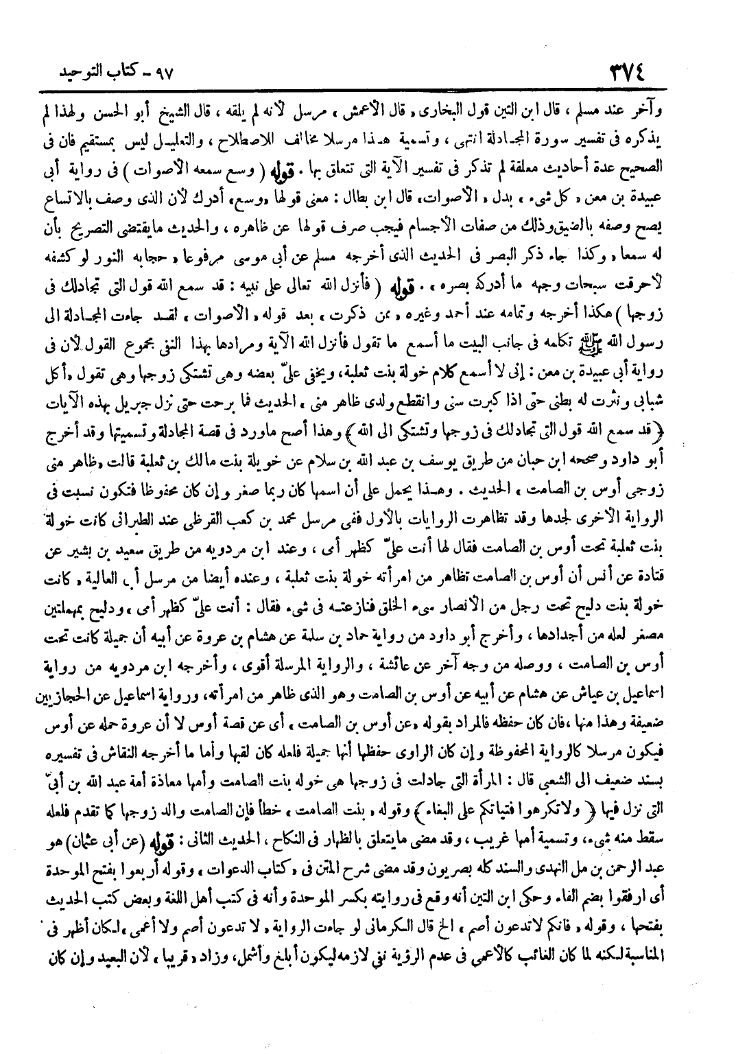 وَآخر عِنْد مُسلم قَالَ بن التِّينِ قَوْلُ الْبُخَارِيِّ قَالَ الْأَعْمَشُ مُرْسَلٌ لِأَنَّهُ لَمْ يَلْقَهُ قَالَ الشَّيْخُ أَبُو الْحَسَنِ وَلِهَذَا لَمْ يَذْكُرْهُ فِي تَفْسِيرِ سُورَةِ الْمُجَادَلَةِ انْتَهَى وَتَسْمِيَةُ هَذَا مُرْسَلًا مُخَالِفٌ لِلِاصْطِلَاحِ وَالتَّعْلِيلُ لَيْسَ بِمُسْتَقِيمٍ فَإِنَّ فِي الصَّحِيحِ عِدَّةُ أَحَادِيثَ مُعَلَّقَةٍ لَمْ تُذْكَرْ فِي تَفْسِيرِ الْآيَةِ الَّتِي تَتَعَلَّقُ بِهَا قَوْلُهُ وَسِعَ سَمْعُهُ الْأَصْوَاتَ فِي رِوَايَةِ أَبِي عُبَيْدَةَ بْنِ مَعْنٍ كُلَّ شَيْءٍ بَدَلَ الْأَصْوَات قَالَ بن بَطَّالٍ مَعْنَى قَوْلِهَا وَسِعَ أَدْرَكَ لِأَنَّ الَّذِي وُصِفَ بِالِاتِّسَاعِ يَصِحُّ وَصْفُهُ بِالضِّيقِ وَذَلِكَ مِنْ صِفَاتِ الْأَجْسَامِ فَيَجِبُ صَرْفُ قَوْلِهَا عَنْ ظَاهِرِهِ وَالْحَدِيثُ مَا يَقْتَضِي التَّصْرِيحَ بِأَنَّ لَهُ سَمْعًا وَكَذَا جَاءَ ذِكْرُ الْبَصَرِ فِي الْحَدِيثِ الَّذِي أَخْرَجَهُ مُسْلِمٌ عَنْ أَبِي مُوسَى مَرْفُوعًا حِجَابُهُ النُّورُ لَوْ كَشَفَهُ لَأَحْرَقَتْ سُبُحَاتُ وَجْهِهِ مَا أَدْرَكَهُ بَصَرُهُ قَوْلُهُ فَأَنْزَلَ اللَّهُ تَعَالَى عَلَى نَبِيِّهِ قَدْ سَمِعَ اللَّهُ قَوْلَ الَّتِي تُجَادِلُكَ فِي زَوجهَا هَكَذَا أَخْرَجَهُ وَتَمَامُهُ عِنْدَ أَحْمَدَ وَغَيْرِهِ مِمَّنْ ذَكَرْتُ بَعْدَ قَوْلِهِ الْأَصْوَاتَ لَقَدْ جَاءَتِ الْمُجَادِلَةُ إِلَى رَسُولِ اللَّهِ صَلَّى اللَّهُ عَلَيْهِ وَسَلَّمَ تُكَلِّمُهُ فِي جَانِبِ الْبَيْتِ مَا أَسْمَعُ مَا تَقُولُ فَأَنْزَلَ اللَّهُ الْآيَةَ وَمُرَادُهَا بِهَذَا النَّفْيِ مَجْمُوعُ الْقَوْلِ لِأَنَّ فِي رِوَايَةِ أَبِي عُبَيْدَةَ بن معن اني لاأسمع كَلَامَ خَوْلَةَ بِنْتِ ثَعْلَبَةَ وَيَخْفَى عَلَيَّ بَعْضُهُ وَهِيَ تَشْتَكِي زَوْجَهَا وَهِيَ تَقُولُ أَكَلَ شَبَابِي وَنَثَرْتُ لَهُ بَطْنِي حَتَّى إِذَا كَبِرَتْ سِنِّي وَانْقَطَعَ وَلَدِي ظَاهَرَ مِنِّي الْحَدِيثَ فَمَا بَرِحَتْ حَتَّى نَزَلَ جِبْرِيلُ بِهَذِهِ الْآيَاتِ قَدْ سَمِعَ اللَّهُ قَوْلَ الَّتِي تُجَادِلُكَ فِي زَوْجِهَا وَتَشْتَكِي إِلَى الله وَهَذَا أَصَحُّ مَا وَرَدَ فِي قِصَّةِ الْمُجَادِلَةِ وتسميتها وَقد أخرج أَبُو دَاوُد وَصَححهُ بن حِبَّانَ مِنْ طَرِيقِ يُوسُفَ بْنِ عَبْدِ اللَّهِ بْنِ سَلَامٍ عَنْ خُوَيْلَةَ بِنْتِ مَالِكِ بْنِ ثَعْلَبَةَ قَالَتْ ظَاهَرَ مِنِّي زَوْجِي أَوْسُ بْنُ الصَّامِتِ الْحَدِيثَ وَهَذَا يُحْمَلُ عَلَى أَنَّ اسْمَهَا كَانَ رُبمَا صغر وان كَانَ مَحْفُوظًا فَتَكُونُ نُسِبَتْ فِي الرِّوَايَةِ الْأُخْرَى لِجَدِّهَا وَقَدْ تَظَاهَرَتِ الرِّوَايَاتُ بِالْأَوَّلِ فَفِي مُرْسَلِ مُحَمَّدِ بْنِ كَعْبٍ الْقُرَظِيِّ عِنْدَ الطَّبَرَانِيِّ كَانَتْ خَوْلَةُ بِنْتُ ثَعْلَبَةَ تَحْتَ أَوْسِ بْنِ الصَّامِتِ فَقَالَ لَهَا أَنْت عَليّ كَظهر أُمِّي وَعند بن مَرْدَوَيْهِ مِنْ طَرِيقِ سَعِيدِ بْنِ بَشِيرٍ عَنْ قَتَادَةَ عَنْ أَنَسٍ أَنَّ أَوْسَ بْنَ الصَّامِتِ تَظَاهَرَ مِنَ امْرَأَتِهِ خَوْلَةَ بِنْتِ ثَعْلَبَةَ وَعِنْدَهُ أَيْضًا مِنْ مُرْسَلِ أَبِي الْعَالِيَةَ كَانَتْ خَوْلَةُ بِنْتُ دُلَيْحٍ تَحْتَ رَجُلٍ مِنَ الْأَنْصَارِ سَيِّئِ الْخُلُقِ فَنَازَعَتْهُ فِي شَيْءٍ فَقَالَ أَنْتِ عَلَيَّ كَظَهْرِ أُمِّي وَدُلَيْحٌ بِمُهْمَلَتَيْنِ مُصَغَّرٌ لَعَلَّهُ مِنْ أَجْدَادِهَا وَأَخْرَجَ أَبُو دَاوُدَ مِنْ رِوَايَةِ حَمَّادِ بْنِ سَلَمَةَ عَنْ هِشَامِ بْنِ عُرْوَةَ عَنْ أَبِيهِ أَنَّ جَمِيلَةَ كَانَتْ تَحْتَ أَوْسِ بْنِ الصَّامِتِ وَوَصَلَهُ مِنْ وَجْهٍ آخَرَ عَنْ عَائِشَةَ وَالرِّوَايَة الْمُرْسلَة أقوى وَأخرجه بن مَرْدَوَيْهِ مِنْ رِوَايَةِ إِسْمَاعِيلَ بْنِ عَيَّاش