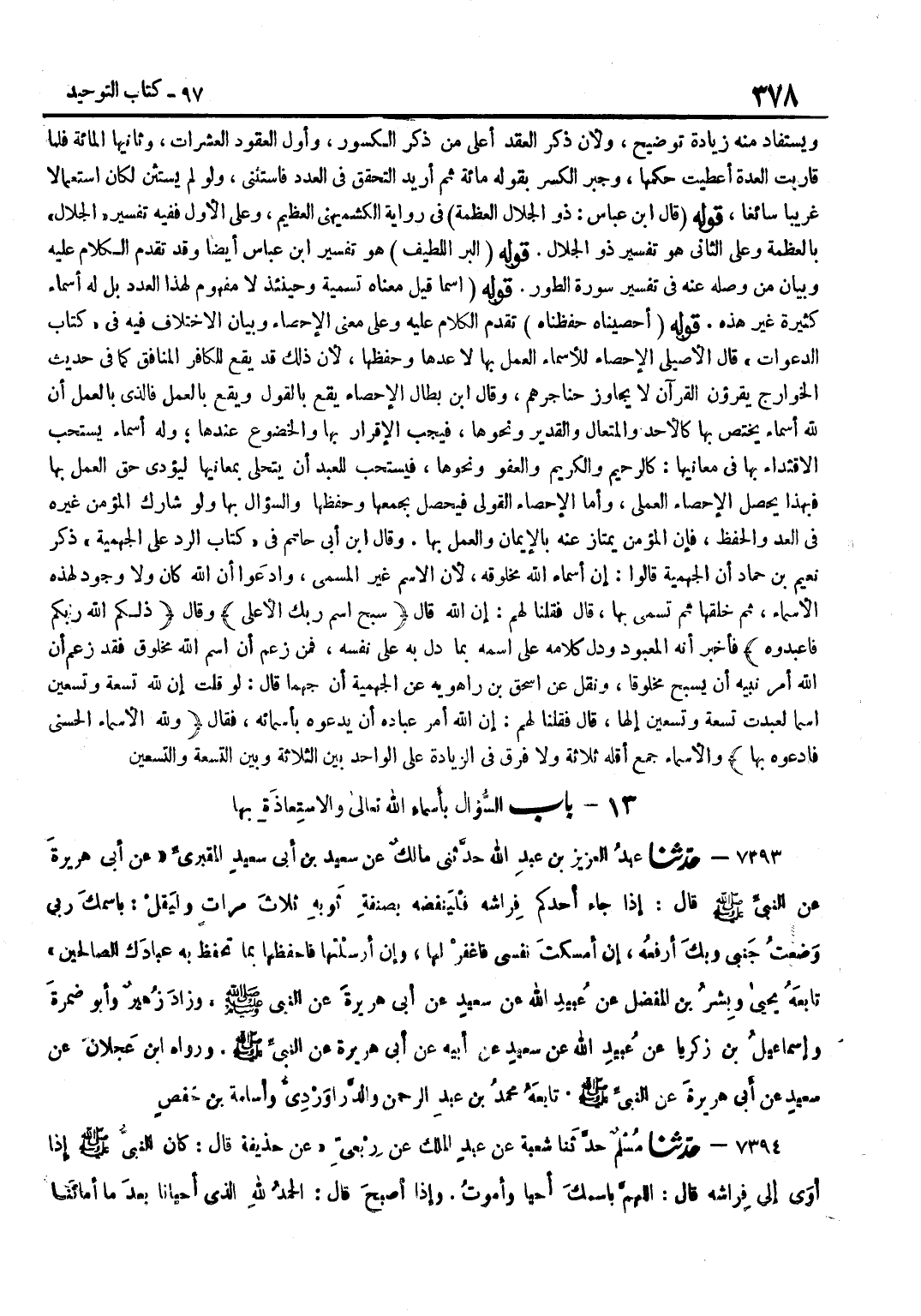 وَيُسْتَفَادُ مِنْهُ زِيَادَةُ تَوْضِيحٍ وَلِأَنَّ ذِكْرَ الْعَقْدِ أَعْلَى مِنْ ذِكْرِ الْكُسُورِ وَأَوَّلُ الْعُقُودِ الْعَشَرَاتُ وَثَانِيهَا الْمِائَةُ فَلَمَّا قَارَبَتِ الْعِدَّةَ أُعْطِيَتْ حُكْمَهَا وجبر الْكسر بقوله مائَة ثمَّ أُرِيد التَّحَقُّقَ فِي الْعَدَدِ فَاسْتَثْنَى وَلَوْ لَمْ يَسْتَثْنِ لَكَانَ اسْتِعْمَالا غَرِيبا سائغا قَوْله قَالَ بن عَبَّاسٍ ذُو الْجَلَالِ الْعَظَمَةِ فِي رِوَايَةِ الْكُشْمِيهَنِيِّ الْعَظِيمِ وَعَلَى الْأَوَّلِ فَفِيهِ تَفْسِيرُ الْجَلَالِ بِالْعَظَمَةِ وَعَلَى الثَّانِي هُوَ تَفْسِيرُ ذُو الْجَلَالِ قَوْلُهُ الْبر اللَّطِيف هُوَ تَفْسِير بن عَبَّاسٍ أَيْضًا وَقَدْ تَقَدَّمَ الْكَلَامُ عَلَيْهِ وَبَيَانُ مَنْ وَصَلَهُ عَنْهُ فِي تَفْسِيرِ سُورَةِ الطُّورِ قَوْلُهُ اسْمًا قِيلَ مَعْنَاهُ تَسْمِيَةً وَحِينَئِذٍ لَا مَفْهُومَ لِهَذَا الْعَدَدِ بَلْ لَهُ أَسْمَاءٌ كَثِيرَةٌ غَيْرُ هَذِهِ قَوْلُهُ أَحْصَيْنَاهُ حَفِظْنَاهُ تَقَدَّمَ الْكَلَامُ عَلَيْهِ وَعَلَى مَعْنَى الْإِحْصَاءِ وَبَيَانُ الِاخْتِلَافِ فِيهِ فِي كِتَابِ الدَّعَوَاتِ قَالَ الْأَصِيلِيُّ الْإِحْصَاءُ لِلْأَسْمَاءِ الْعَمَلُ بِهَا لَا عَدَّهَا وَحِفْظَهَا لِأَنَّ ذَلِكَ قَدْ يَقَعُ لِلْكَافِرِ الْمُنَافِقِ كَمَا فِي حَدِيثِ الْخَوَارِج يقرؤون الْقُرْآن لَا يُجَاوز حَنَاجِرهمْ وَقَالَ بن بَطَّالٍ الْإِحْصَاءُ يَقَعُ بِالْقَوْلِ وَيَقَعُ بِالْعَمَلِ فَالَّذِي بِالْعَمَلِ أَنَّ لِلَّهِ أَسْمَاءً يَخْتَصُّ بِهَا كَالْأَحَدِ وَالْمُتَعَالِ وَالْقَدِيرِ وَنَحْوِهَا فَيَجِبُ الْإِقْرَارُ بِهَا وَالْخُضُوعُ عِنْدَهَا وَلَهُ أَسْمَاءٌ يُسْتَحَبُّ الِاقْتِدَاءُ بِهَا فِي مَعَانِيهَا كَالرَّحِيمِ وَالْكَرِيمِ وَالْعَفُوِّ وَنَحْوِهَا فَيُسْتَحَبُّ لِلْعَبْدِ أَنْ يَتَحَلَّى بِمَعَانِيهَا لِيُؤَدِّيَ حَقَّ الْعَمَلِ بِهَا فَبِهَذَا يَحْصُلُ الْإِحْصَاءُ الْعَمَلِيُّ وَأَمَّا الْإِحْصَاءُ الْقَوْلِيُّ فَيَحْصُلُ بِجَمْعِهَا وَحِفْظِهَا وَالسُّؤَالِ بِهَا وَلَوْ شَارَكَ الْمُؤْمِنَ غَيْرُهُ فِي الْعَدِّ وَالْحِفْظِ فَإِنَّ الْمُؤْمِنَ يمتاز عَنهُ بِالْإِيمَان وَالْعَمَل بهَا وَقَالَ بن أَبِي حَاتِمٍ فِي كِتَابِ الرَّدِّ عَلَى الْجَهْمِيَّةِ ذَكَرَ نُعَيْمُ بْنُ حَمَّادٍ أَنَّ الْجَهْمِيَّةَ قَالُوا إِنَّ أَسْمَاءَ اللَّهِ مَخْلُوقَةٌ لِأَنَّ الِاسْمَ غَيْرُ الْمُسَمَّى وَادَّعَوْا أَنَّ اللَّهَ كَانَ وَلَا وُجُودَ لِهَذِهِ الْأَسْمَاءِ ثُمَّ خَلَقَهَا ثُمَّ تَسَمَّى بِهَا قَالَ فَقُلْنَا لَهُمْ إِنَّ اللَّهَ قَالَ سَبِّحِ اسْم رَبك الْأَعْلَى وَقَالَ ذَلِكُم الله ربكُم فاعبدوه فَأَخْبَرَ أَنَّهُ الْمَعْبُودُ وَدَلَّ كَلَامُهُ عَلَى اسْمِهِ بِمَا دَلَّ بِهِ عَلَى نَفْسِهِ فَمَنْ زَعَمَ أَنَّ اسْمَ اللَّهِ مَخْلُوقٌ فَقَدْ زَعَمَ أَنَّ اللَّهَ أَمَرَ نَبِيَّهُ أَنْ يُسَبِّحَ مَخْلُوقًا وَنُقِلَ عَن إِسْحَاق بن رَاهْوَيْهِ عَنِ الْجَهْمِيَّةِ أَنَّ جَهْمًا قَالَ لَوْ قُلْتُ إِنَّ لِلَّهِ تِسْعَةً وَتِسْعِينَ اسْمًا لَعَبَدْتَ تِسْعَةً وَتِسْعِينَ إِلَهًا قَالَ فَقُلْنَا لَهُمْ إِنَّ اللَّهَ أَمَرَ عِبَادَهُ أَنْ يَدْعُوَهُ بِأَسْمَائِهِ فَقَالَ وَللَّه الْأَسْمَاء الْحسنى فَادعوهُ بهَا وَالْأَسْمَاءُ جَمْعُ أَقَلُّهُ ثَلَاثَةٌ وَلَا فَرْقَ فِي الزِّيَادَةِ عَلَى الْوَاحِدِ بَيْنَ الثَّلَاثَةِ وَبَيْنَ التِّسْعَةِ وَالتسْعين