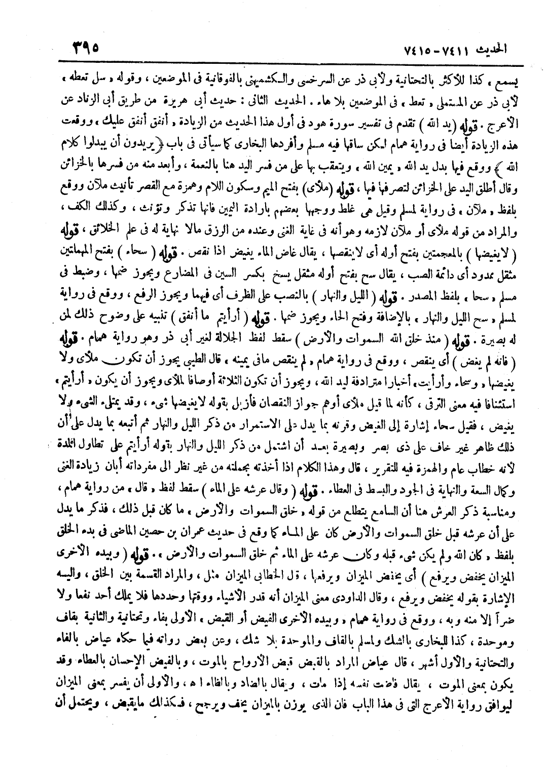 [7411] قَوْلُهُ يَدُ اللَّهِ تَقَدَّمَ فِي تَفْسِيرِ سُورَةِ هُودٍ فِي أَوَّلِ هَذَا الْحَدِيثِ مِنَ الزِّيَادَةِ أَنْفِقْ أُنْفِقْ عَلَيْكَ وَوَقَعَتْ هَذِهِ الزِّيَادَةُ أَيْضًا فِي رِوَايَةِ هَمَّامٍ لَكِنْ سَاقَهَا فِيهِ مُسْلِمٌ وَأَفْرَدَهَا الْبُخَارِيُّ كَمَا سَيَأْتِي فِي بَابِ يُرِيدُونَ ان يبدلوا كَلَام الله وَوَقَعَ فِيهَا بَدَلَ يَدُ اللَّهِ يَمِينُ اللَّهِ وَيُتَعَقَّبُ بِهَا عَلَى مَنْ فَسَّرَ الْيَدَ هُنَا بِالنِّعْمَةِ وَأَبْعَدُ مِنْهُ مَنْ فَسَّرَهَا بِالْخَزَائِنِ وَقَالَ أَطْلَقَ الْيَدَ عَلَى الْخَزَائِنِ لِتَصَرُّفِهَا فِيهَا قَوْلُهُ مَلْأَى بِفَتْحِ الْمِيمِ وَسُكُونِ اللَّامِ وَهَمْزَةٍ مَعَ الْقَصْرِ تَأْنِيثُ مَلْآنَ وَوَقَعَ بِلَفْظِ مَلْآنَ فِي رِوَايَةٍ لِمُسْلِمٍ وَقِيلَ هِيَ غَلَطٌ وَوَجَّهَهَا بَعْضُهُمْ بِإِرَادَةِ الْيَمِينِ فَإِنَّهَا تُذَكَّرُ وَتُؤَنَّثُ وَكَذَلِكَ الْكَفُّ وَالْمُرَادُ مِنْ قَوْلِهِ مَلْأَى أَوْ مَلْآنَ لَازِمُهُ وَهُوَ أَنَّهُ فِي غَايَةِ الْغِنَى وَعِنْدَهُ مِنَ الرزق مَالا نِهَايَةَ لَهُ فِي عِلْمِ الْخَلَائِقِ قَوْلُهُ لَا يَغِيضُهَا بِالْمُعْجَمَتَيْنِ بِفَتْحِ أَوَّلِهِ أَيْ لَا يُنْقِصُهَا يُقَالُ غَاضَ الْمَاءُ يَغِيضُ إِذَا نَقَصَ قَوْلُهُ سَحَّاءُ بِفَتْحِ الْمُهْمَلَتَيْنِ مُثَقَّلٌ مَمْدُودٌ أَيْ دَائِمَةُ الصَّبِّ يُقَالُ سَحَّ بِفَتْحِ أَوَّلِهِ مُثَقَّلٌ يَسِحُّ بِكَسْرِ السِّينِ فِي الْمُضَارِعِ وَيَجُوزُ ضَمُّهَا وَضُبِطَ فِي مُسْلِمٍ سَحًّا بِلَفْظِ الْمَصْدَرِ قَوْلُهُ اللَّيْلَ وَالنَّهَارَ بِالنَّصْبِ عَلَى الظَّرْفِ أَيْ فِيهِمَا وَيَجُوزُ الرَّفْعُ وَوَقَعَ فِي رِوَايَةٍ لِمُسْلِمٍ سَحَّ اللَّيْلُ وَالنَّهَارُ بِالْإِضَافَةِ وَفَتْحِ الْحَاءِ وَيَجُوزُ ضَمُّهَا قَوْلُهُ أَرَأَيْتُمْ مَا أَنْفَقَ تَنْبِيهٌ عَلَى وُضُوحِ ذَلِكَ لِمَنْ لَهُ بَصِيرَةٌ قَوْلُهُ مُنْذُ خَلَقَ اللَّهُ السَّمَاوَاتِ وَالْأَرْضَ سَقَطَ لَفْظُ الْجَلَالَةِ لِغَيْرِ أَبِي ذَرٍّ وَهُوَ رِوَايَةُ هَمَّامٍ قَوْلُهُ فَإِنَّهُ لَمْ يَغِضْ أَيْ يَنْقُصْ وَوَقَعَ فِي رِوَايَةِ هَمَّامٍ لَمْ يَنْقُصْ مَا فِي يَمِينِهِ قَالَ الطِّيبِيُّ يَجُوزُ أَنْ تَكُونَ مَلْأَى وَلَا يَغِيضُهَا وَسَحَّاءُ وَأَرَأَيْتَ أَخْبَارًا مُتَرَادِفَةً لِيَدِ اللَّهِ وَيَجُوزُ أَنْ تَكُونَ الثَّلَاثَةُ أَوْصَافًا لِمَلْأَى وَيَجُوزُ أَنْ يَكُونَ أَرَأَيْتُمْ اسْتِئْنَافًا فِيهِ مَعْنَى التَّرَقِّي كَأَنَّهُ لَمَّا قيل ملأى أَو هم جَوَازَ النُّقْصَانِ فَأُزِيلَ بِقَوْلِهِ لَا يَغِيضُهَا شَيْءٌ وَقَدْ يَمْتَلِئُ الشَّيْءُ وَلَا يَغِيضُ فَقِيلَ سَحَّاءُ إِشَارَةٌ إِلَى الْغَيْضِ وَقَرَنَهُ بِمَا يَدُلُّ عَلَى الِاسْتِمْرَارِ مِنْ ذِكْرِ اللَّيْلِ وَالنَّهَارِ ثُمَّ أَتْبَعَهُ بِمَا يَدُلُّ عَلَى أَنَّ ذَلِكَ ظَاهِرٌ غَيْرُ خَافٍ عَلَى ذِي بَصَرٍ وَبَصِيرَةٍ بَعْدَ أَنِ اشْتَمَلَ مِنْ ذِكْرِ اللَّيْلِ وَالنَّهَارِ بِقَوْلِهِ أَرَأَيْتُمْ عَلَى تَطَاوُلِ الْمُدَّةِ لِأَنَّهُ خِطَابٌ عَامٌّ وَالْهَمْزَةُ فِيهِ لِلتَّقْرِيرِ قَالَ وَهَذَا الْكَلَامُ إِذَا أَخَذْتَهُ بِجُمْلَتِهِ مِنْ غَيْرِ نَظَرٍ إِلَى مُفْرَدَاتِهِ أَبَانَ زِيَادَةَ الْغِنَى وَكَمَالَ السَّعَةِ وَالنِّهَايَةَ فِي الْجُودِ وَالْبَسْطَ فِي الْعَطَاءِ قَوْلُهُ وَقَالَ عَرْشُهُ عَلَى الْمَاءِ سَقَطَ لَفْظُ قَالَ مِنْ رِوَايَةِ هَمَّامٍ وَمُنَاسَبَةُ ذِكْرِ الْعَرْشِ هُنَا أَنَّ السَّامِعَ يَتَطَلَّعُ مِنْ قَوْلِهِ خَلَقَ السَّمَاوَاتِ وَالْأَرْضَ مَا كَانَ قَبْلَ ذَلِكَ فَذَكَرَ مَا يَدُلُّ عَلَى أَنَّ عَرْشه قبل خلق السَّمَاوَات وَالْأَرْض كَانَ عَلَى ال