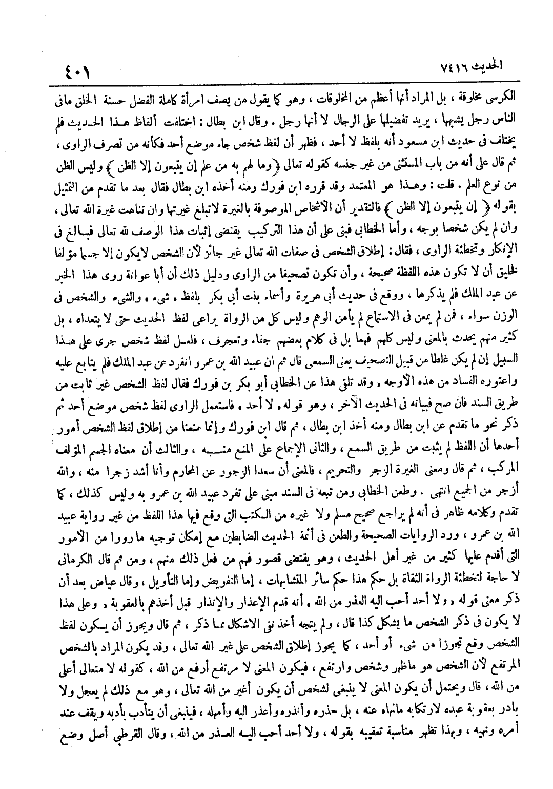 الْكُرْسِيِّ مَخْلُوقَةٌ بَلِ الْمُرَادُ أَنَّهَا أَعْظَمُ مِنَ الْمَخْلُوقَاتِ وَهُوَ كَمَا يَقُولُ مَنْ يَصِفُ امْرَأَةً كَامِلَةً الْفَضْلِ حَسَنَةُ الْخَلْقِ مَا فِي النَّاسِ رَجُلٌ يُشْبِهُهَا يُرِيدُ تَفْضِيلَهَا عَلَى الرِّجَالِ لَا انها رجل وَقَالَ بن بَطَّالٍ اخْتَلَفَتْ أَلْفَاظُ هَذَا الْحَدِيثِ فَلَمْ يُخْتَلَفْ فِي حَدِيث بن مَسْعُودٍ أَنَّهُ بِلَفْظِ لَا أَحَدَ فَظَهَرَ أَنَّ لَفْظَ شَخْصَ جَاءَ مَوْضِعَ أَحَدَ فَكَأَنَّهُ مِنْ تَصَرُّفِ الرَّاوِي ثُمَّ قَالَ عَلَى أَنَّهُ مِنْ بَاب الْمُسْتَثْنى من غير جنسه قَوْله تَعَالَى وَمَا لَهُمْ بِهِ مِنْ عِلْمٍ إِنْ يتبعُون الا الظَّن وَلَيْسَ الظَّنُّ مِنْ نَوْعِ الْعِلْمِ قُلْتُ وَهَذَا هُوَ الْمُعْتَمد وَقد قَرَّرَهُ بن فورك وَمِنْه اخذه بن بطال فَقَالَ بعد مَا تَقَدَّمَ مِنَ التَّمْثِيلِ بِقَوْلِهِ إِنْ يَتَّبِعُونَ إِلَّا الظَّن فَالتَّقْدِيرُ أَنَّ الْأَشْخَاصَ الْمَوْصُوفَةَ بِالْغَيْرَةِ لَا تَبْلُغُ غَيْرَتُهَا وَإِنْ تَنَاهَتْ غَيْرَةَ اللَّهِ تَعَالَى وَإِنْ لَمْ يَكُنْ شَخْصًا بِوَجْهٍ وَأَمَّا الْخَطَّابِيُّ فَبَنَى عَلَى أَنَّ هَذَا التَّرْكِيبَ يَقْتَضِي إِثْبَاتَ هَذَا الْوَصْفِ لِلَّهِ تَعَالَى فَبَالَغَ فِي الْإِنْكَارِ وَتَخْطِئَةِ الرَّاوِي فَقَالَ إِطْلَاقُ الشَّخْصِ فِي صِفَاتِ اللَّهِ تَعَالَى غير جَائِز لأنة الشَّخْصَ لَا يَكُونُ إِلَّا جِسْمًا مُؤَلَّفًا فَخَلِيقٌ أَنْ لَا تَكُونَ هَذِهِ اللَّفْظَةُ صَحِيحَةً وَأَنْ تَكُونَ تَصْحِيفًا مِنَ الرَّاوِي وَدَلِيلٌ ذَلِكَ أَنَّ أَبَا عَوَانَةَ رَوَى هَذَا الْخَبَرَ عَنْ عَبْدِ الْمَلِكِ فَلَمْ يَذْكُرْهَا وَوَقَعَ فِي حَدِيثِ أَبِي هُرَيْرَةَ وَأَسْمَاءَ بِنْتِ أَبِي بَكْرٍ بِلَفْظِ شَيْءَ وَالشَّيْءُ وَالشَّخْصُ فِي الْوَزْنِ سَوَاءٌ فَمَنْ لَمْ يُمْعِنْ فِي الِاسْتِمَاعِ لَمْ يَأْمَنِ الْوَهْمَ وَلَيْسَ كُلٌّ مِنَ الرُّوَاةِ يُرَاعِي لَفْظَ الْحَدِيثِ حَتَّى لَا يَتَعَدَّاهُ بَلْ كَثِيرٌ مِنْهُمْ يُحَدِّثُ بِالْمَعْنَى وَلَيْسَ كُلُّهُمْ فَهِمًا بَلْ فِي كَلَامِ بَعْضِهِمْ جَفَاءٌ وَتَعَجْرُفٌ فَلَعَلَّ لَفْظَ شَخْصَ جَرَى عَلَى هَذَا السَّبِيلِ إِنْ لَمْ يَكُنْ غَلَطًا مِنْ قَبِيلِ التَّصْحِيفِ يَعْنِي السَّمْعِيَّ قَالَ ثُمَّ إِنَّ عُبَيْدَ اللَّهِ بْنَ عَمْرٍو انْفَرَدَ عَنْ عَبْدِ الْمَلِكِ فَلَمْ يُتَابَعْ عَلَيْهِ وَاعْتَوَرَهُ الْفَسَادُ مِنْ هَذِهِ الْأَوْجُهِ وَقَدْ تَلَقَّى هَذَا عَنِ الْخَطَّابِيِّ أَبُو بَكْرِ بْنُ فَوْرَكٍ فَقَالَ لَفْظُ الشَّخْصِ غَيْرُ ثَابِتٍ مِنْ طَرِيقِ السَّنَدِ فَإِنْ صَحَّ فَبَيَانُهُ فِي الْحَدِيثِ الْآخَرِ وَهُوَ قَوْلُهُ لَا أَحَدَ فَاسْتَعْمَلَ الرَّاوِي لَفْظَ شَخْصَ مَوْضِعَ أَحَدَ ثمَّ ذكر نَحْو مَا تقدم عَن بن بطال وَمِنْه اخذ بن بطال ثمَّ قَالَ بن فَوْرَكٍ وَإِنَّمَا مَنَعَنَا مِنْ إِطْلَاقِ لَفْظِ الشَّخْصِ أُمُورٌ أَحَدُهَا أَنَّ اللَّفْظَ لَمْ يَثْبُتْ مِنْ طَرِيقِ السَّمْعِ وَالثَّانِي الْإِجْمَاعُ عَلَى الْمَنْعِ مِنْهُ وَالثَّالِثُ أَنَّ مَعْنَاهُ الْجِسْمُ الْمُؤَلَّفُ الْمُرَكَّبُ ثُمَّ قَالَ وَمَعْنَى الْغَيْرَةِ الزَّجْرُ وَالتَّحْرِيمُ فَالْمَعْنَى أَنَّ سَعْدًا الزَّجُورُ عَنِ الْمَحَارِمِ وَأَنَا أَشَدُّ زَجْرًا مِنْهُ وَاللَّهُ أَزْجَرُ مِنَ الْجَمِيعِ انْتَهَى وَطَعْنُ الْخَطَّابِيِّ وَمَنْ تَبِعَهُ فِي السَّنَدِ مَبْنِيٌّ عَلَى تَفَرُّدِ عُبَيْدِ اللَّهِ بْنِ عَمْرٍو بِهِ وَلَيْسَ كَذَلِكَ كَمَا تَقَدَّمَ وَكَلَامُهُ ظَاهِرٌ فِي أَنَّهُ لَمْ يُرَاجِعْ صَحِيحَ مُسْلِمٍ وَلَا غَيْرَهُ مِنَ الْكُتُبِ الَّتِي وَقَعَ فِيهَا هَذَا اللَّفْظُ مِنْ غَيْرِ رِوَايَ